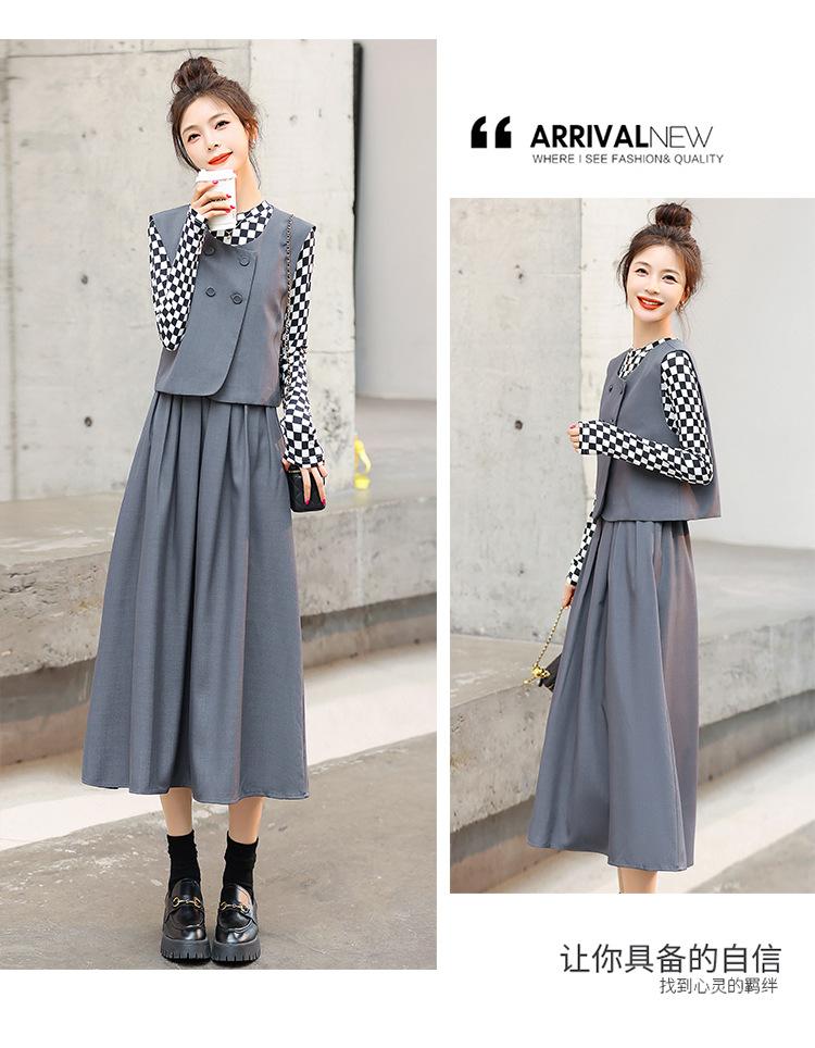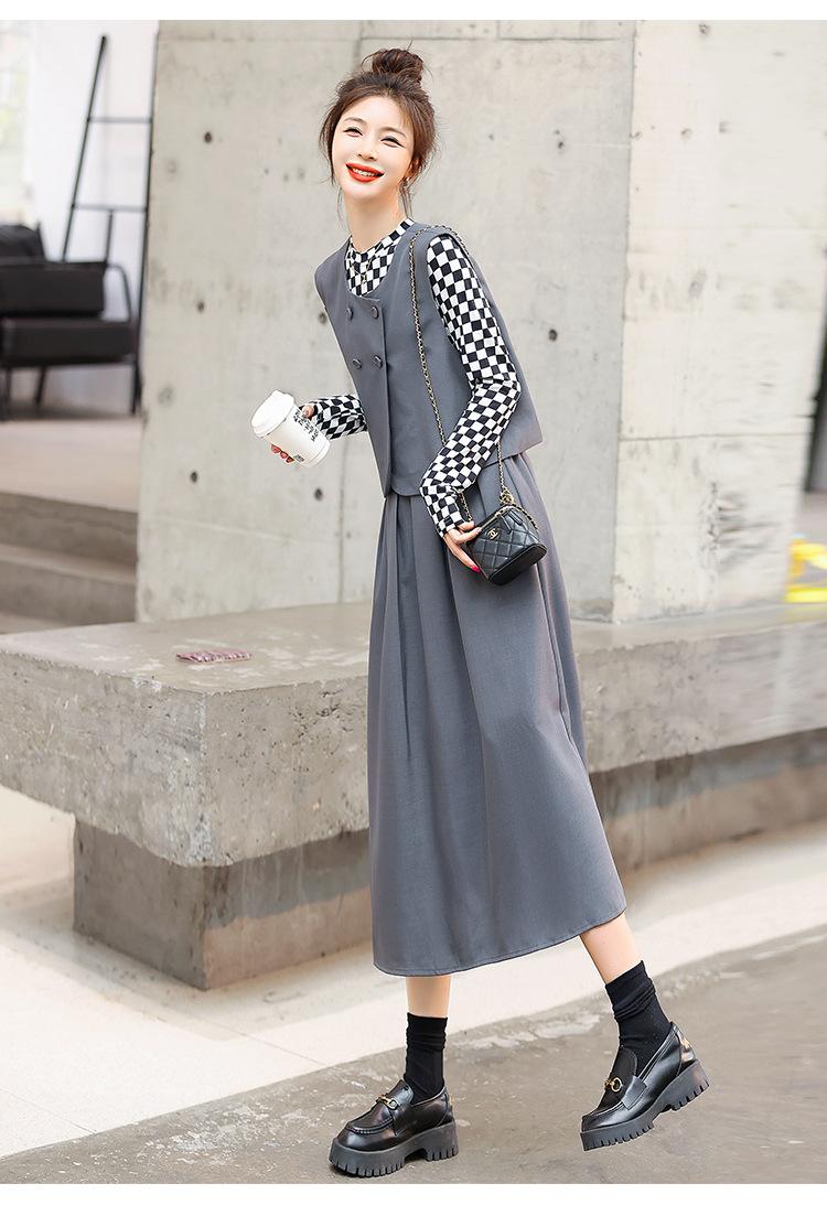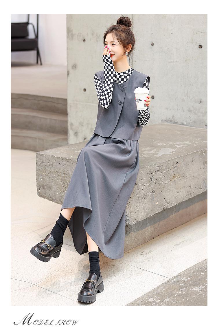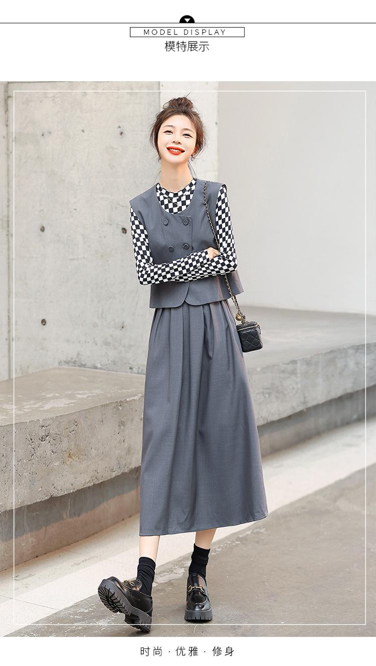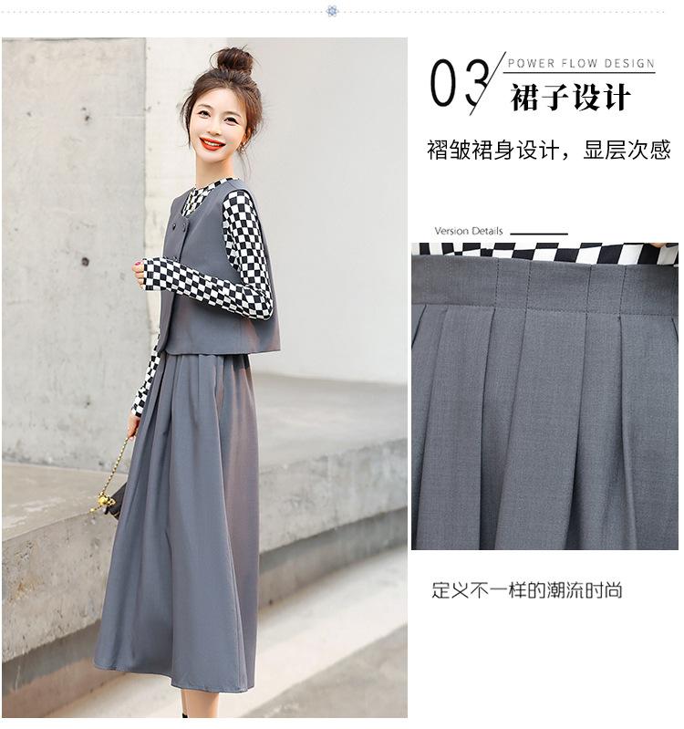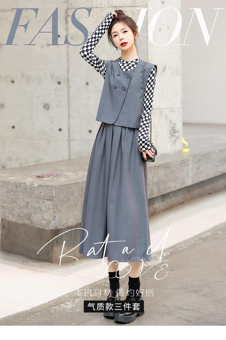 Conjunto de tres piezas con falda base y chaleco ajustado elegante a la moda de primavera con estampado de cuadros de Papaya Milk
