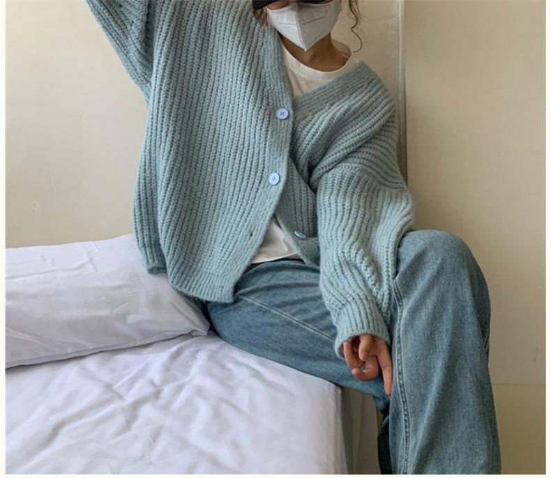 Cárdigan de Punto Grueso de Largo Medio Color Azul Leche Suave para Mujer Otoño e Invierno Nuevo Suéter Holgado Lazy con Cuello en V Grueso Punto de Palo