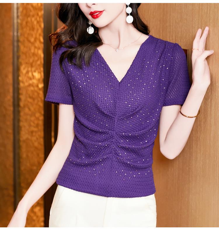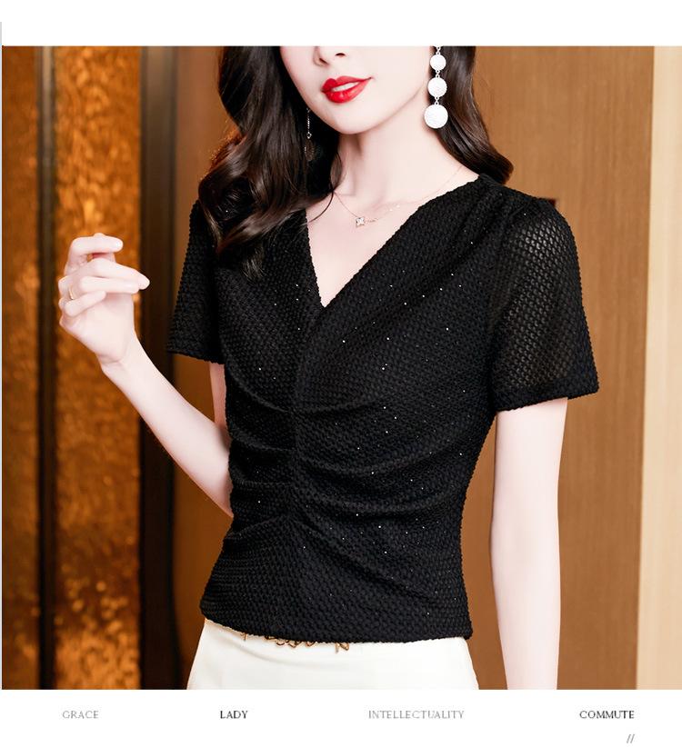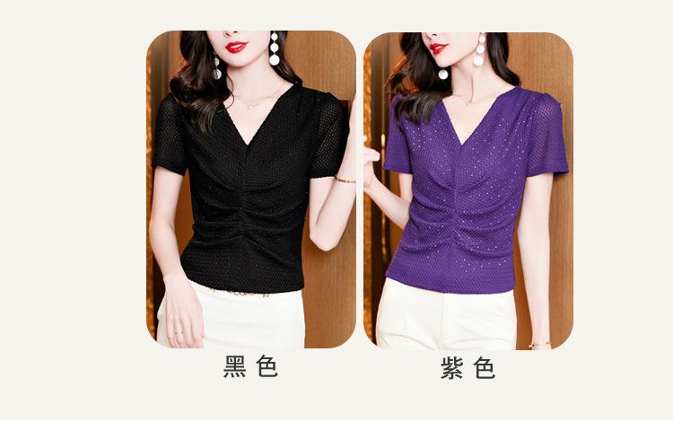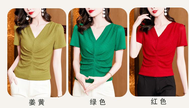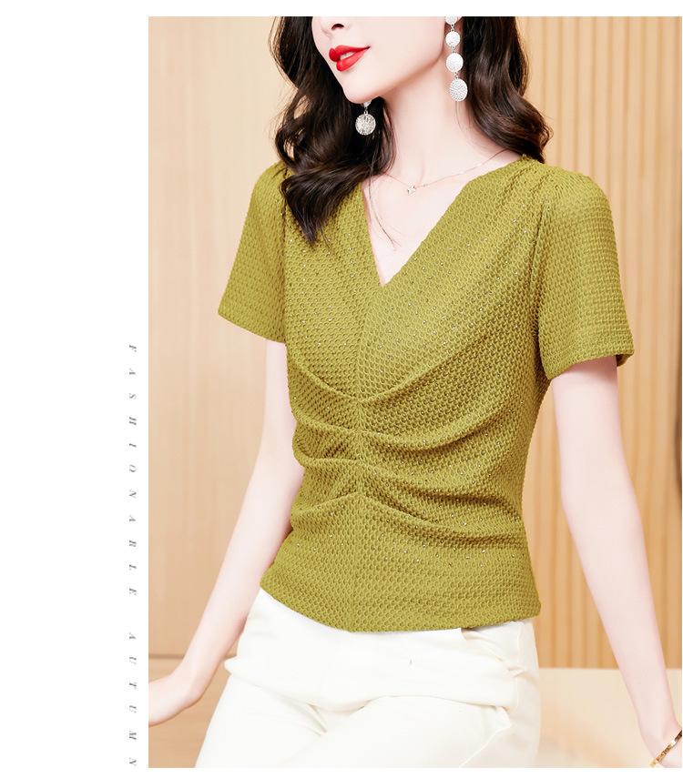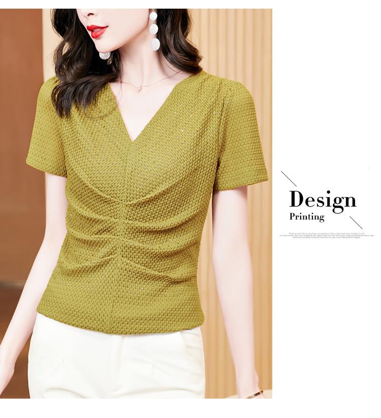 Camiseta de verano de manga corta, cuello en V, ajustada, plisada y con diamantes de imitación, elegante e informal, novedad de 2023
