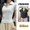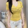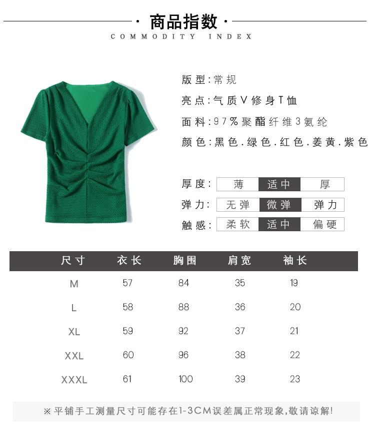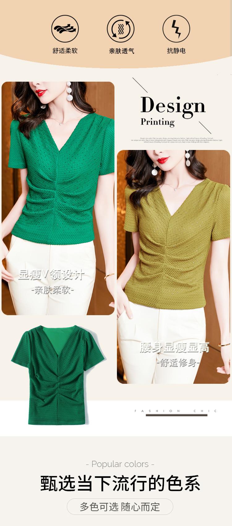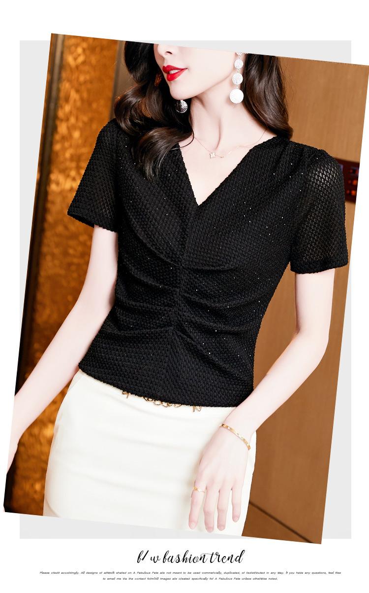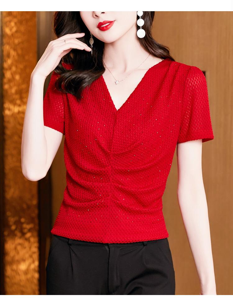 Camiseta de verano de manga corta, cuello en V, ajustada, plisada y con diamantes de imitación, elegante e informal, novedad de 2023