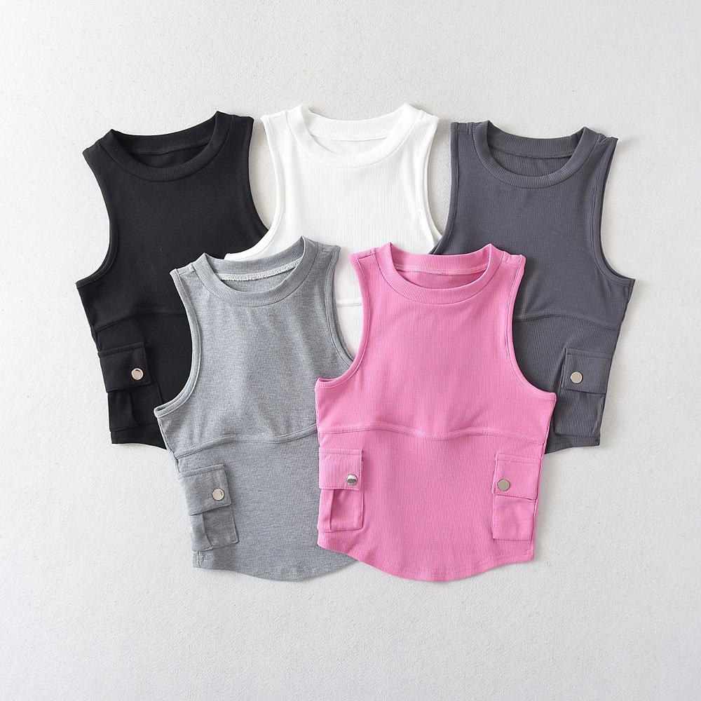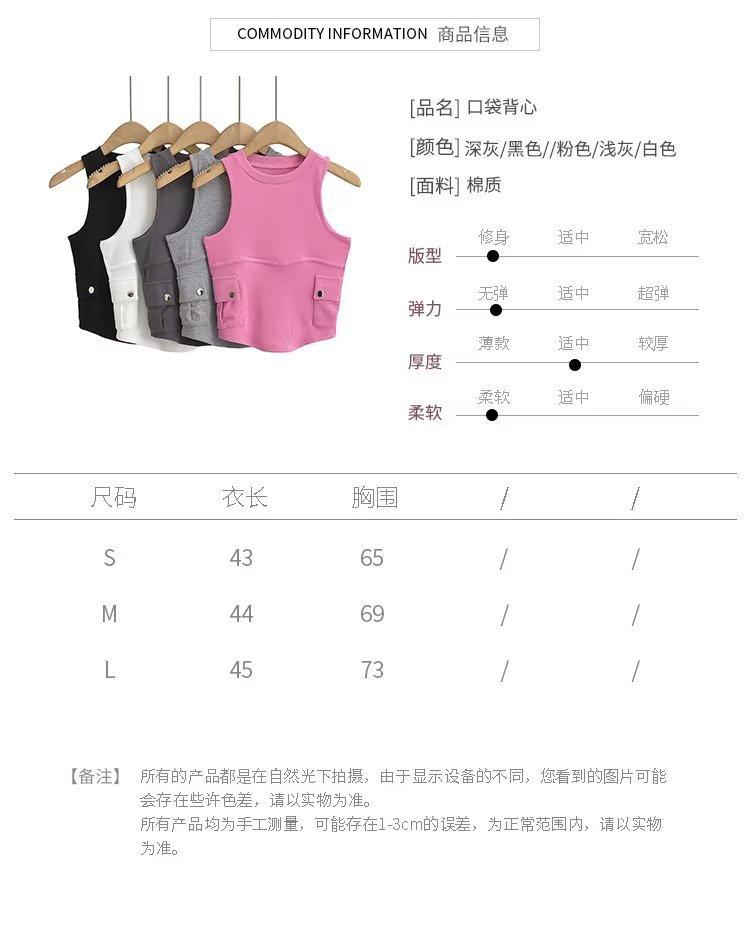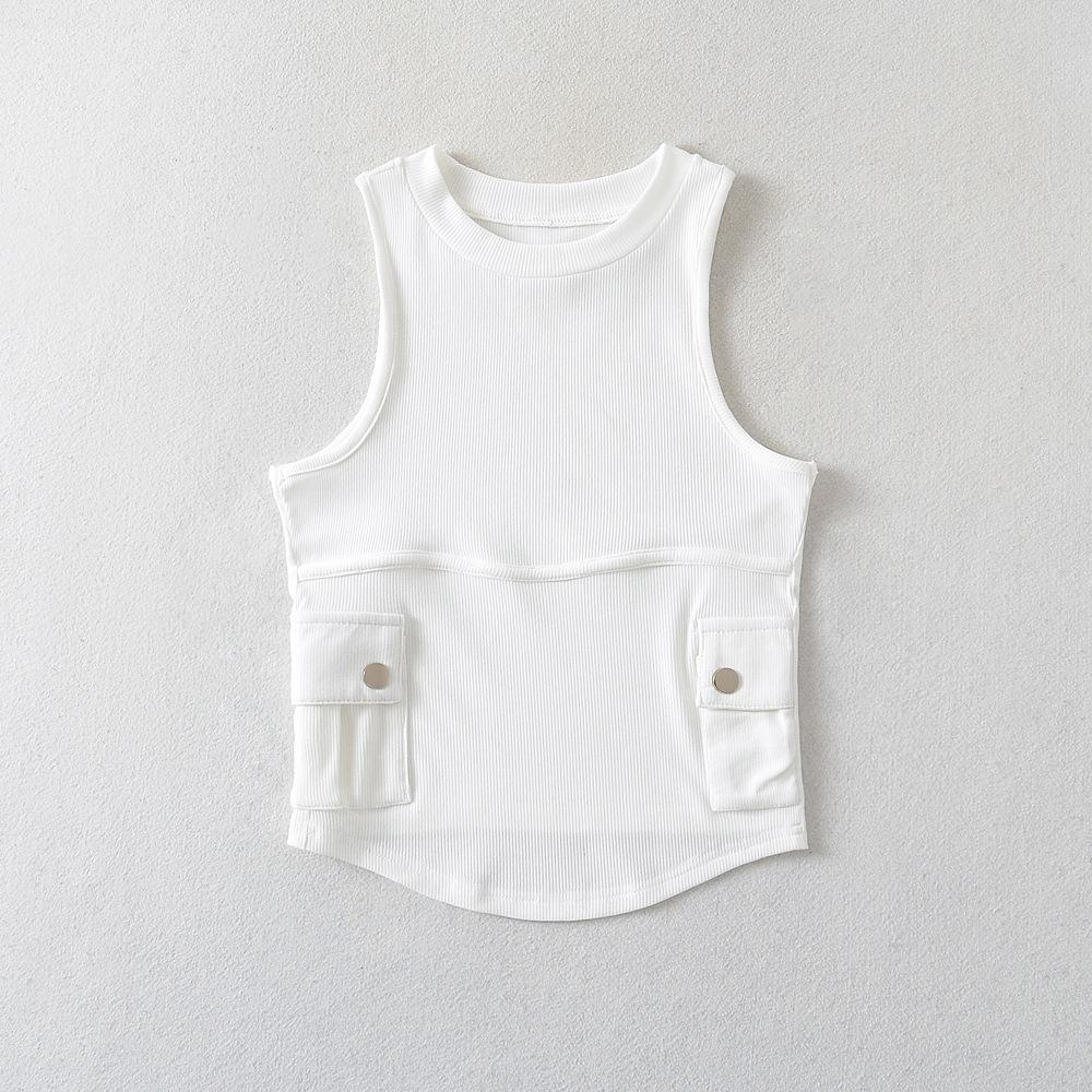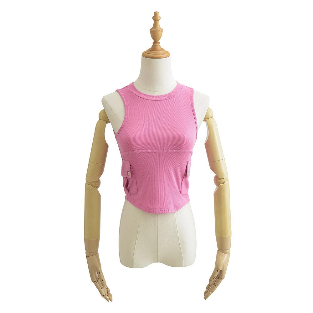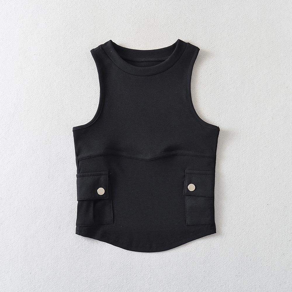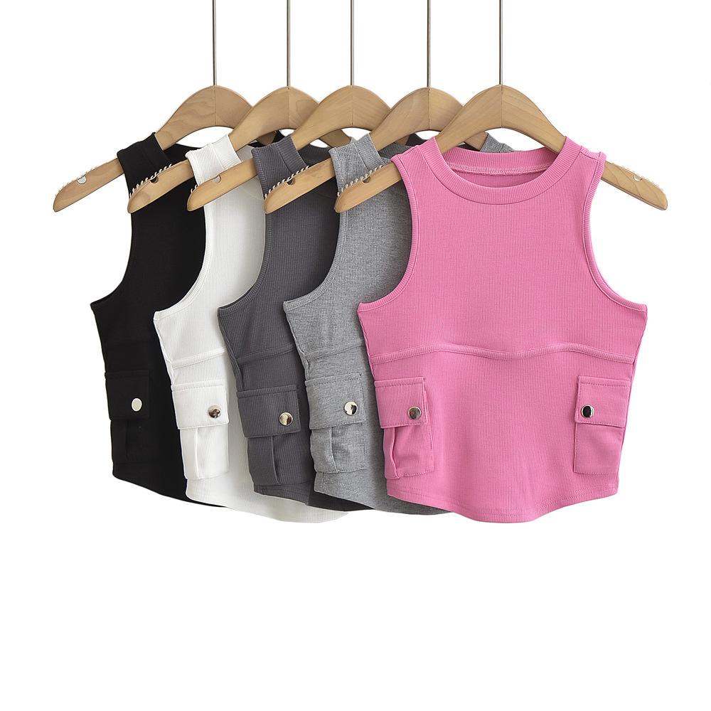 Chaleco corto sexy con diseño de estilo europeo y americano de verano con bolsillos en forma de I para mujer, top sin mangas con tirantes y todo tipo de combinaciones.