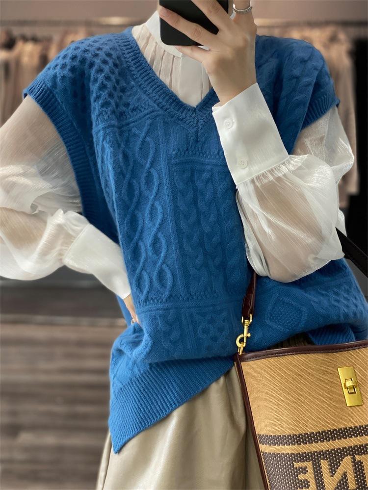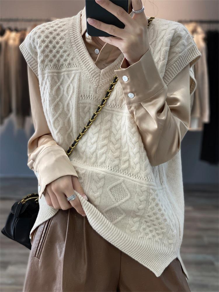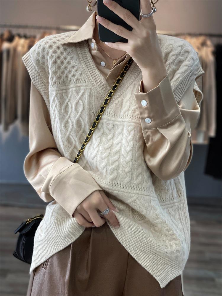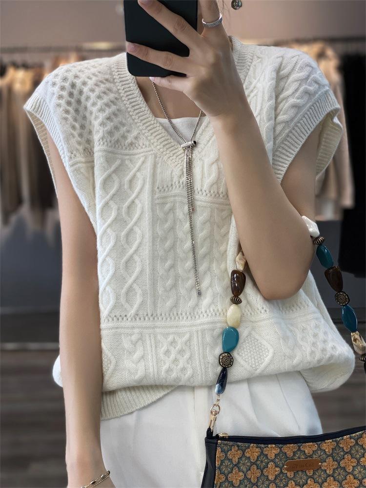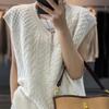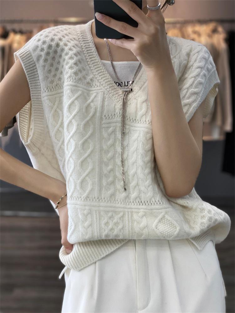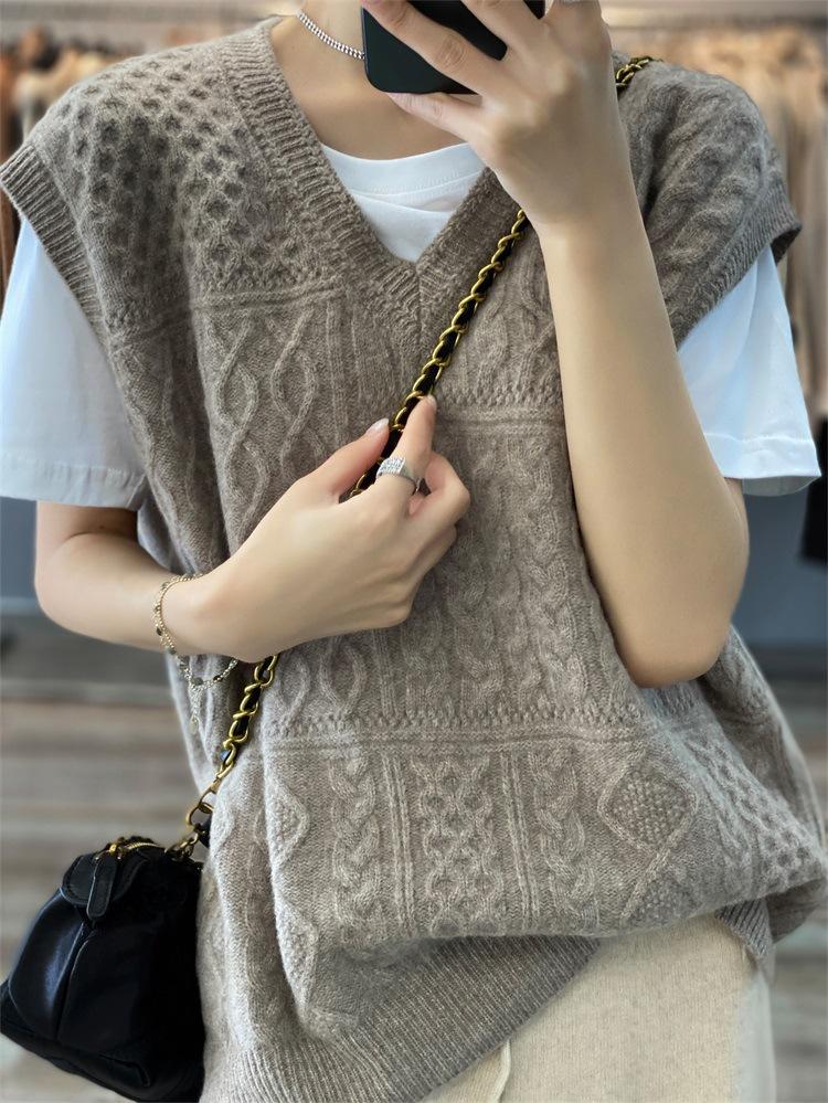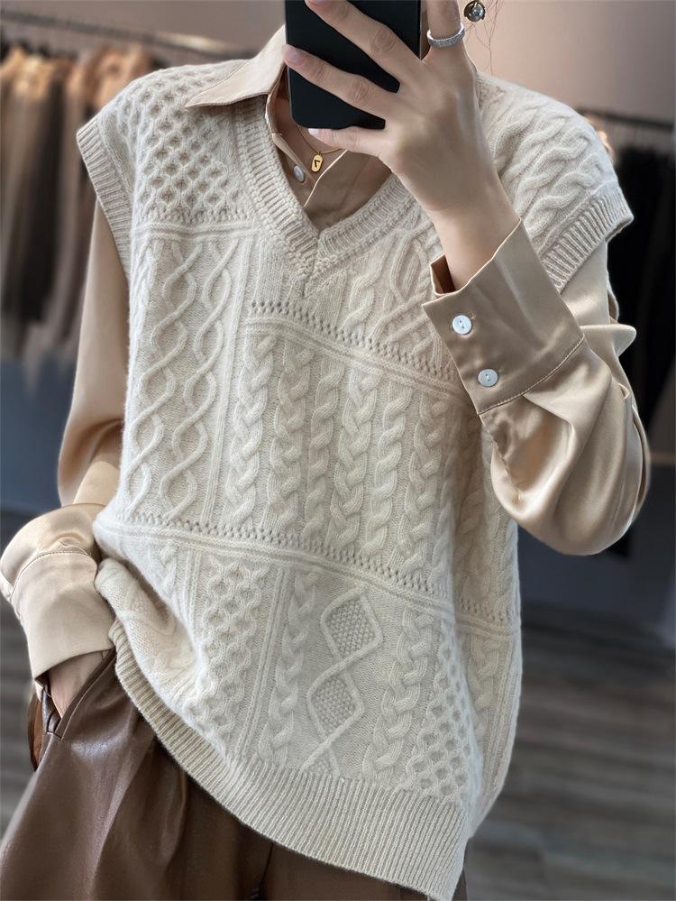 Chaleco Holgado de Lana Pura Tejido con Cuello en V, Versátil Ropa Exterior sin Mangas de Color Sólido, Top de Punto Trenzado para Mujer, Versión Gruesa