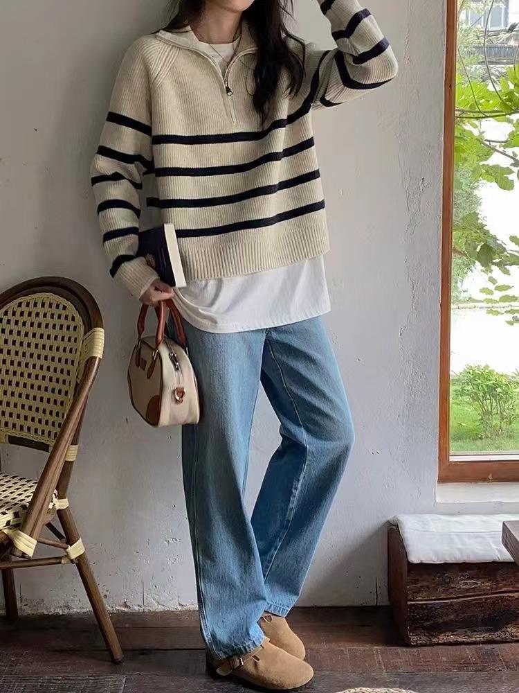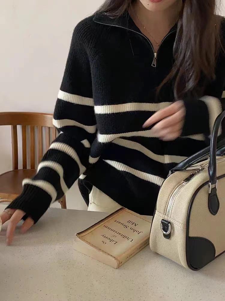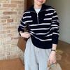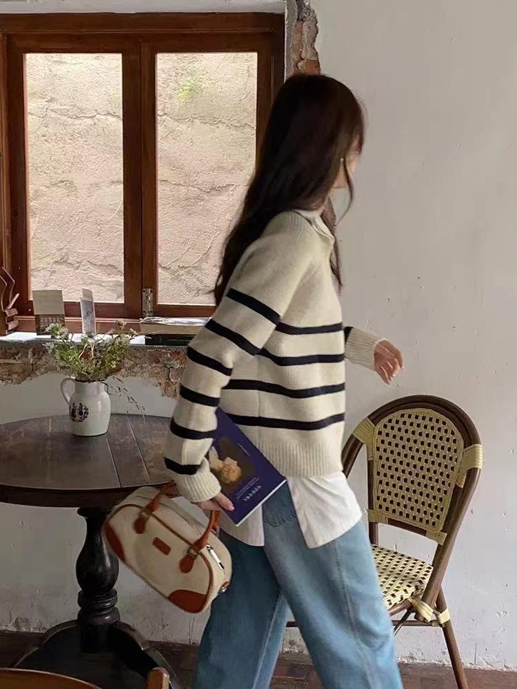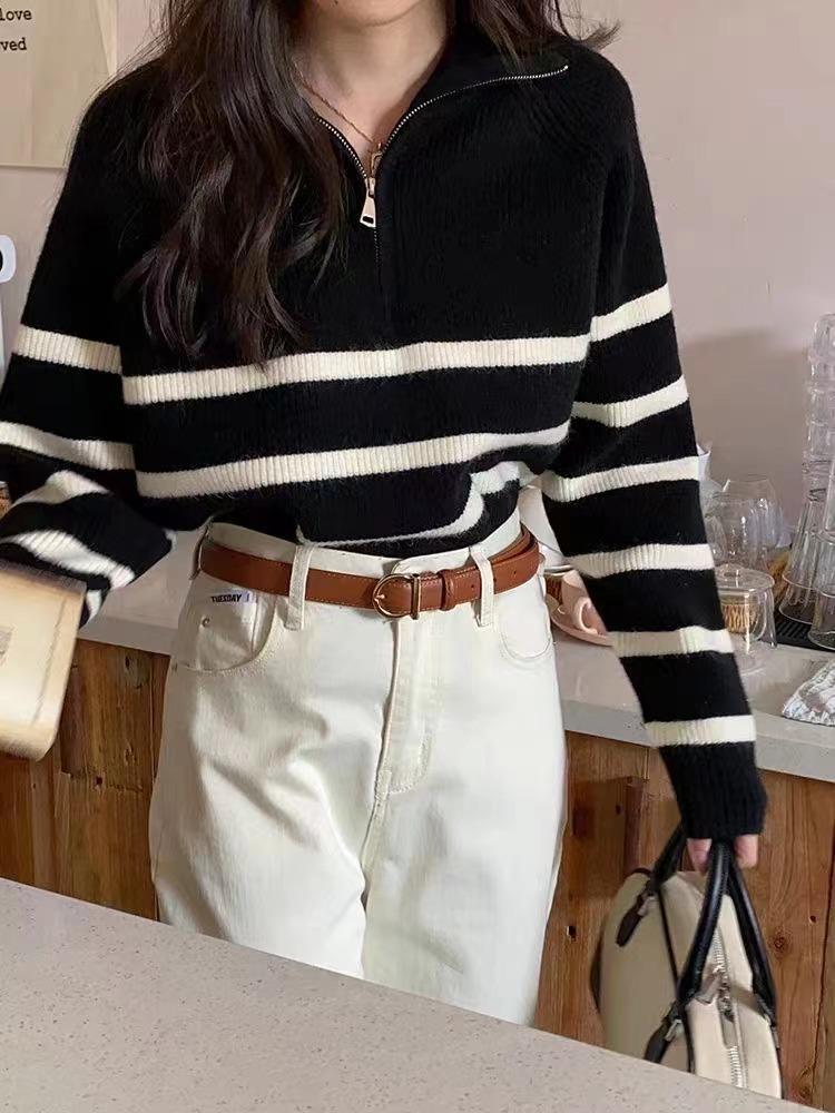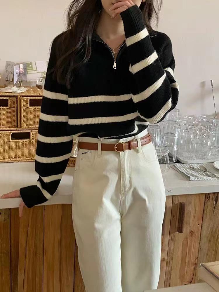 Suéter de solapa a rayas con cremallera de estilo coreano, otoño e invierno de 2023, diseño de nicho de temperamento, top de punto corto de moda