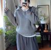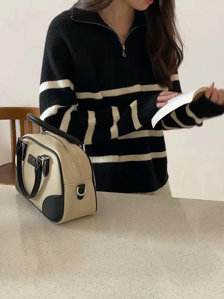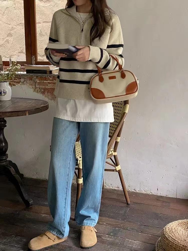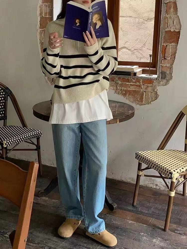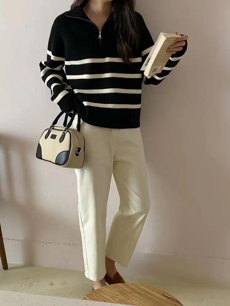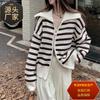 Suéter de solapa a rayas con cremallera de estilo coreano, otoño e invierno de 2023, diseño de nicho de temperamento, top de punto corto de moda