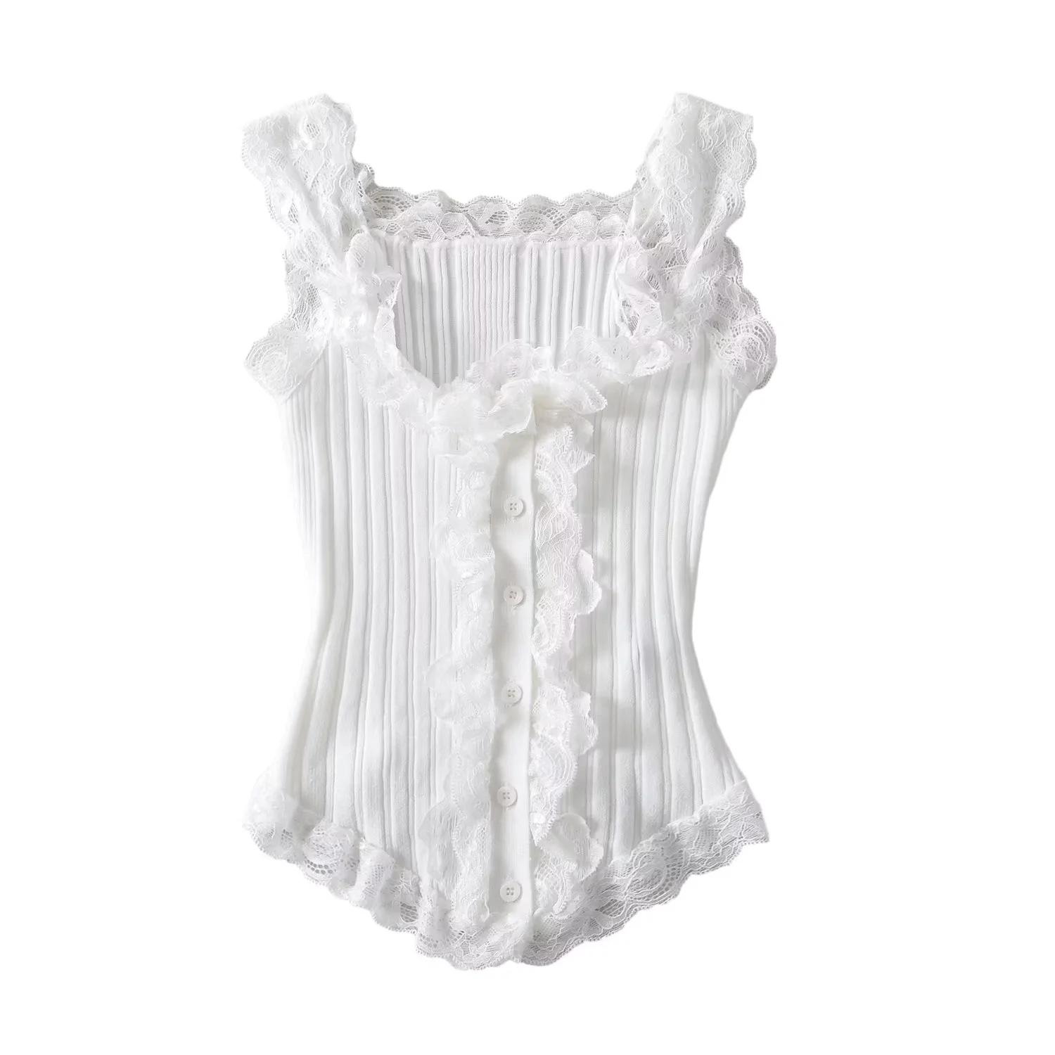 Camisola de punto de encaje dulce y picante para mujer, verano 2024, pura, sexy, sin mangas, ropa exterior, temperamento interior.