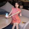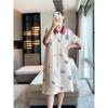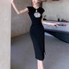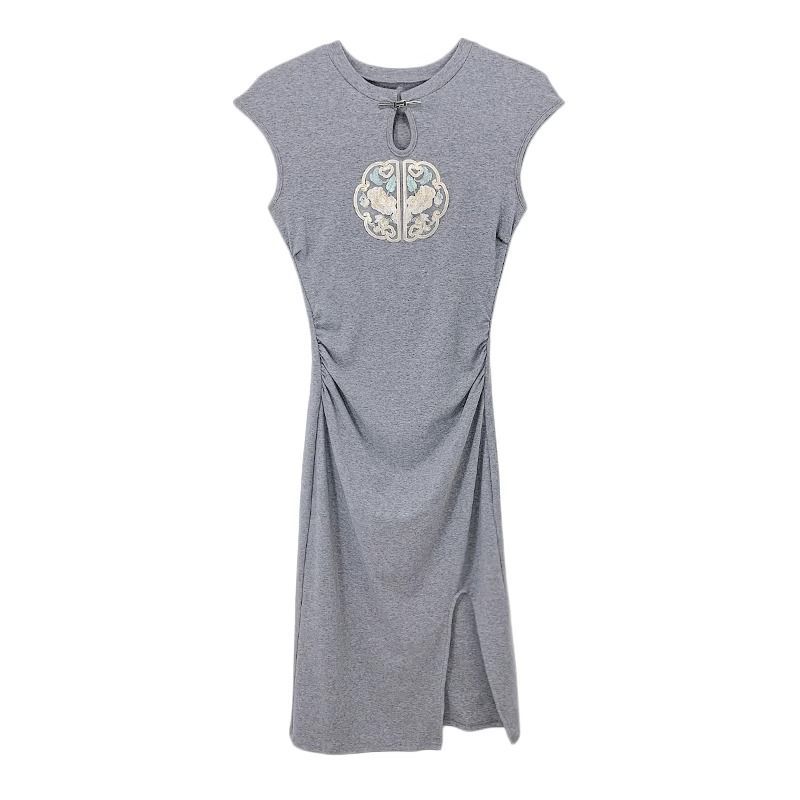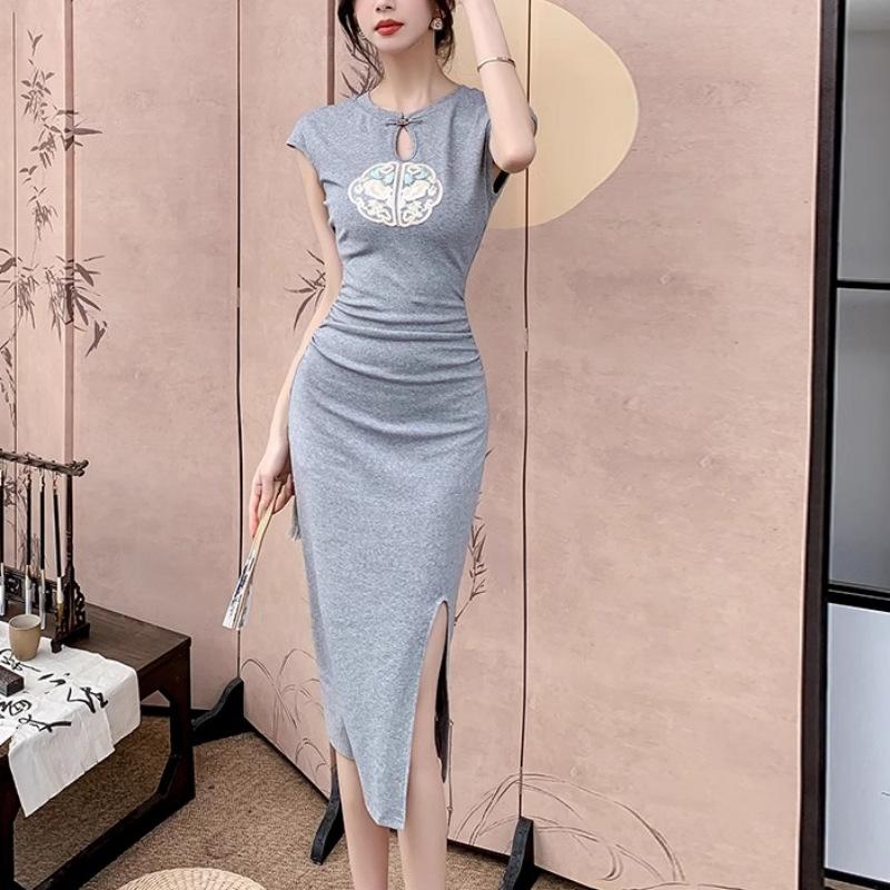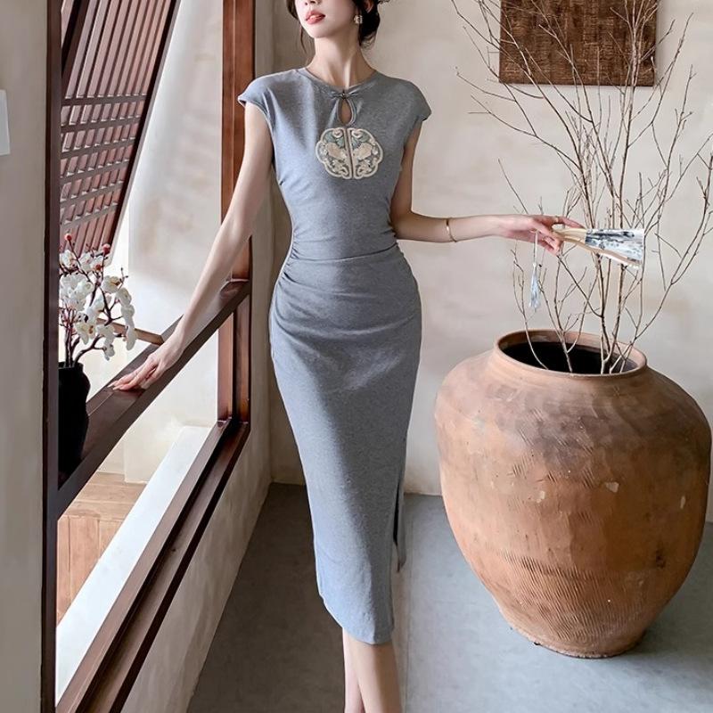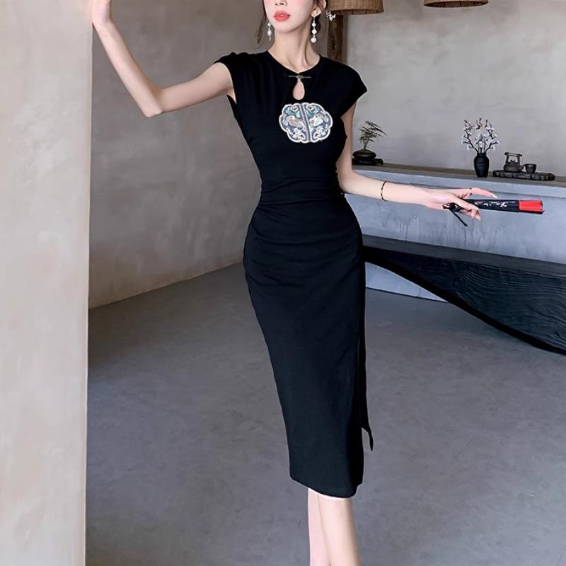 Vestido midi elegante de estilo chino con mangas bordadas y diseño nacional para mujer, diseño de verano, cintura plisada y abertura en la cadera