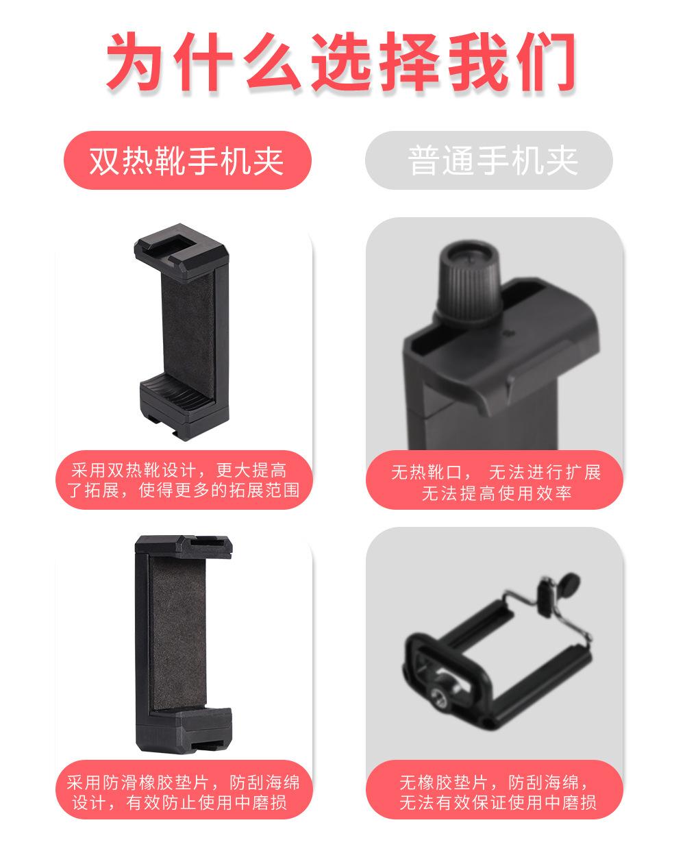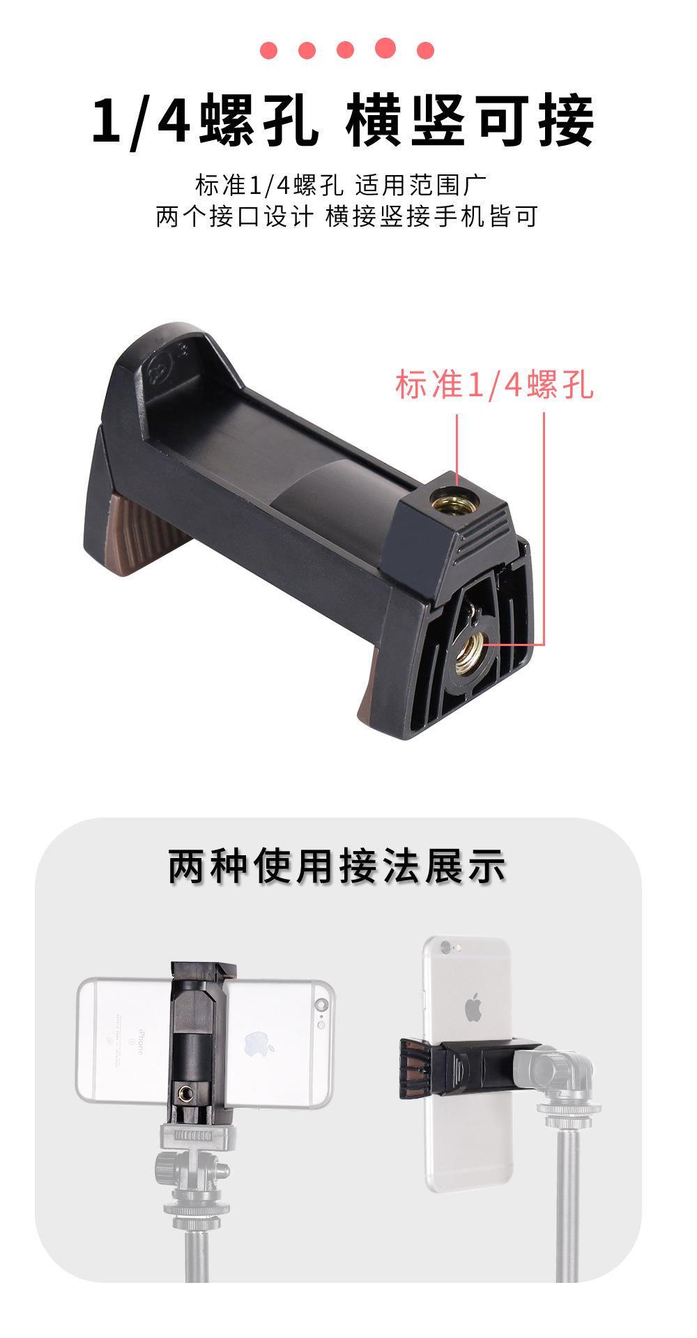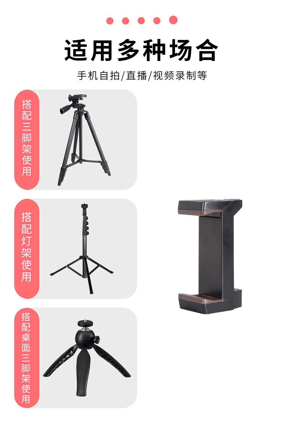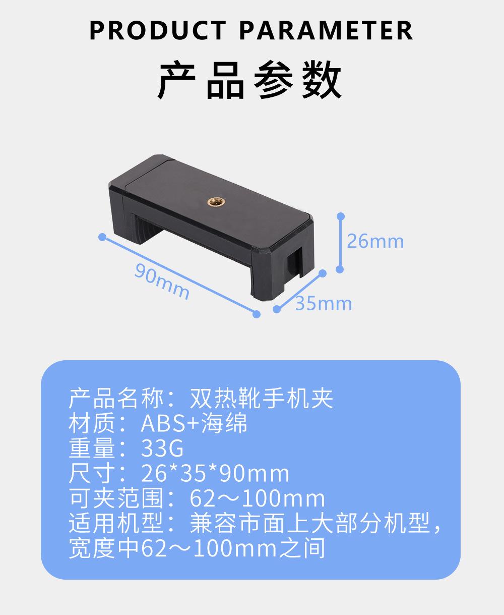 La pinza para teléfono móvil es adecuada para tomar fotos con teléfonos móviles de 55-85 mm como Apple, Samsung y Xiaomi. También se puede instalar en un palo selfie o trípode para grabar. Es la pinza para teléfono móvil más rentable del mercado. Elegimos materiales de alta calidad para brindar a los clientes la mayor experiencia preferencial.