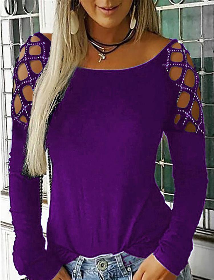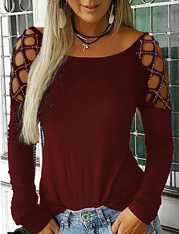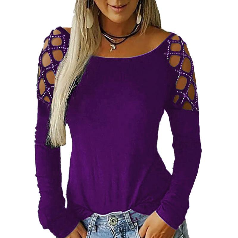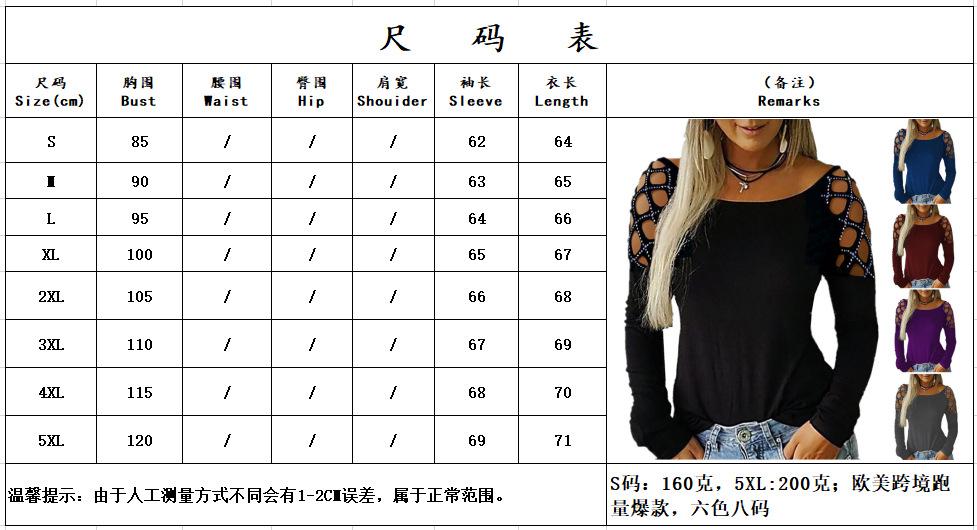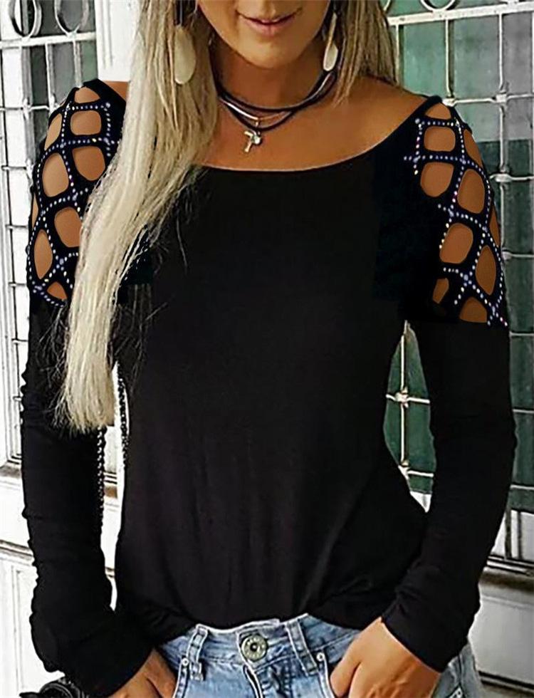 Otoño e Invierno 2019 Ropa de Mujer Transfronteriza Europea y Americana Amazon Wish Más Vendido Cuello Redondo Recorte de Diamantes Calientes Top Camiseta de Manga Larga