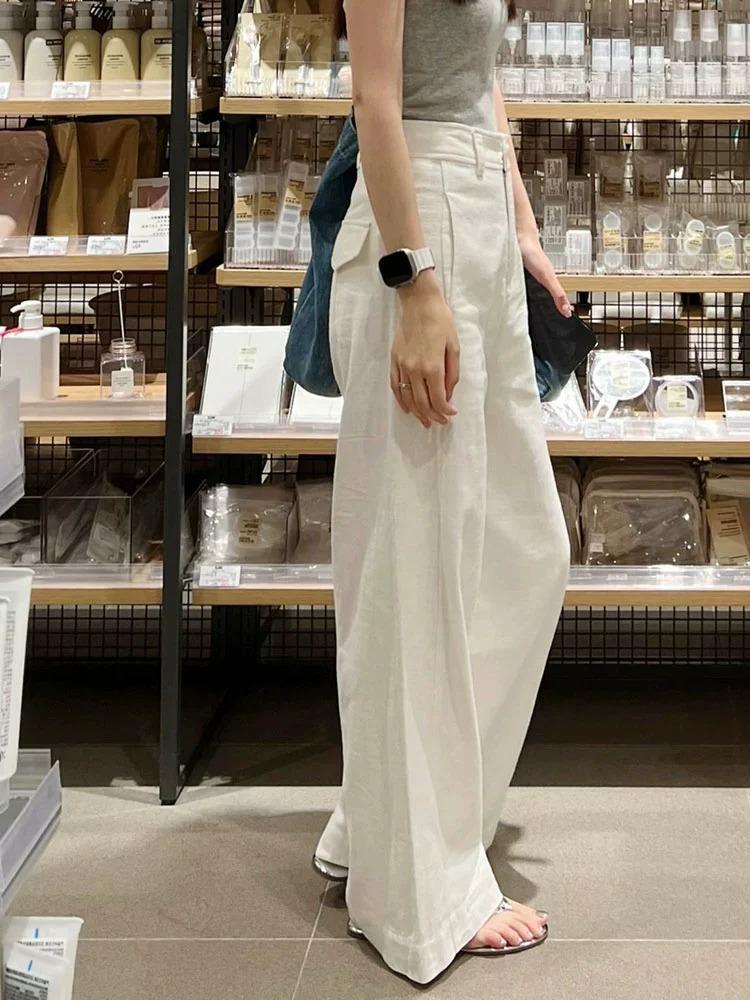 2025 Nuevo Estilo de Verano Pantalones Anchos de Algodón y Lino Blancos Pequeños Cintura Alta Drapeados Rectos Slim Casuales para Mujer Trendy