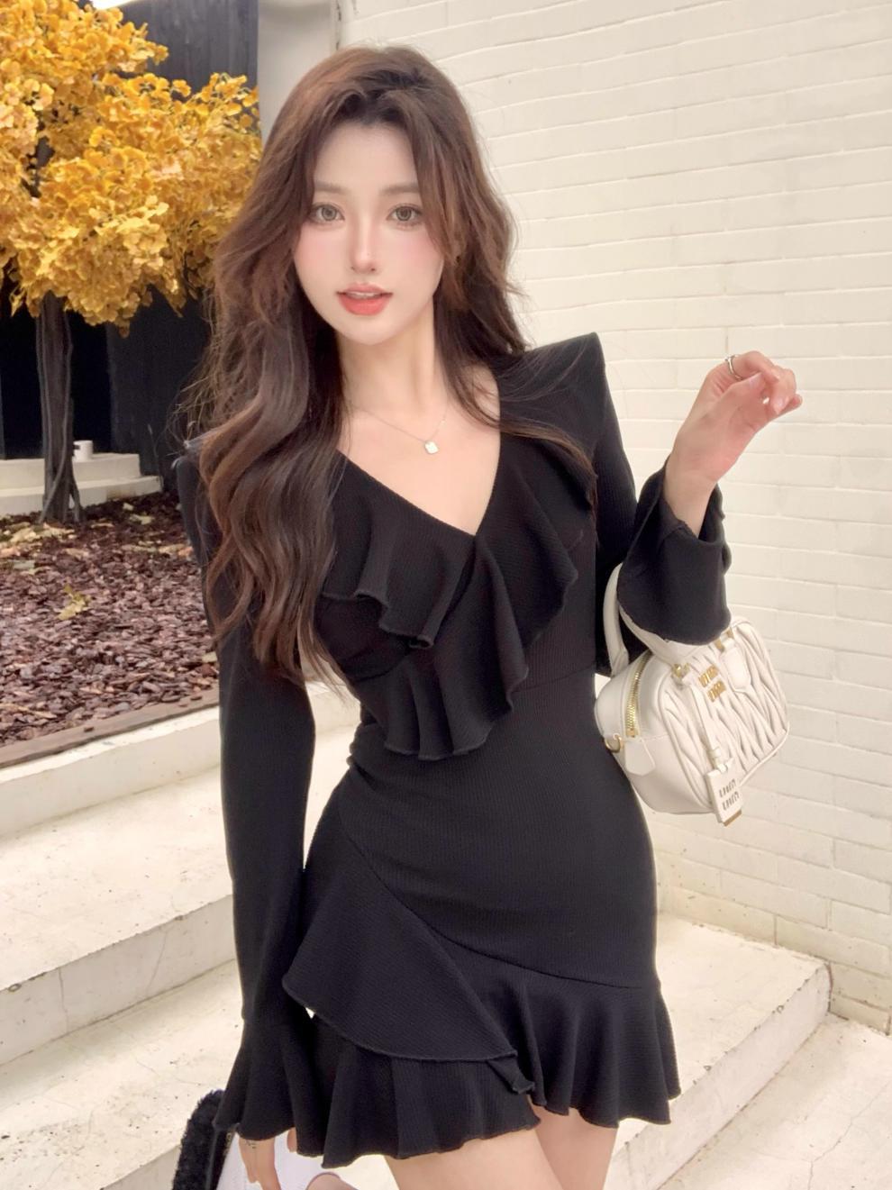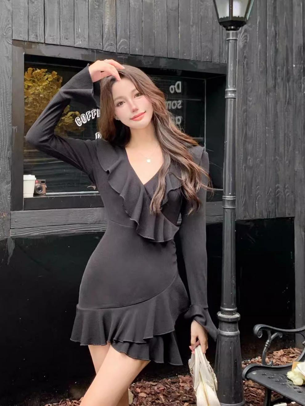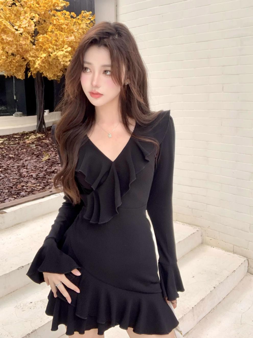 Vestido sexy con escote en V para mujer, de Pure Desire Hot Girl, otoño e invierno, nuevo, ajustado, con mangas acampanadas y volantes, color negro.