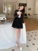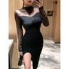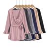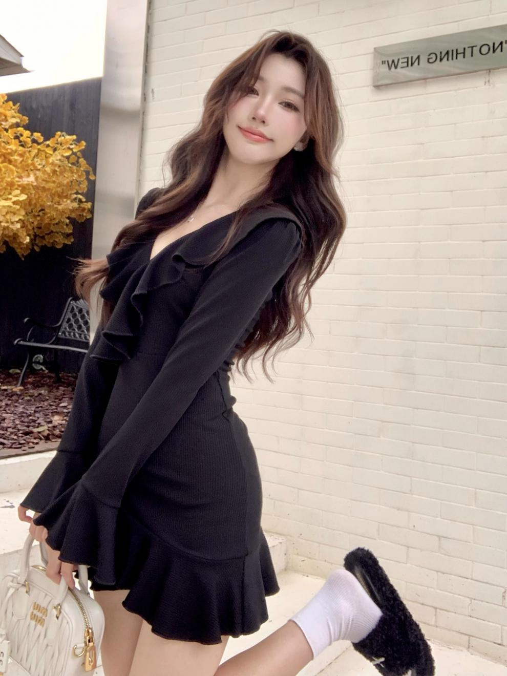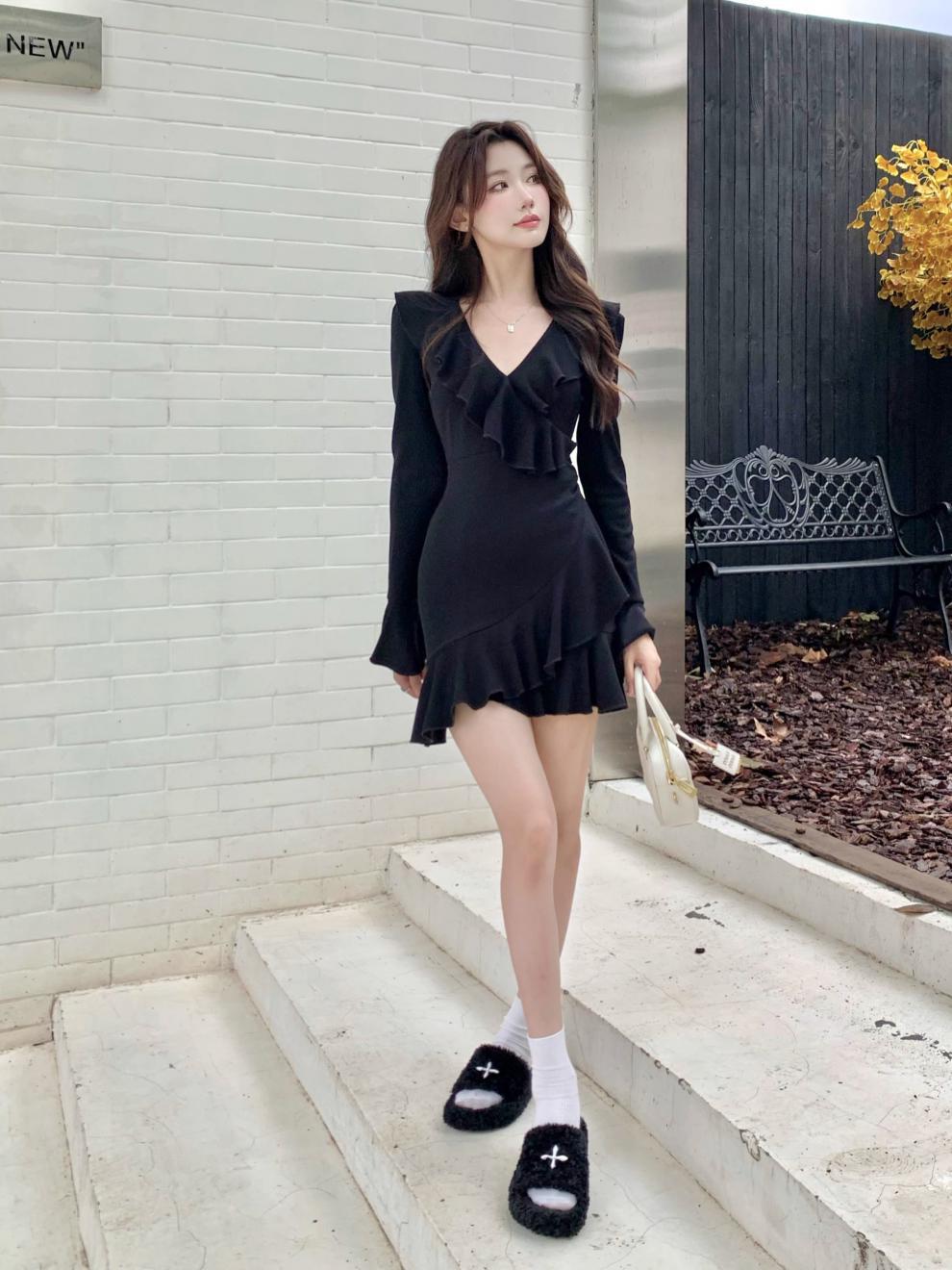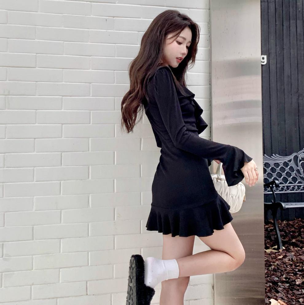 Vestido sexy con escote en V para mujer, de Pure Desire Hot Girl, otoño e invierno, nuevo, ajustado, con mangas acampanadas y volantes, color negro.