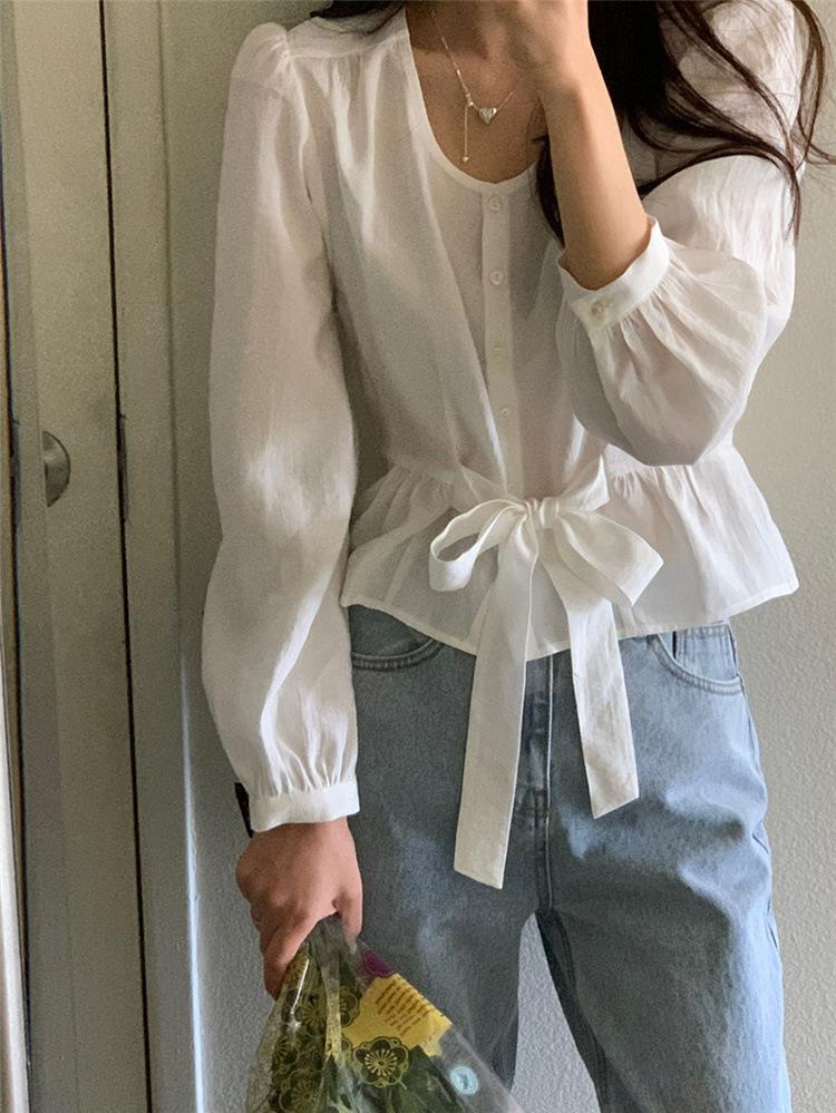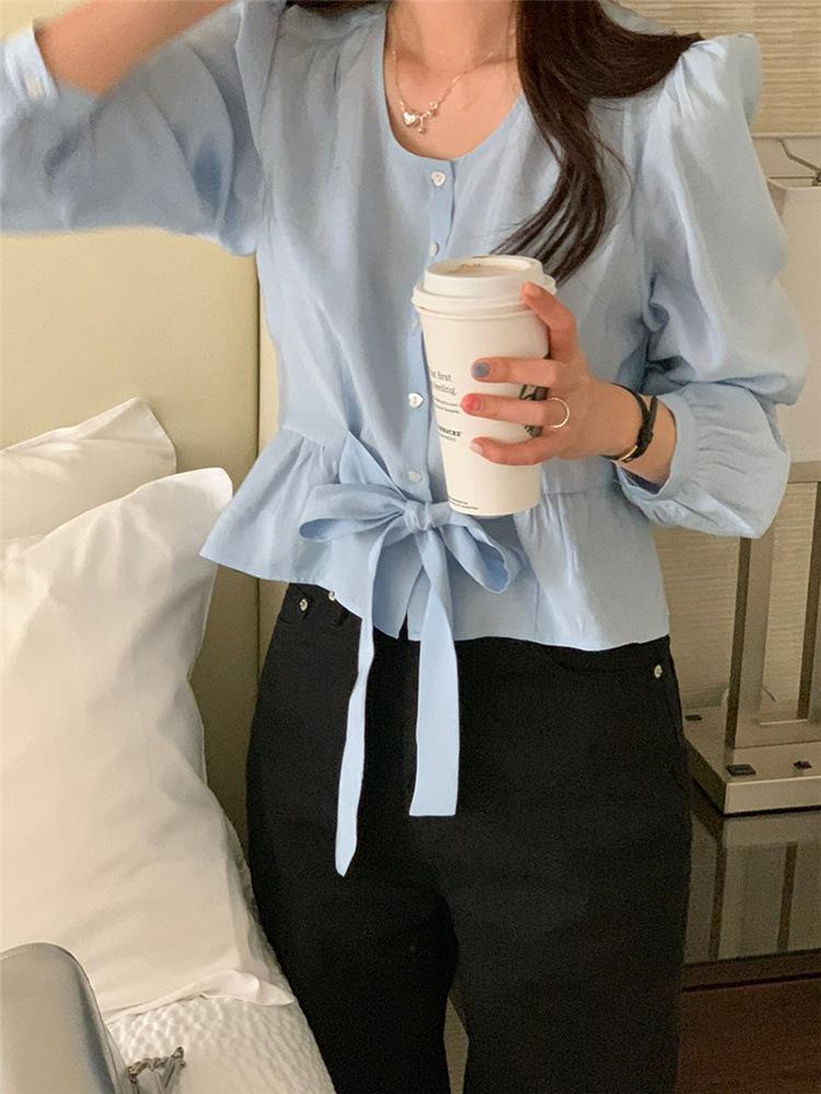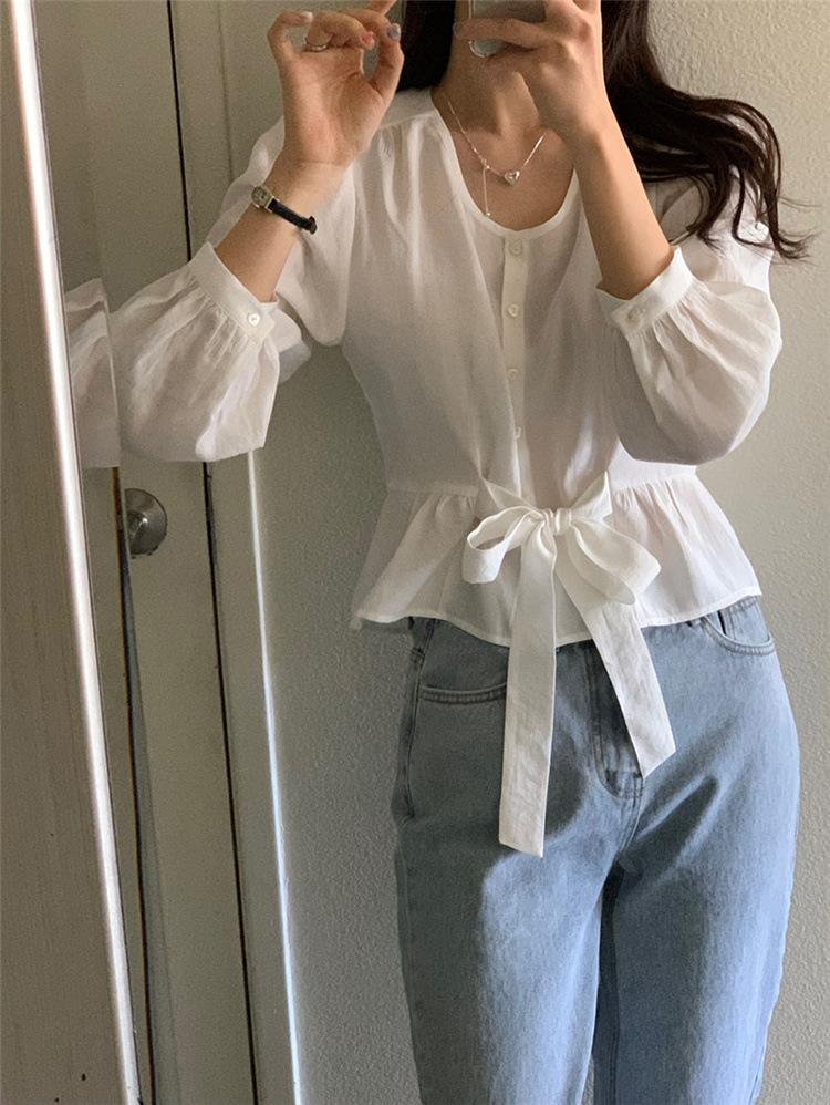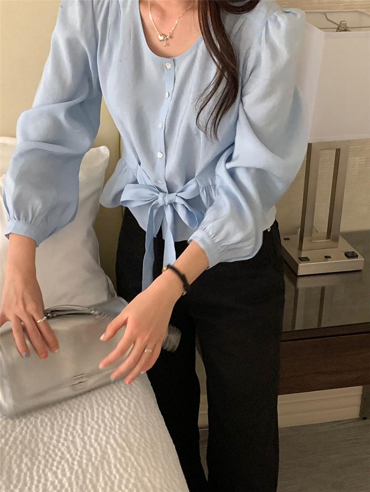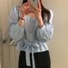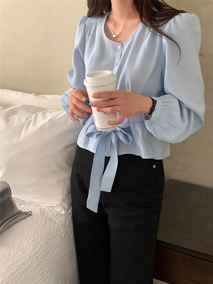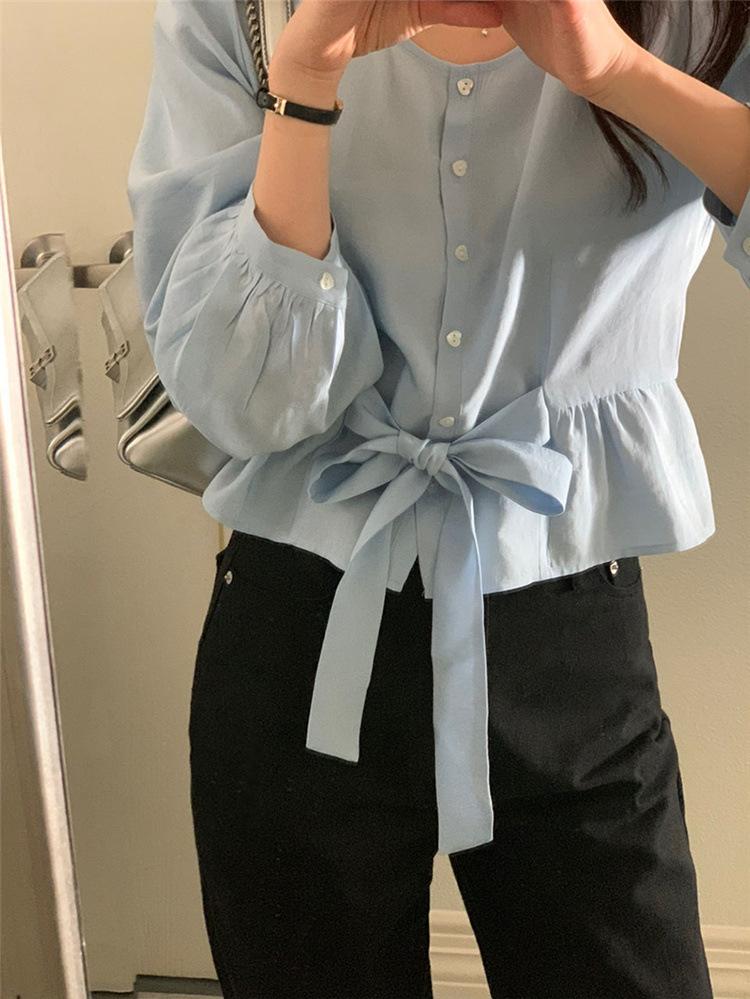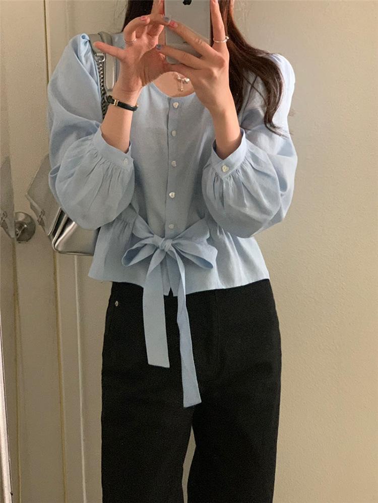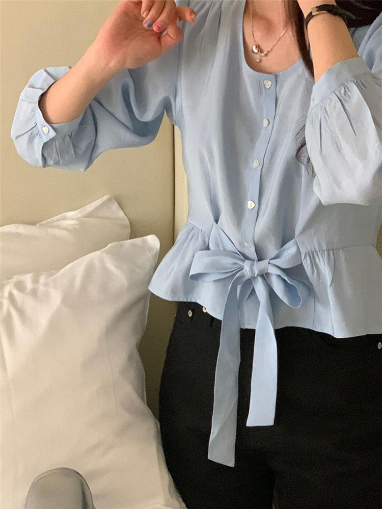 Camisa corta con cuello redondo y cintura alta, nueva primavera 2023, con mangas abullonadas y lazo, fresca y dulce, combinable con todo.