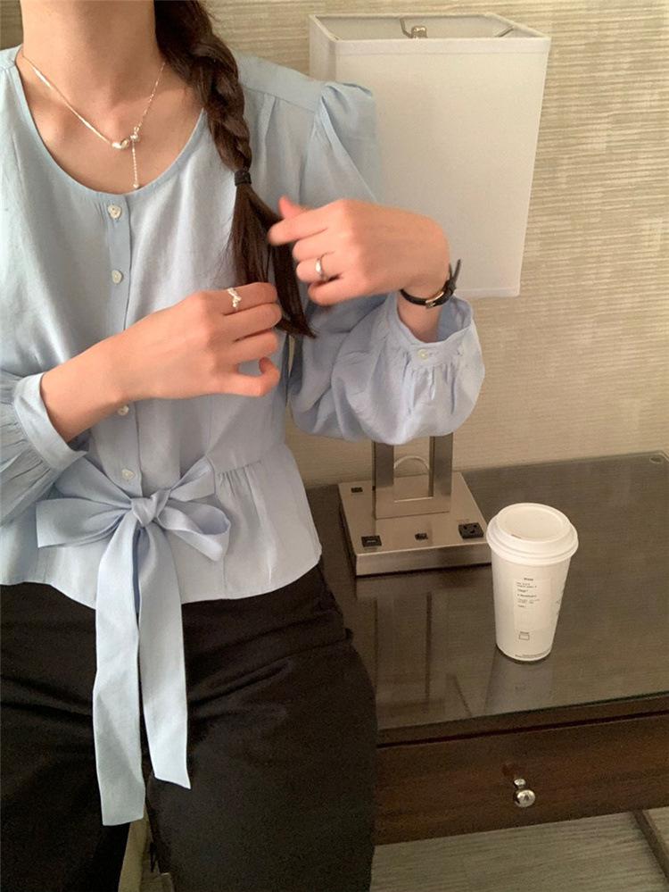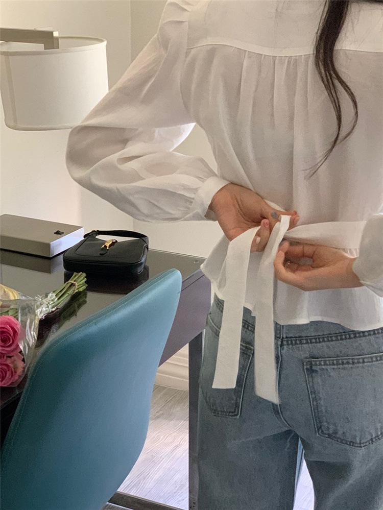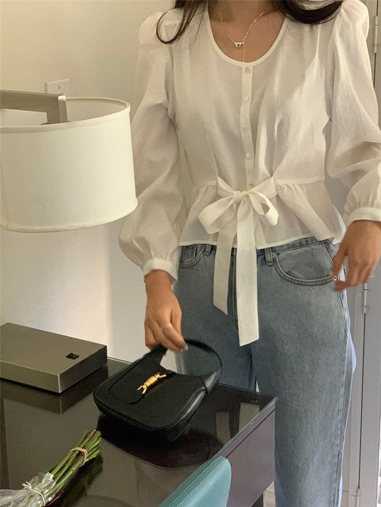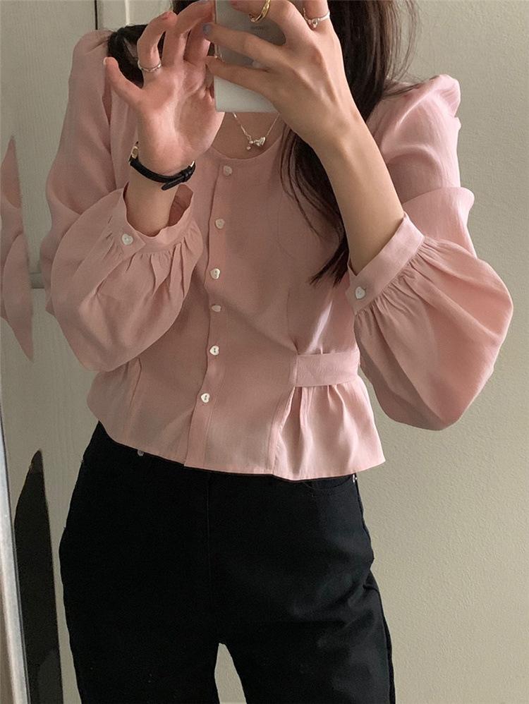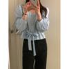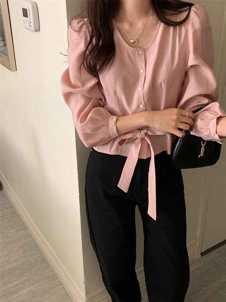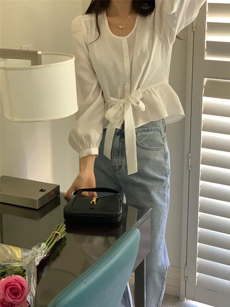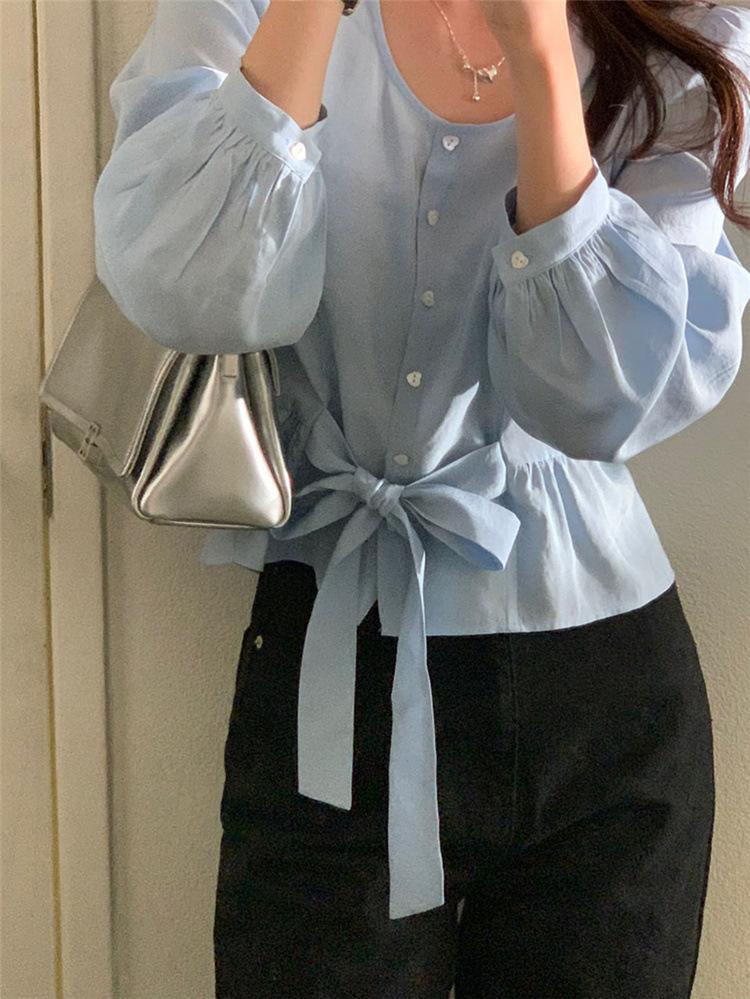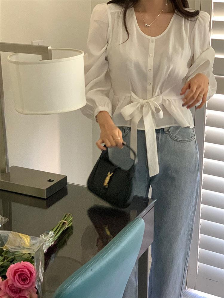 Camisa corta con cuello redondo y cintura alta, nueva primavera 2023, con mangas abullonadas y lazo, fresca y dulce, combinable con todo.