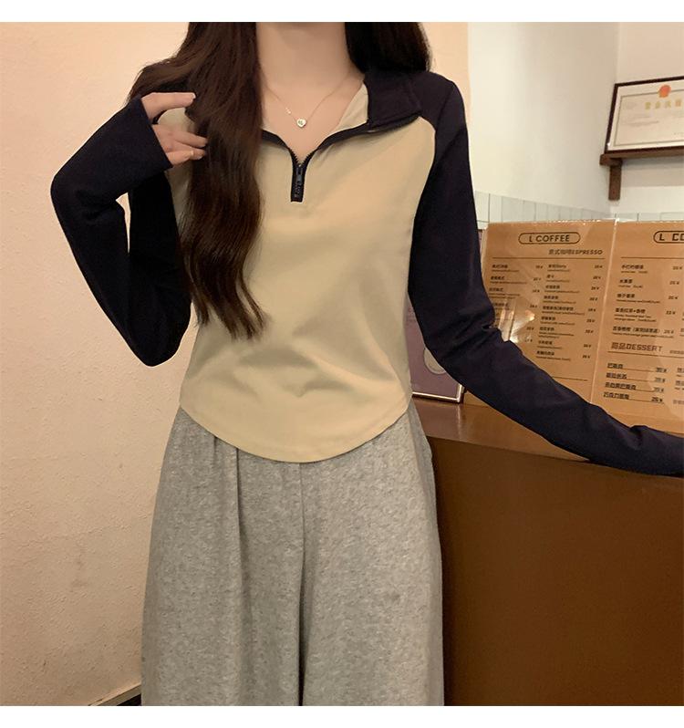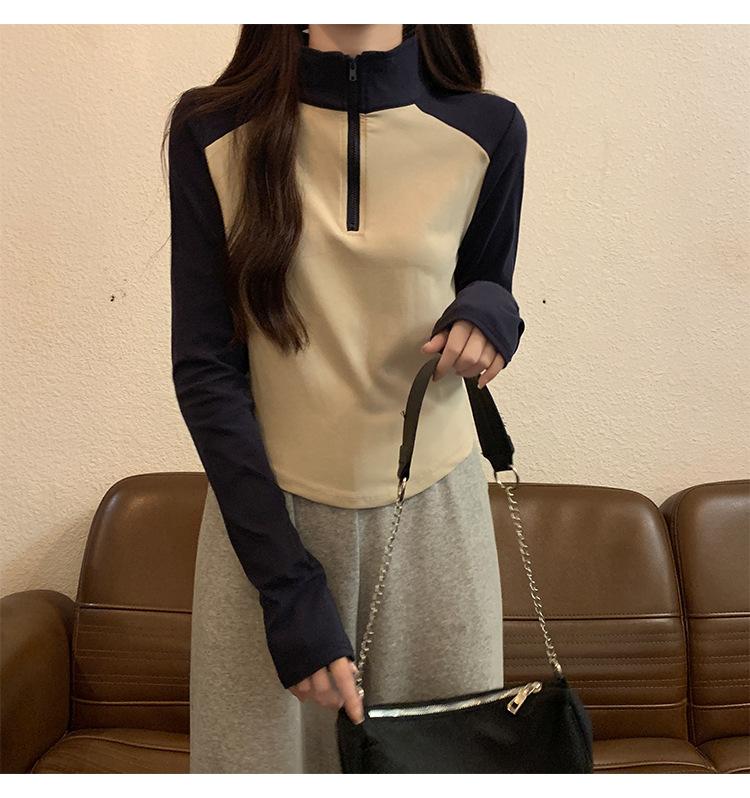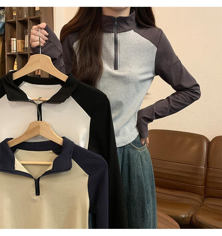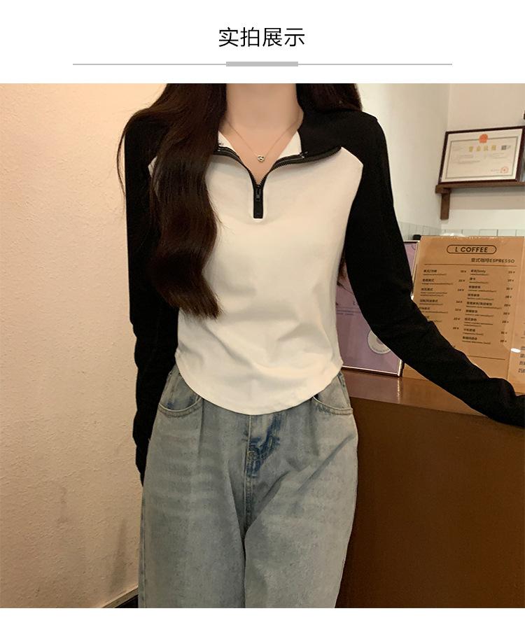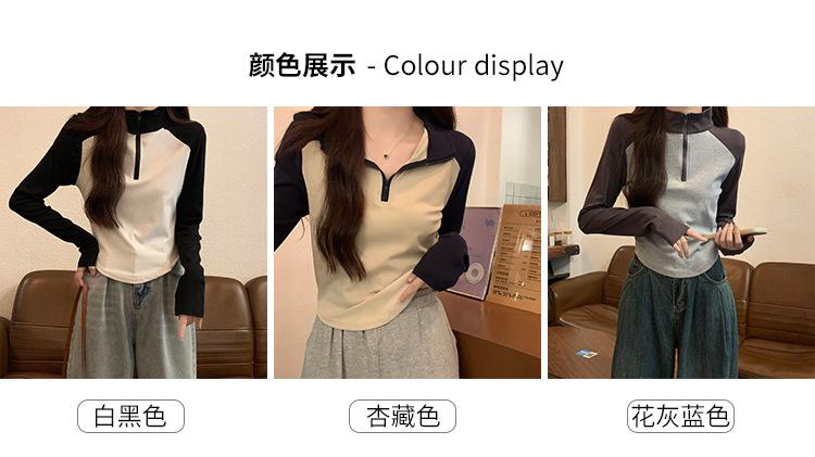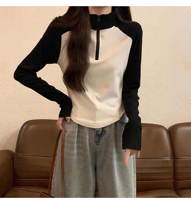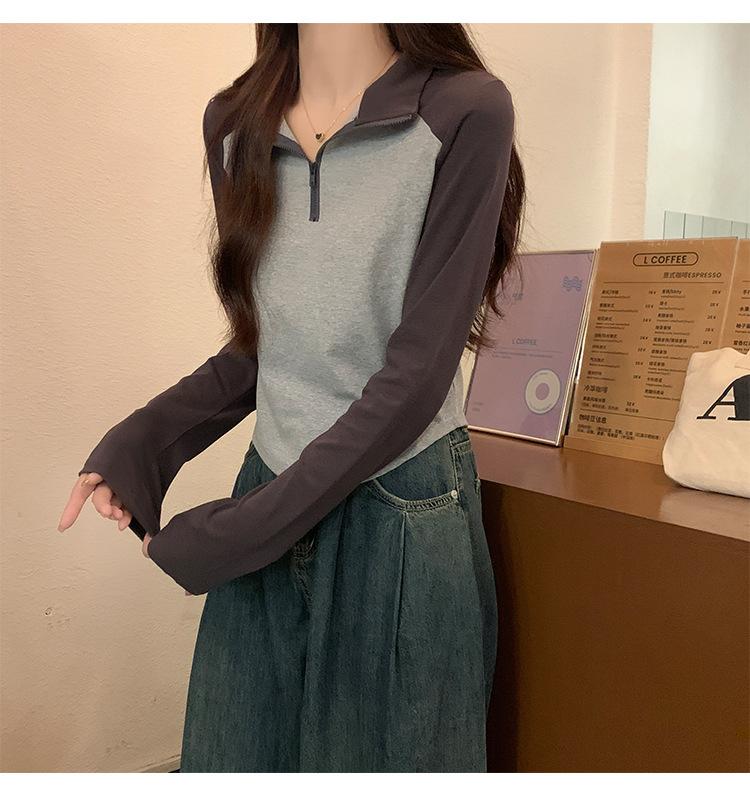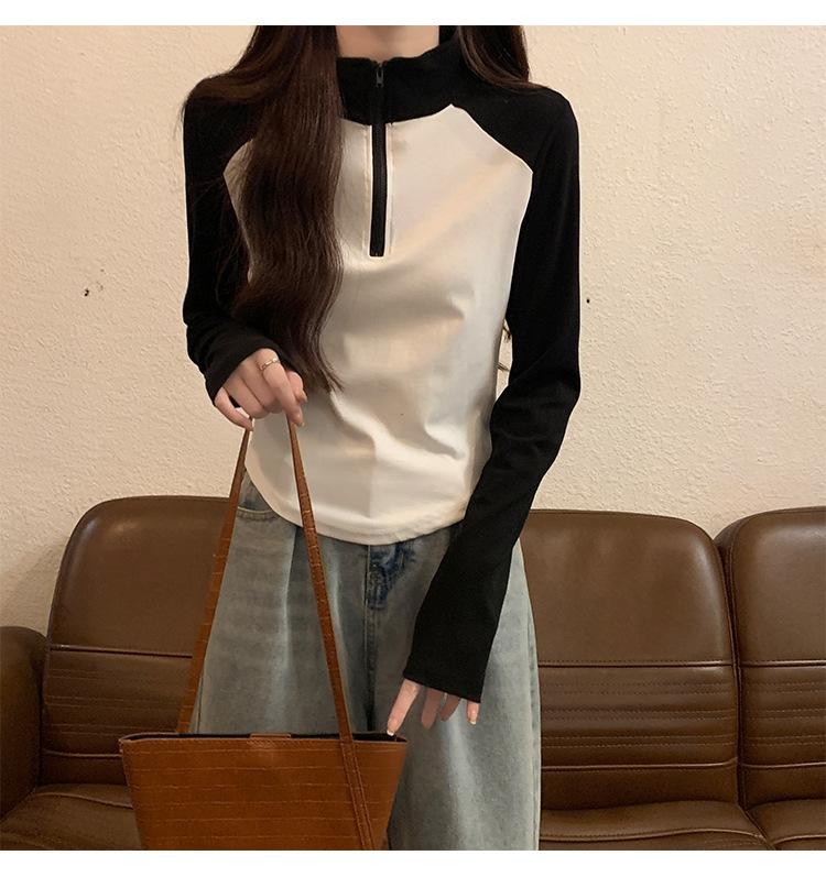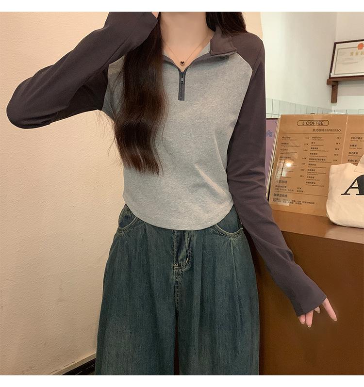 Top retro de manga raglán estilo americano con costuras de color contrastante para mujer 2023 nuevo ajuste ceñido versátil camiseta corta estampada de manga larga