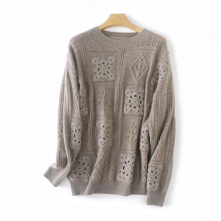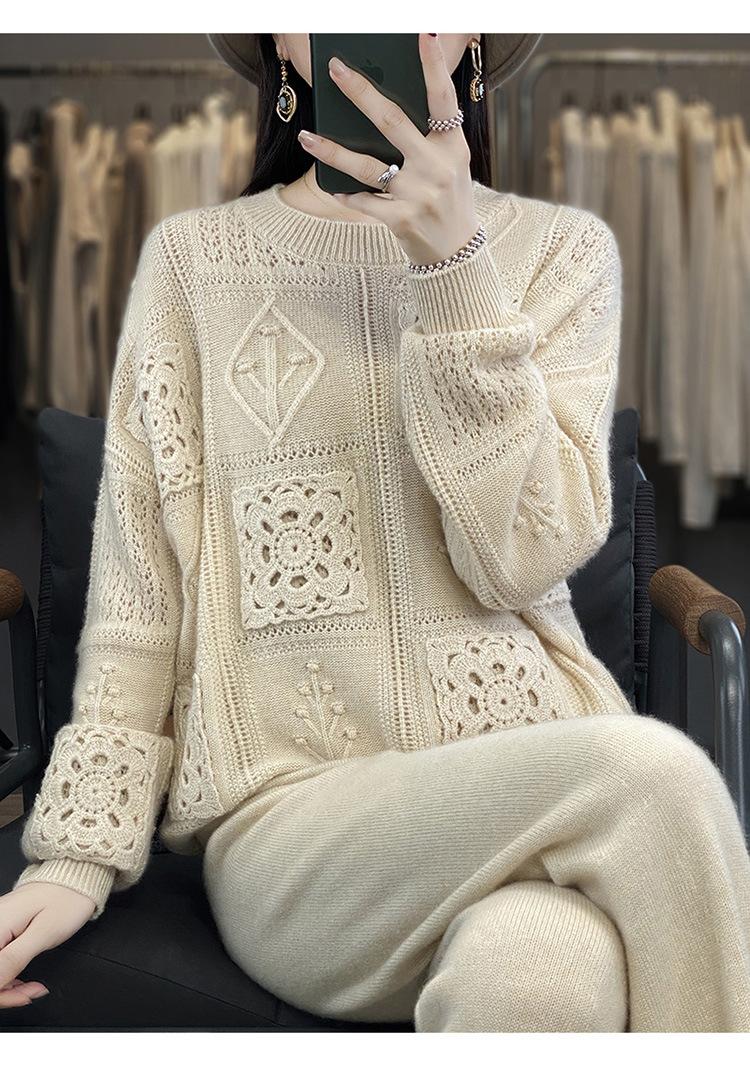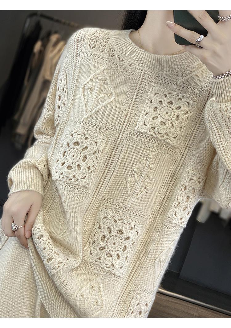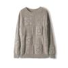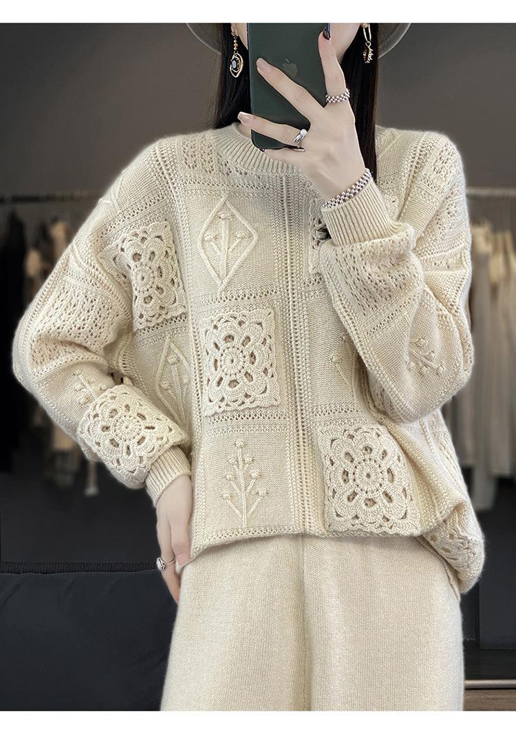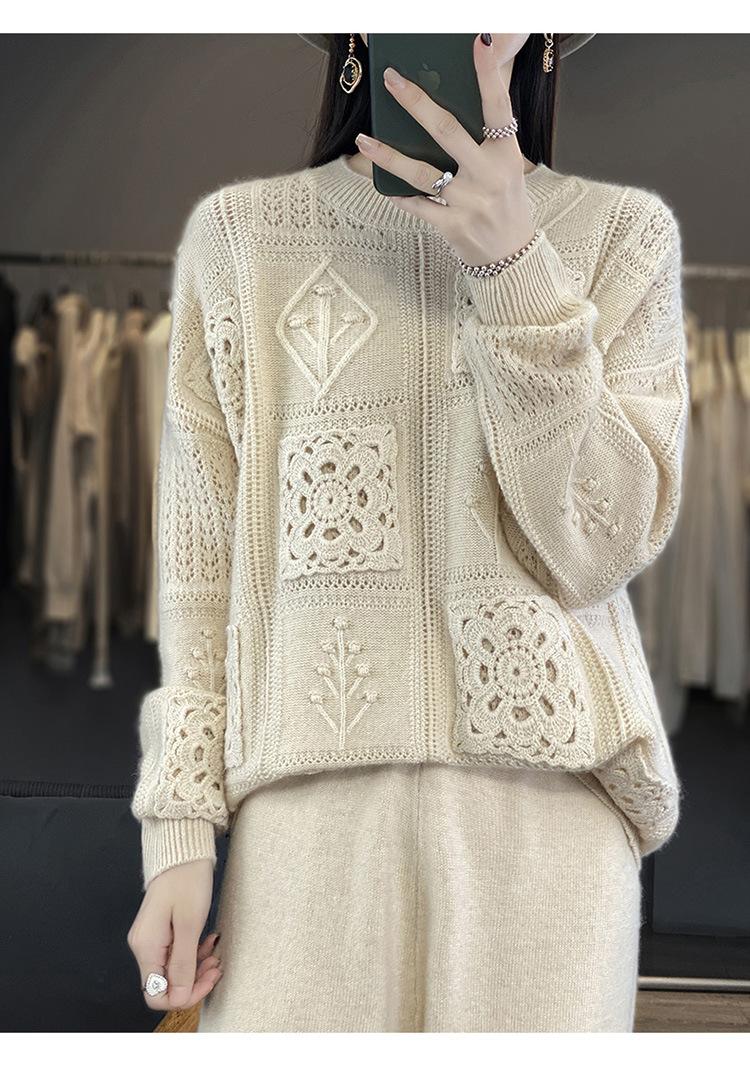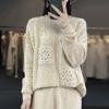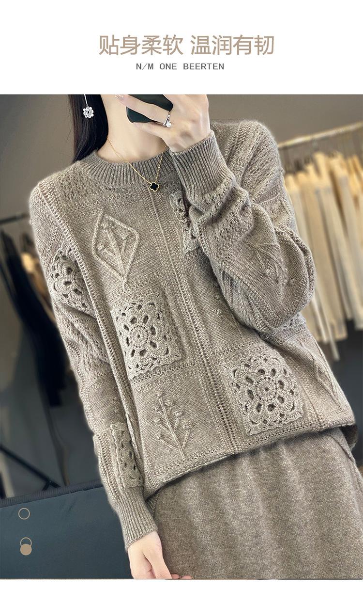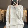 100% Lana Pura Otoño e Invierno 2025 Nuevo Tejido de Punto Base Jacquard de Color Puro de Manga Larga y Cuello Redondo Holgado para Mujer