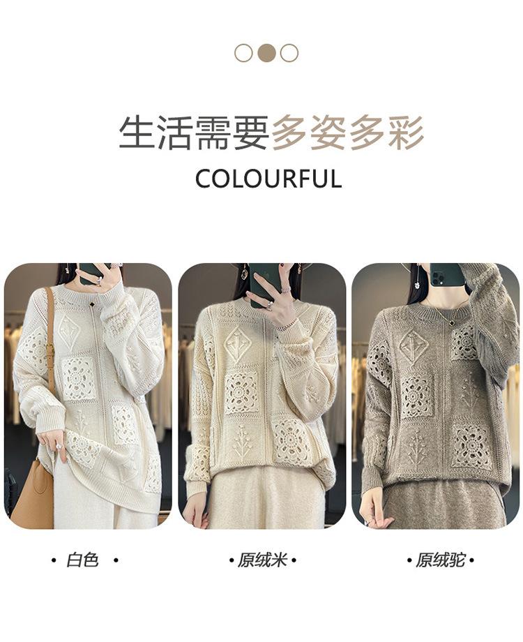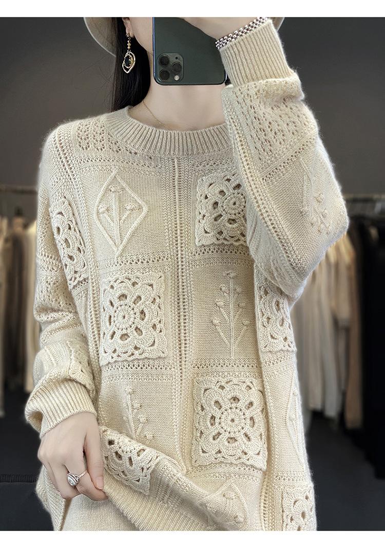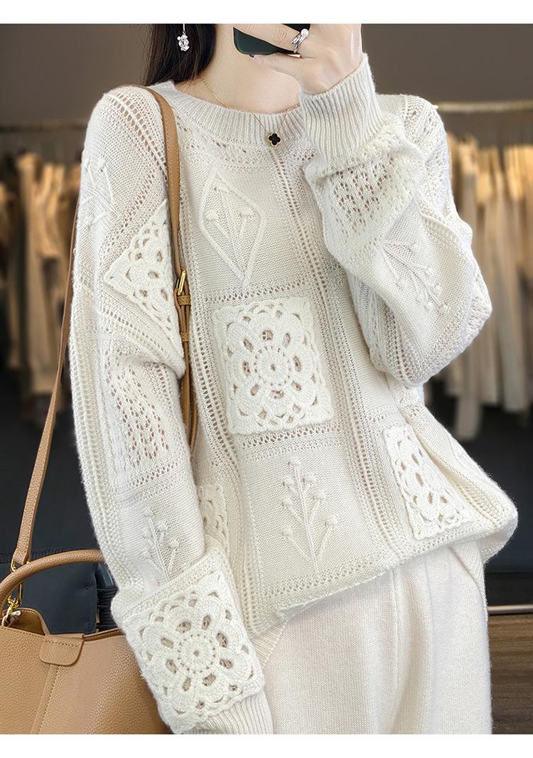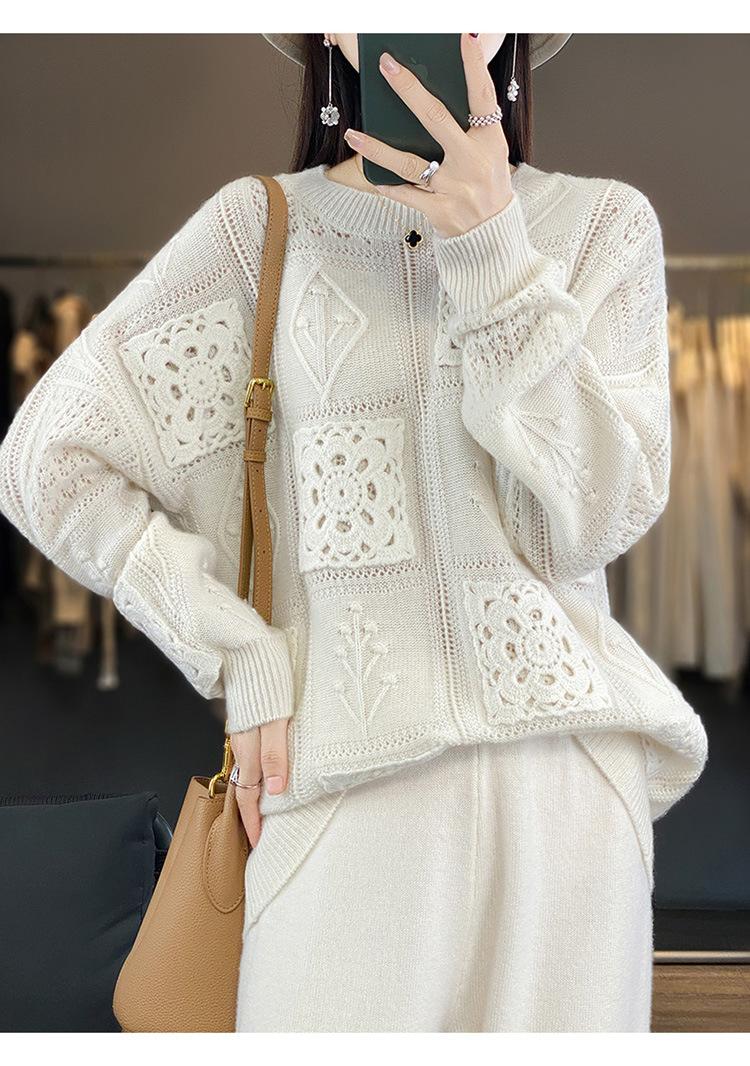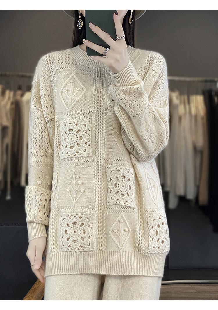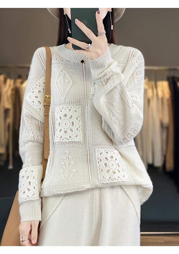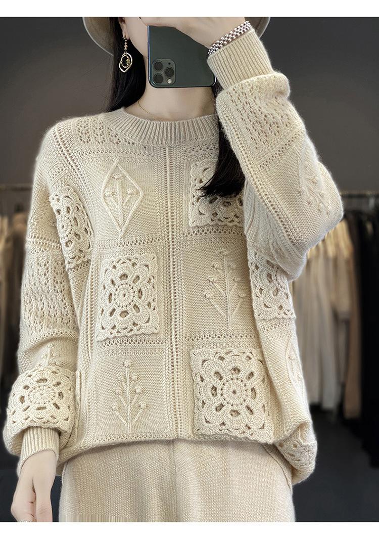 100% Lana Pura Otoño e Invierno 2025 Nuevo Tejido de Punto Base Jacquard de Color Puro de Manga Larga y Cuello Redondo Holgado para Mujer