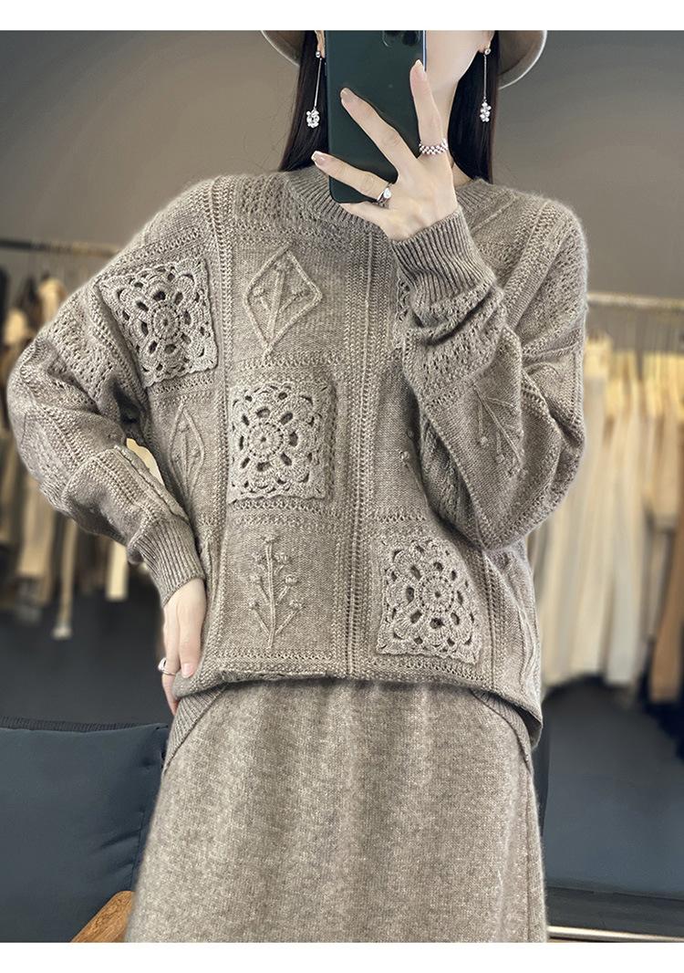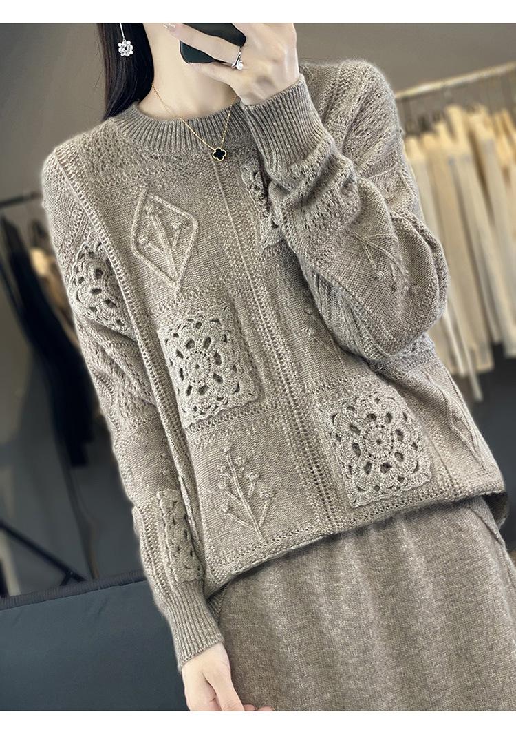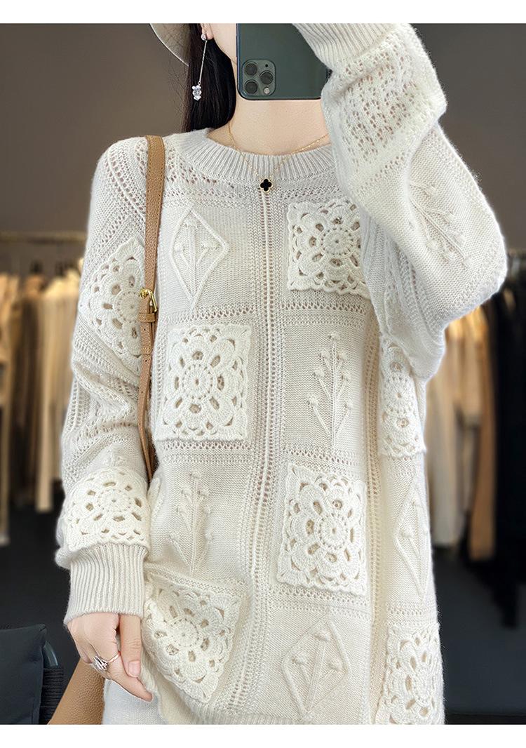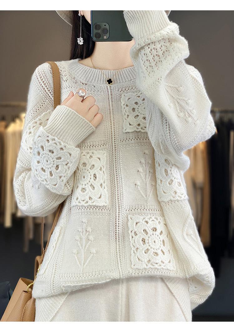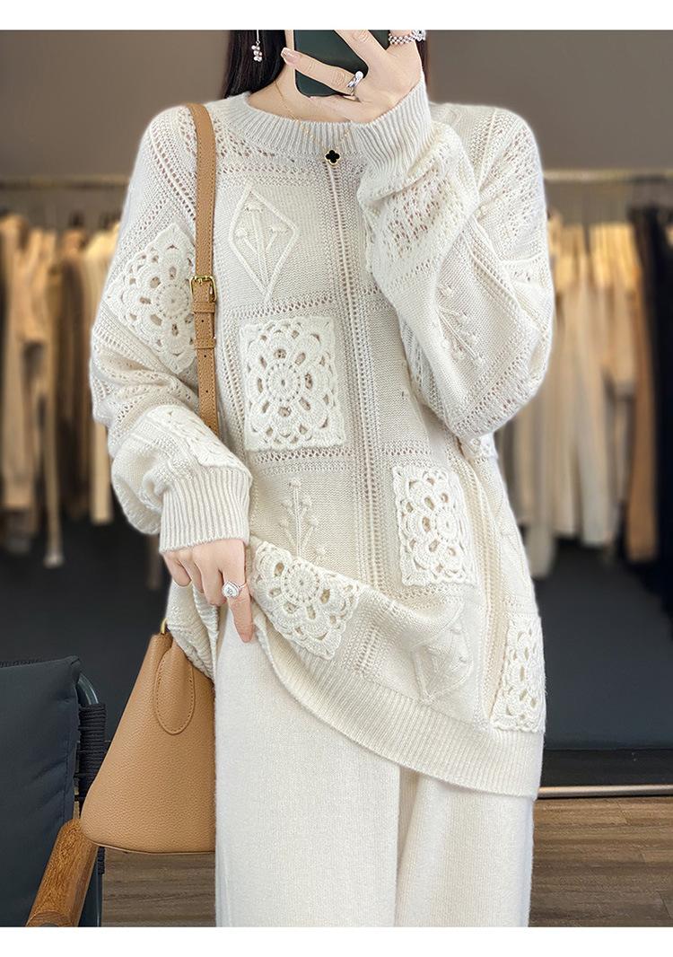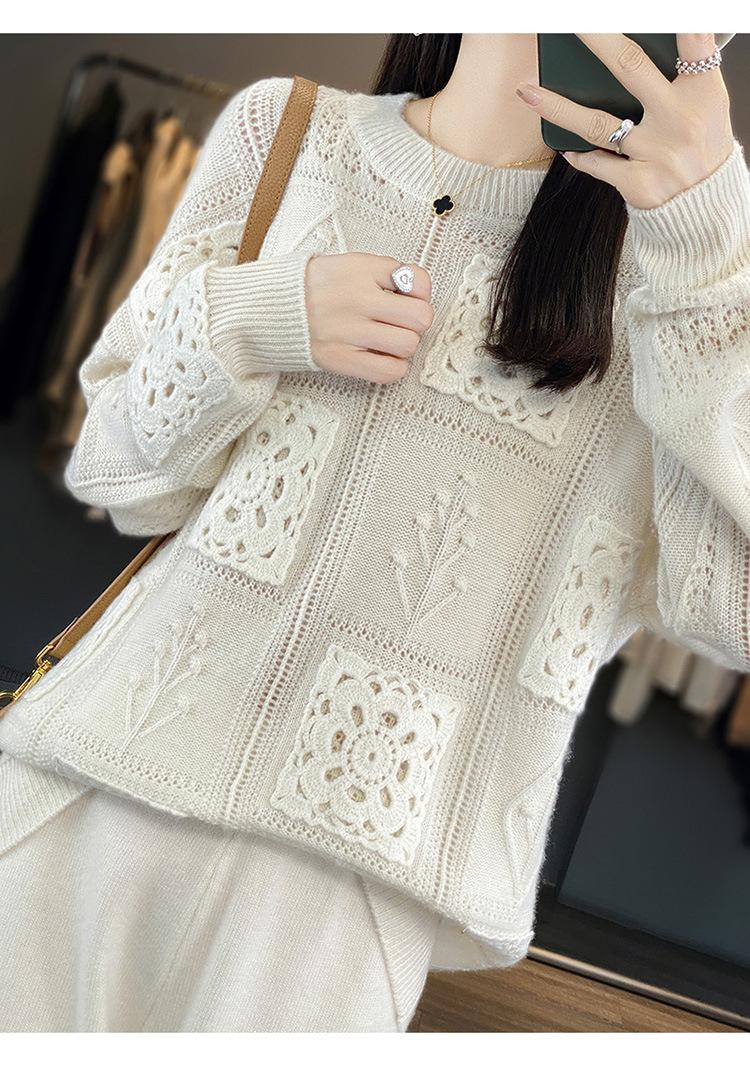 100% Lana Pura Otoño e Invierno 2025 Nuevo Tejido de Punto Base Jacquard de Color Puro de Manga Larga y Cuello Redondo Holgado para Mujer