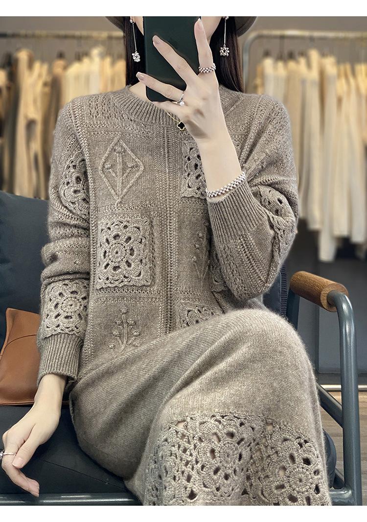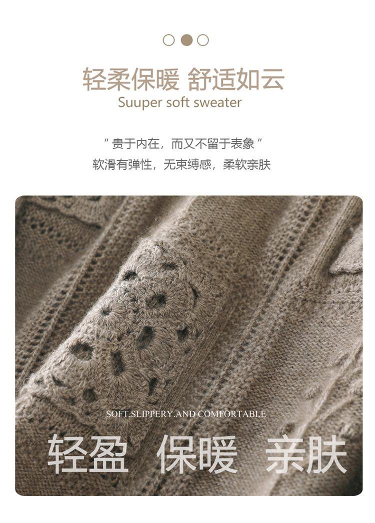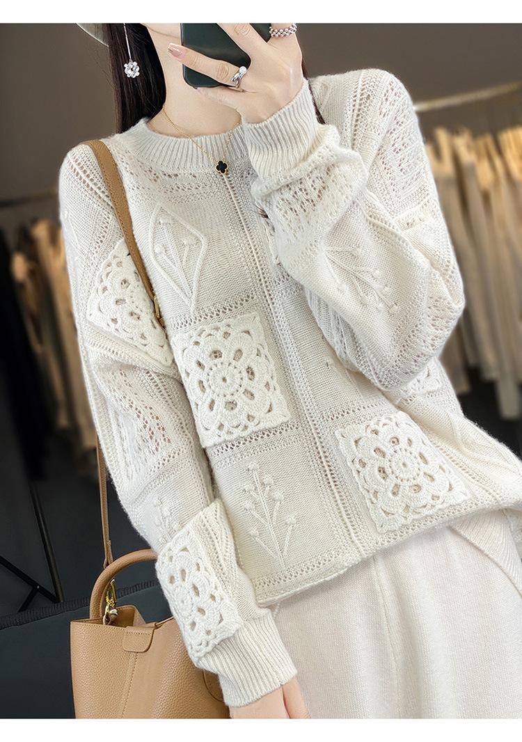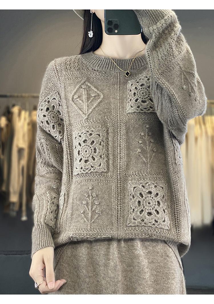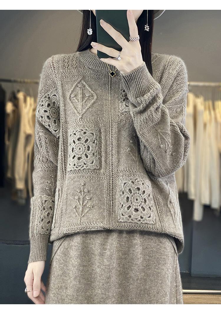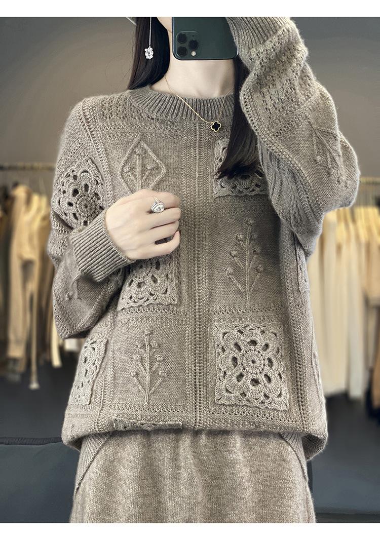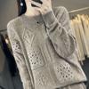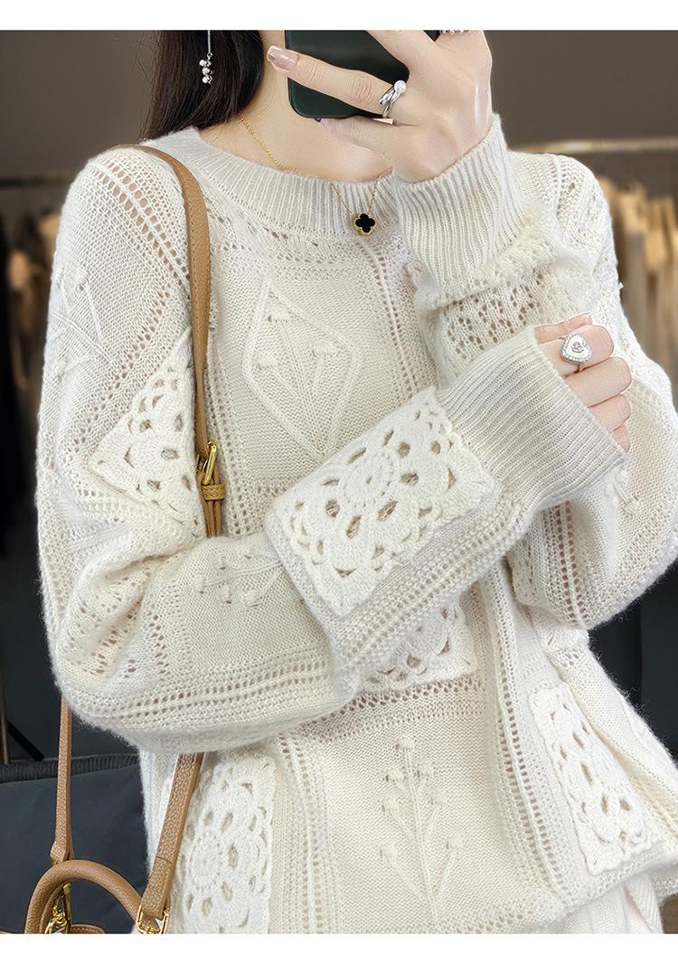 100% Lana Pura Otoño e Invierno 2025 Nuevo Tejido de Punto Base Jacquard de Color Puro de Manga Larga y Cuello Redondo Holgado para Mujer