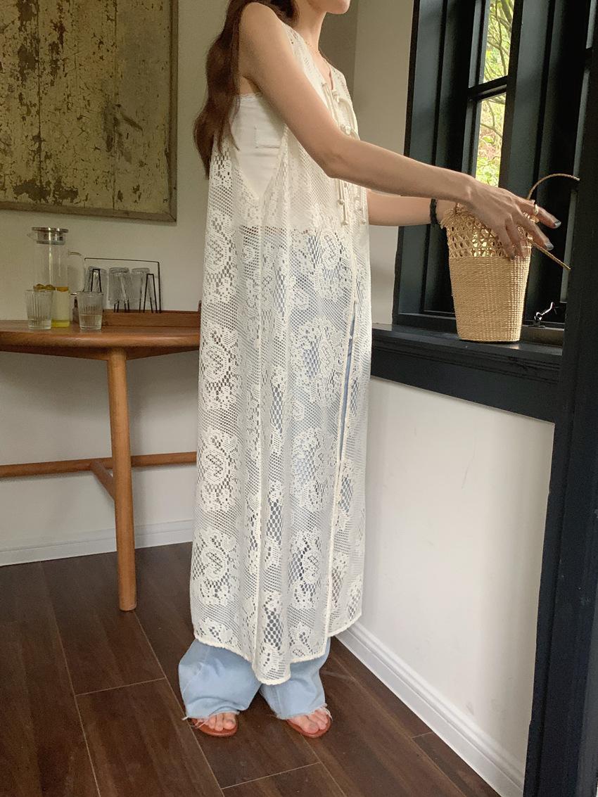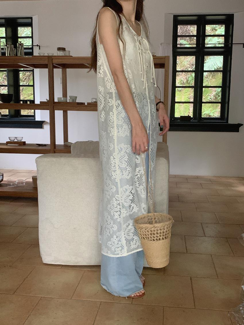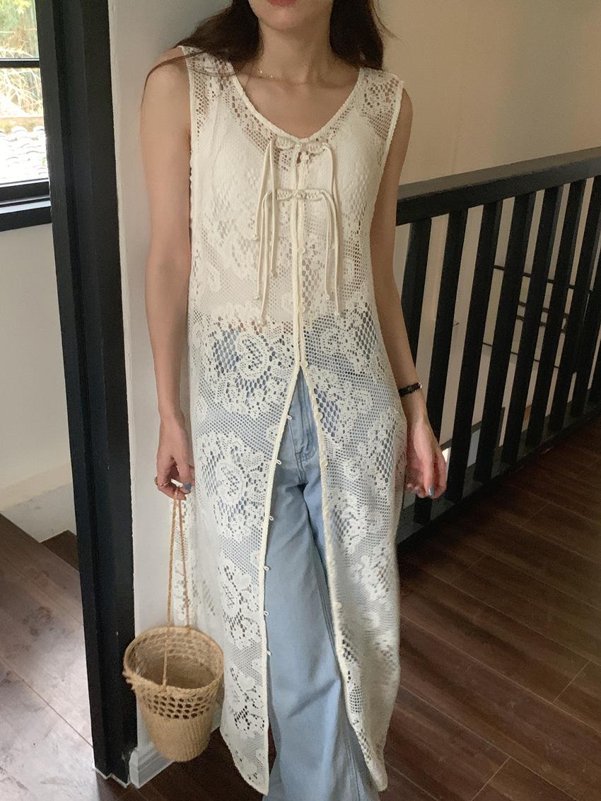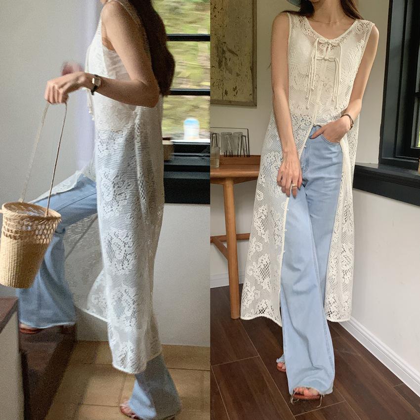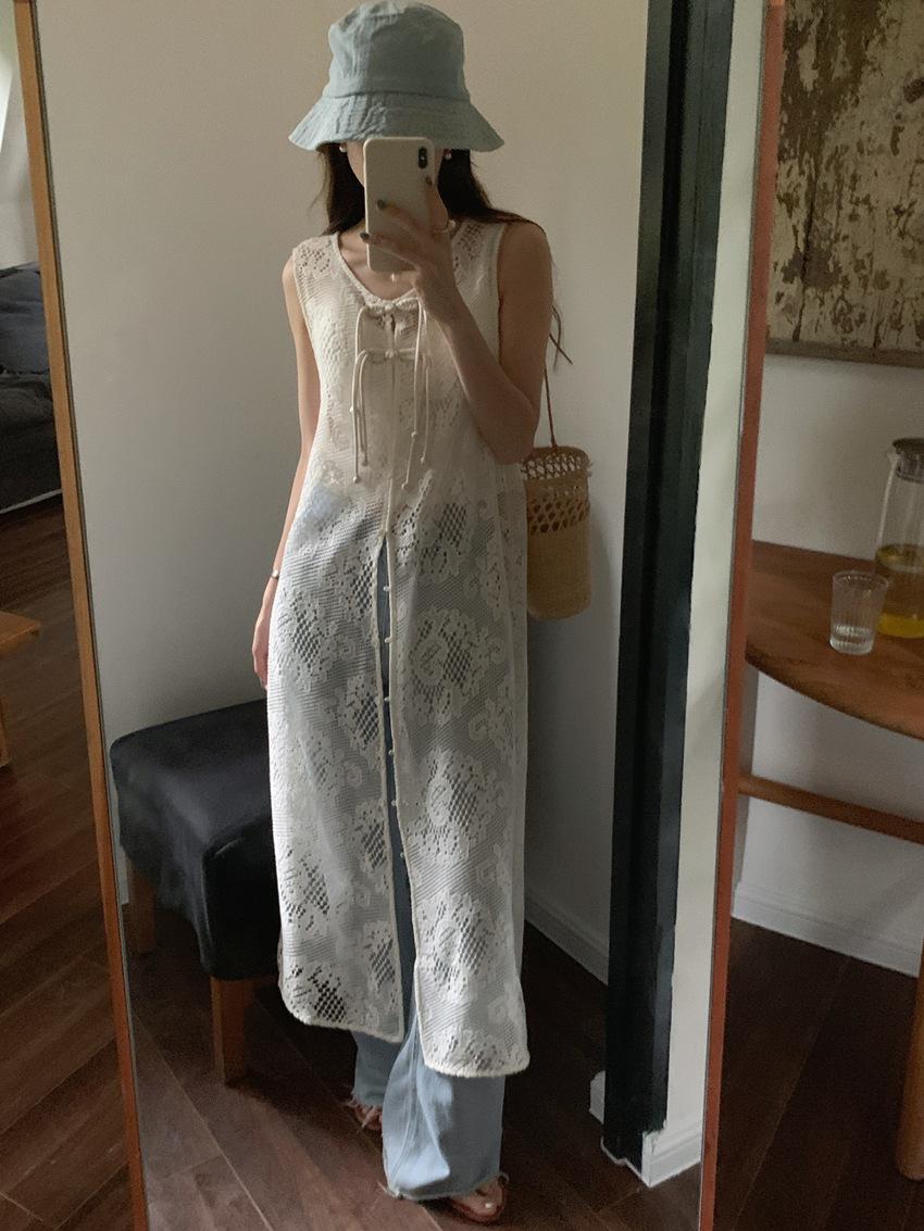 Foto Real de Vestido Chaleco sin Mangas de Diseño Nicho Nuevo Chinoiserie Hebilla Recorte Encaje Apilado Falda Larga para Mujer