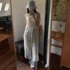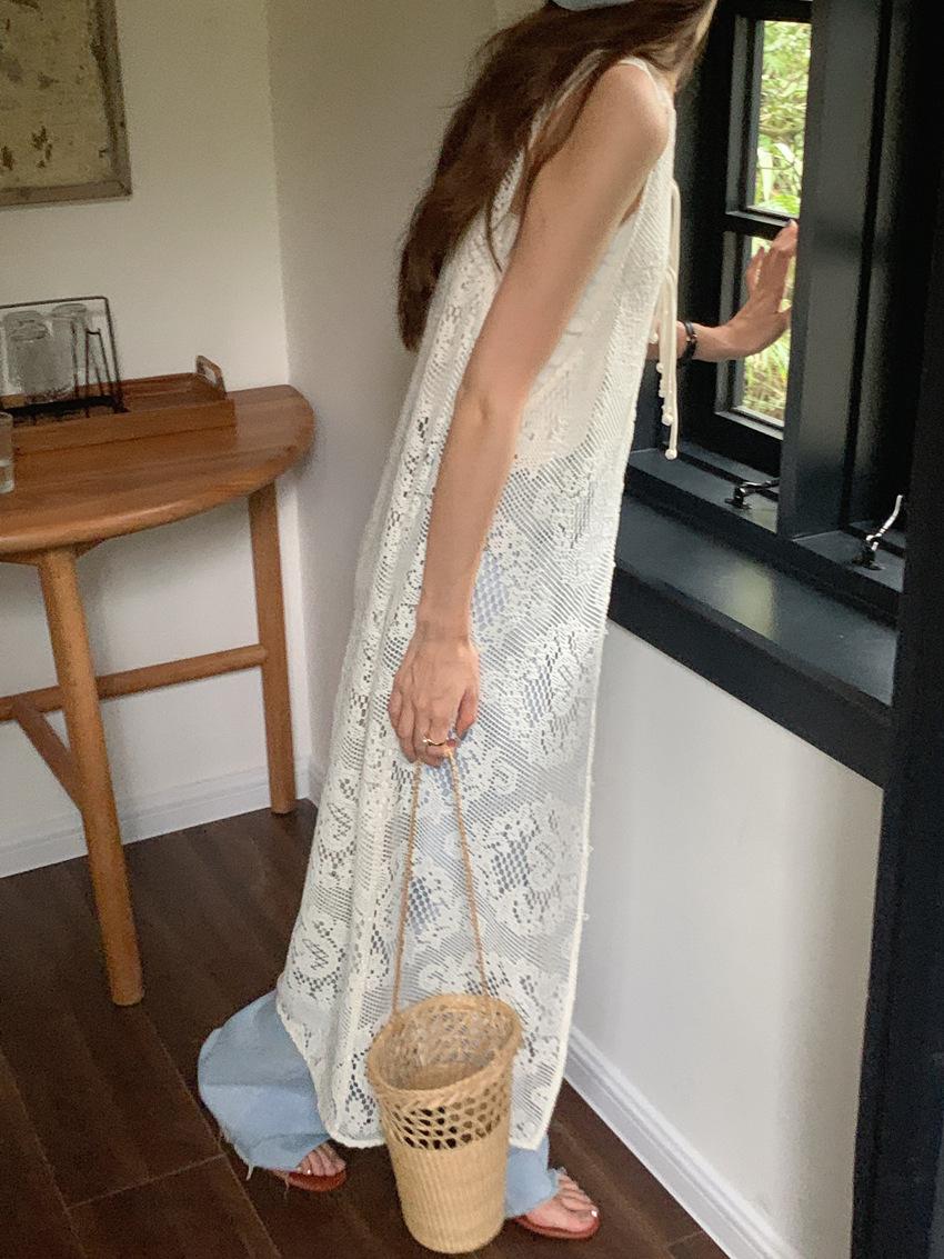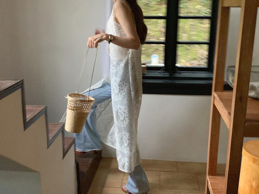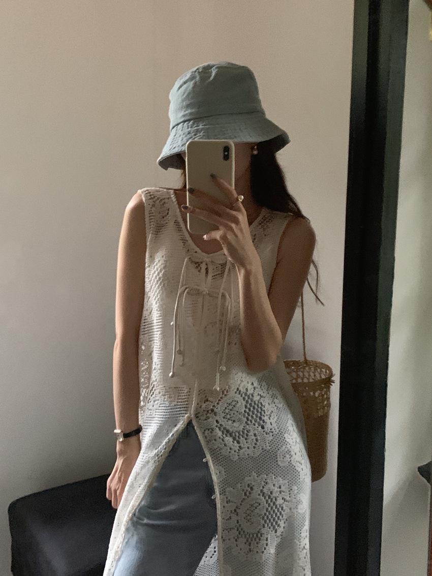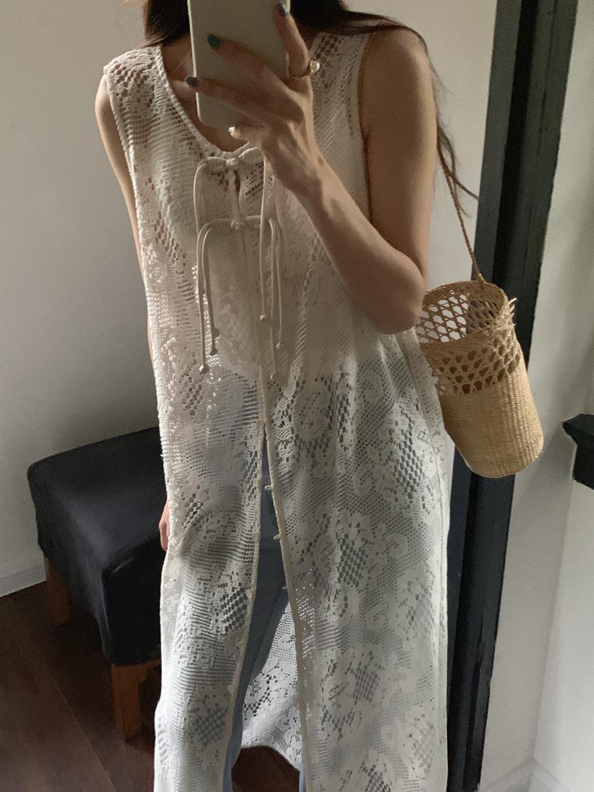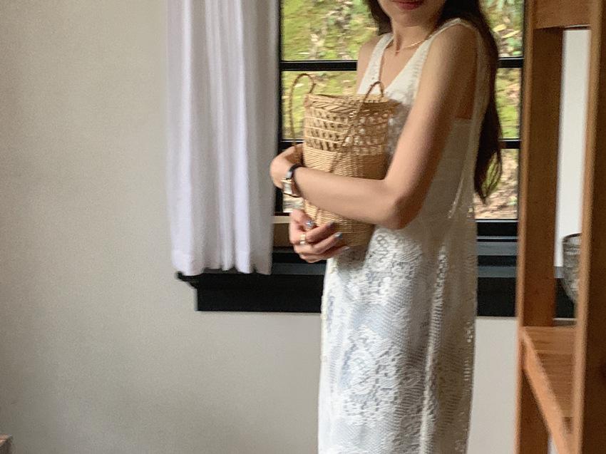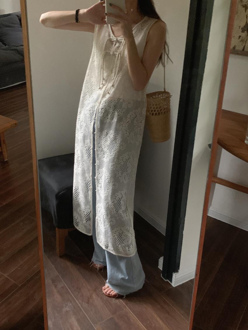 Foto Real de Vestido Chaleco sin Mangas de Diseño Nicho Nuevo Chinoiserie Hebilla Recorte Encaje Apilado Falda Larga para Mujer