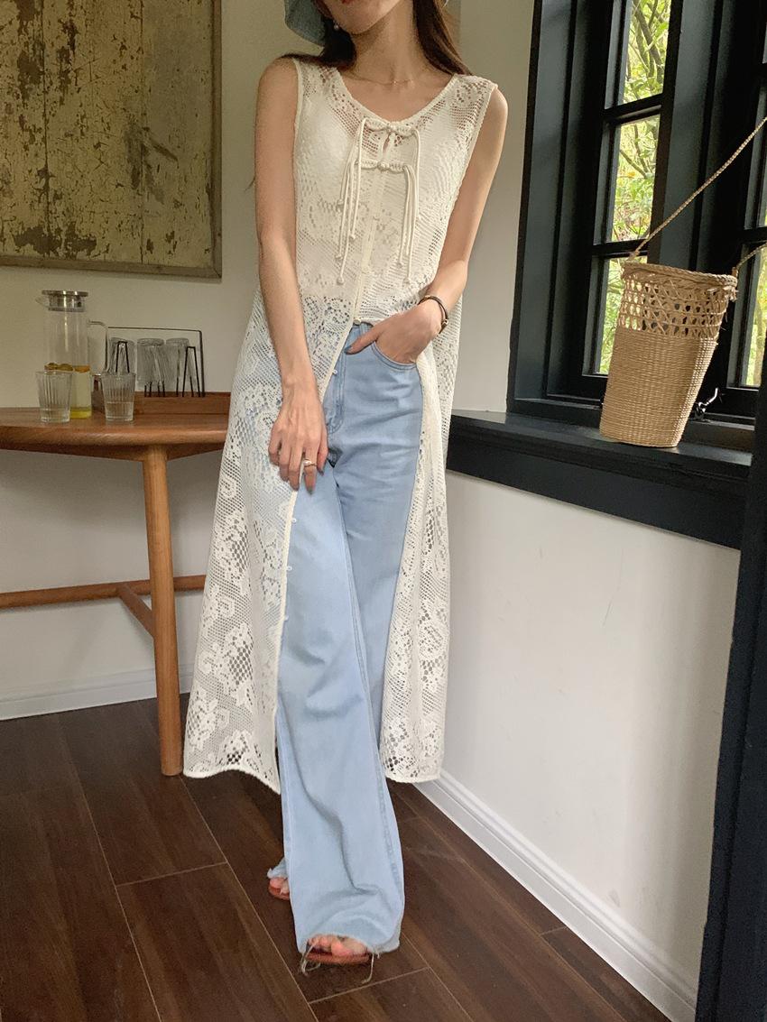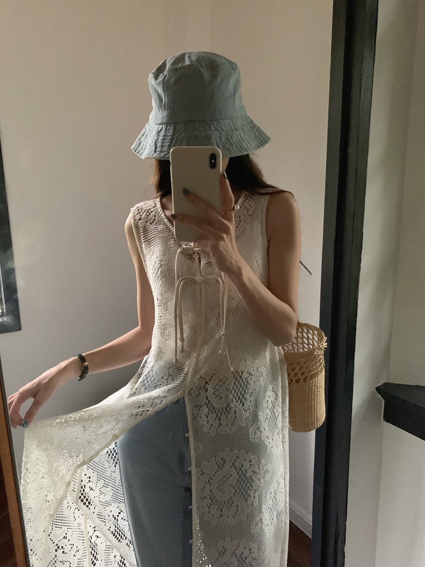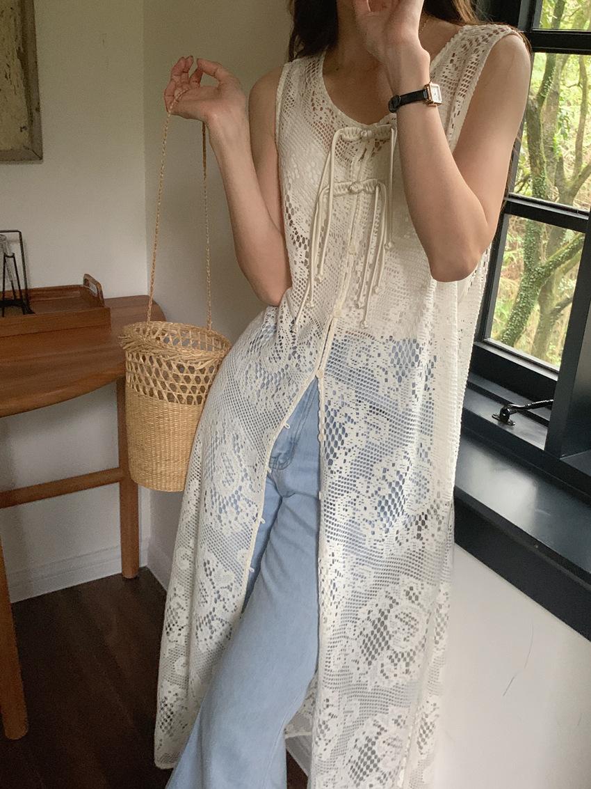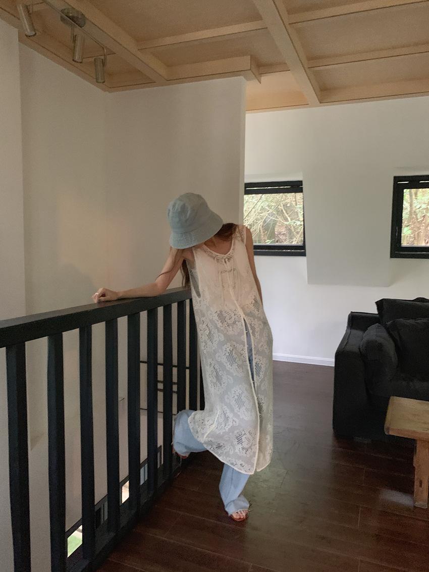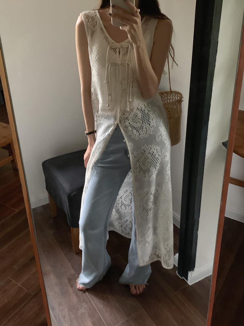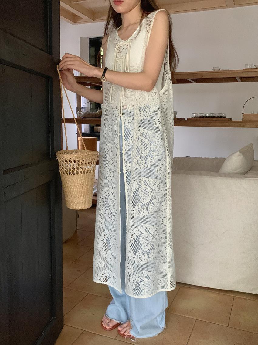 Foto Real de Vestido Chaleco sin Mangas de Diseño Nicho Nuevo Chinoiserie Hebilla Recorte Encaje Apilado Falda Larga para Mujer