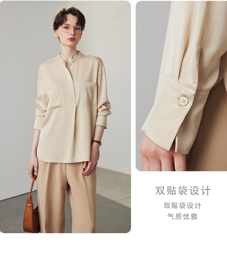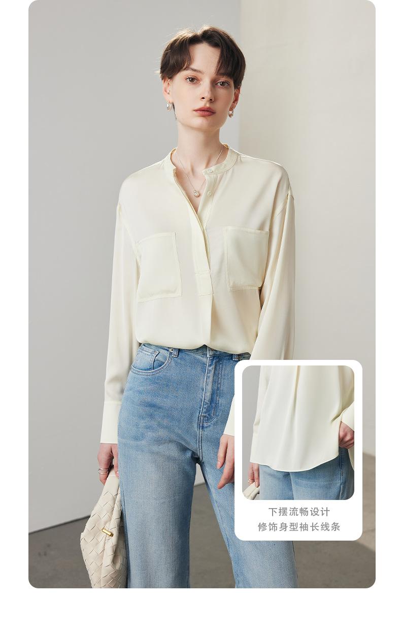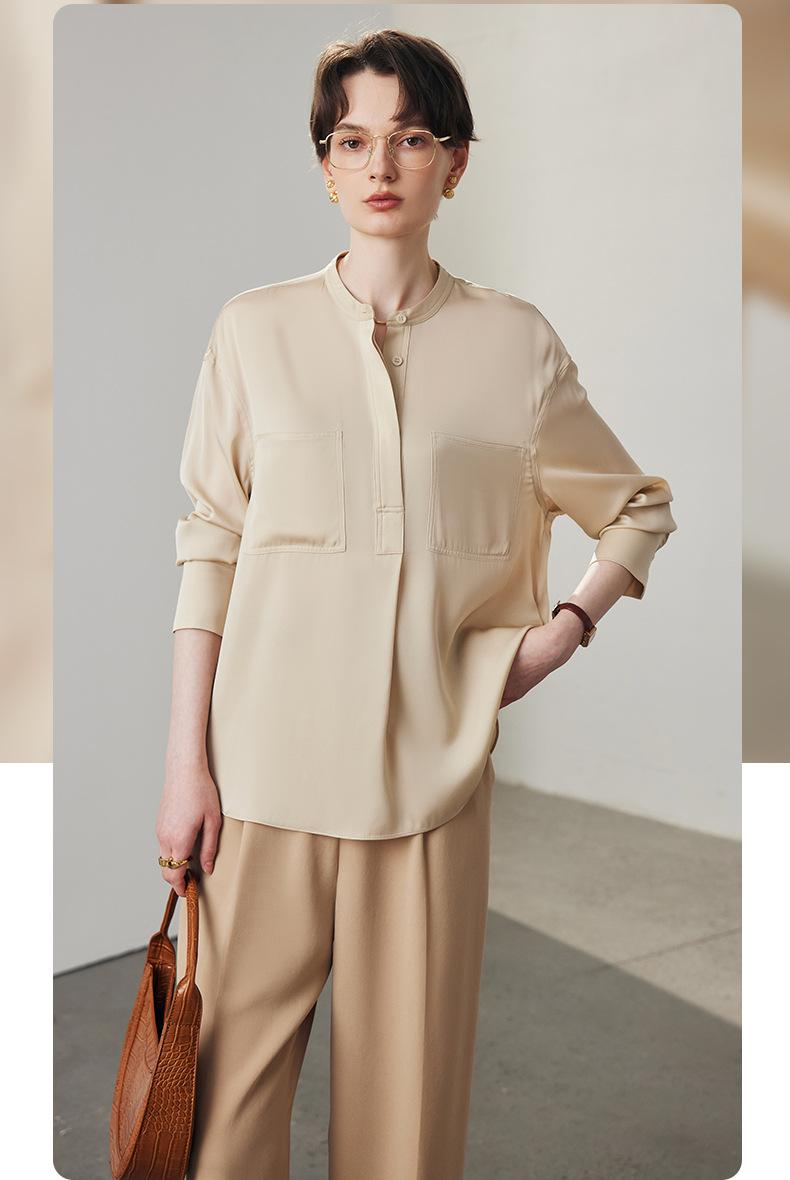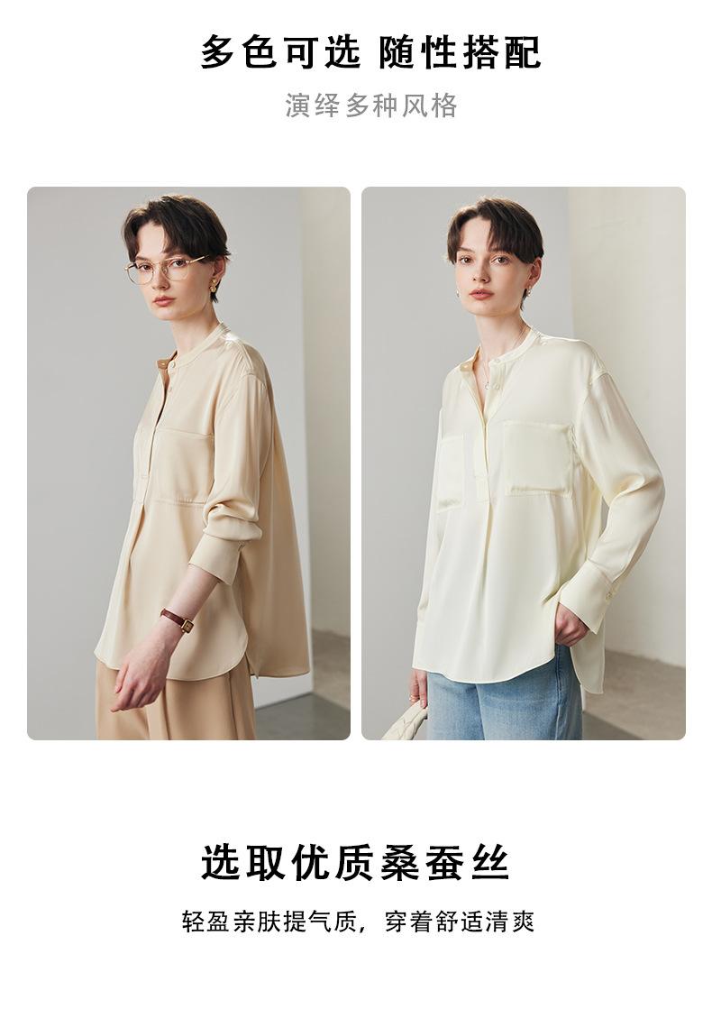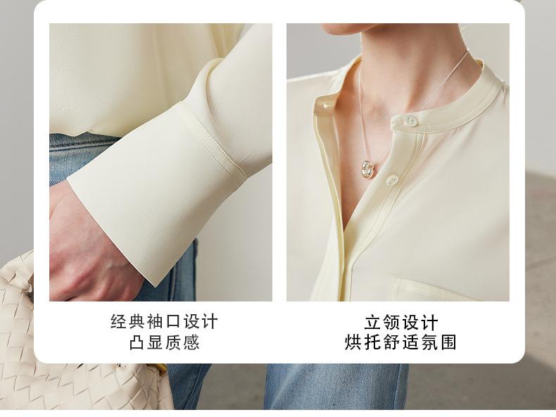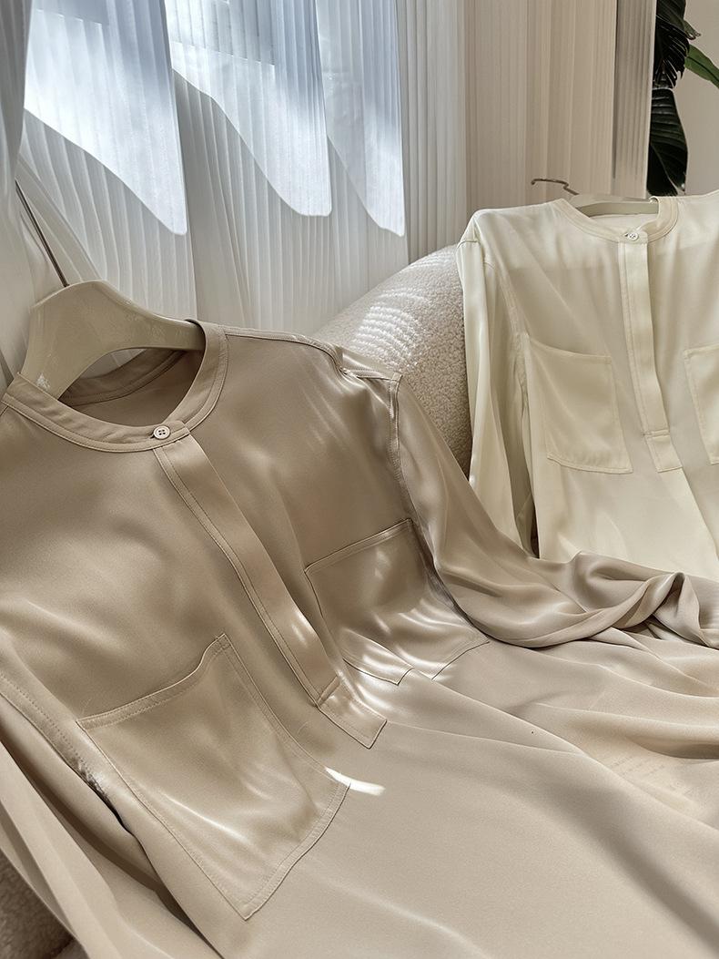Camisa de Seda para Mujer 2025 Primavera y Verano Nueva Versión Amplia Suelta Color Puro Cuello Mao Manga Larga Commuter Top de Seda de Morera