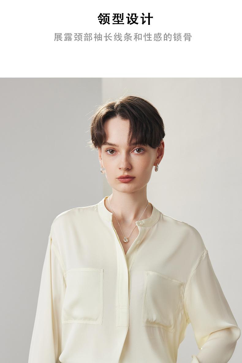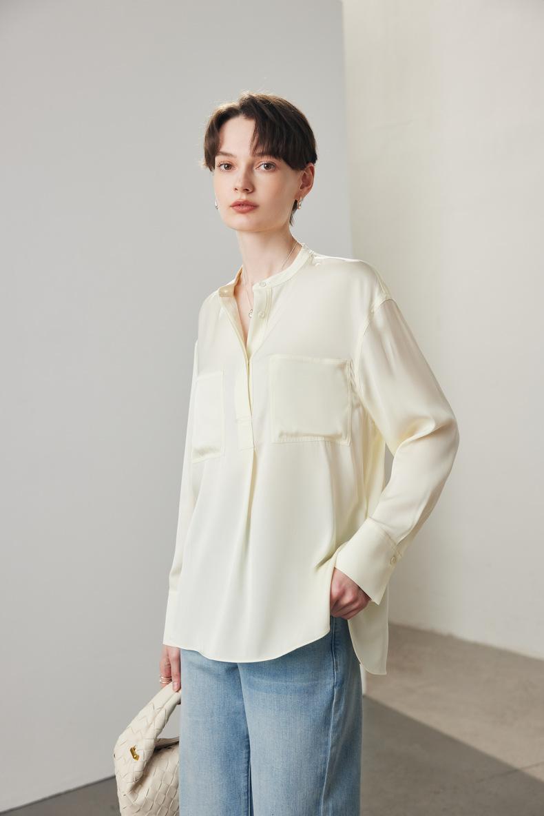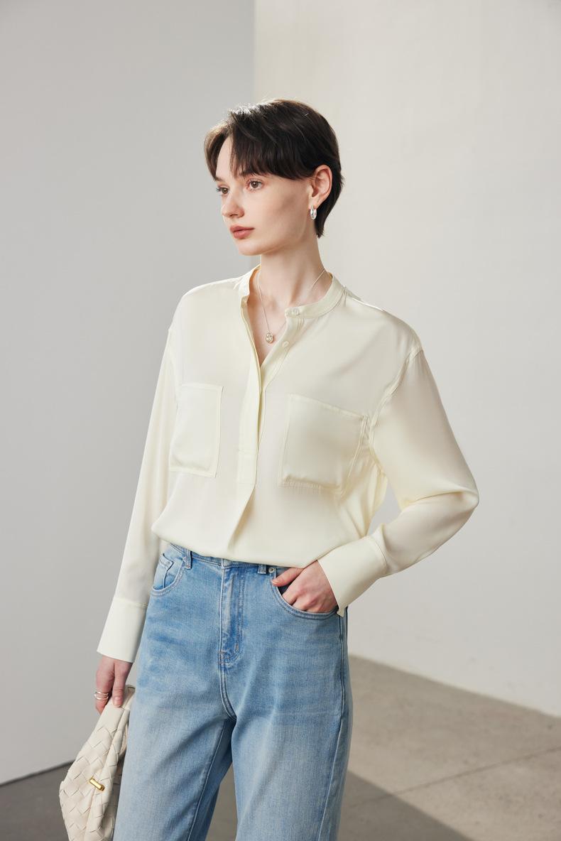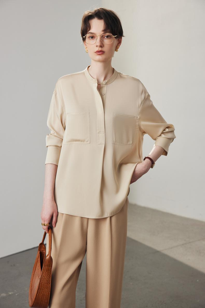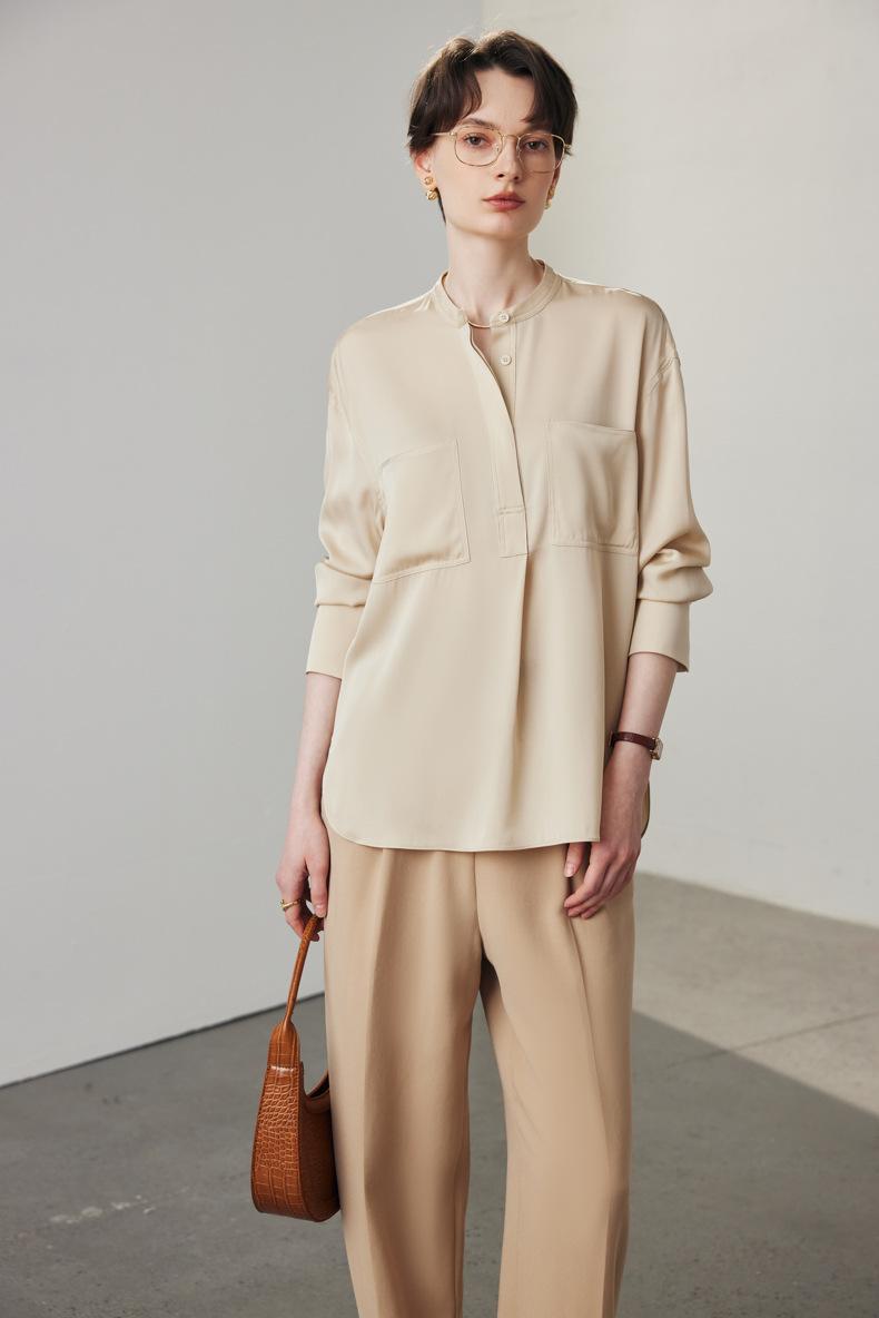 Camisa de Seda para Mujer 2025 Primavera y Verano Nueva Versión Amplia Suelta Color Puro Cuello Mao Manga Larga Commuter Top de Seda de Morera