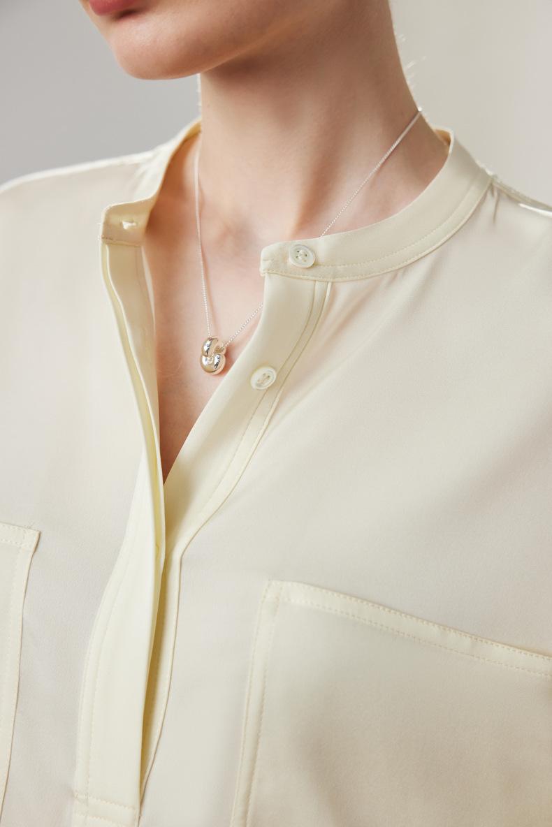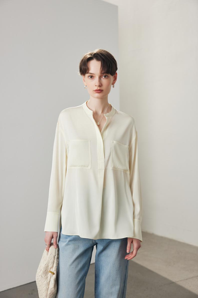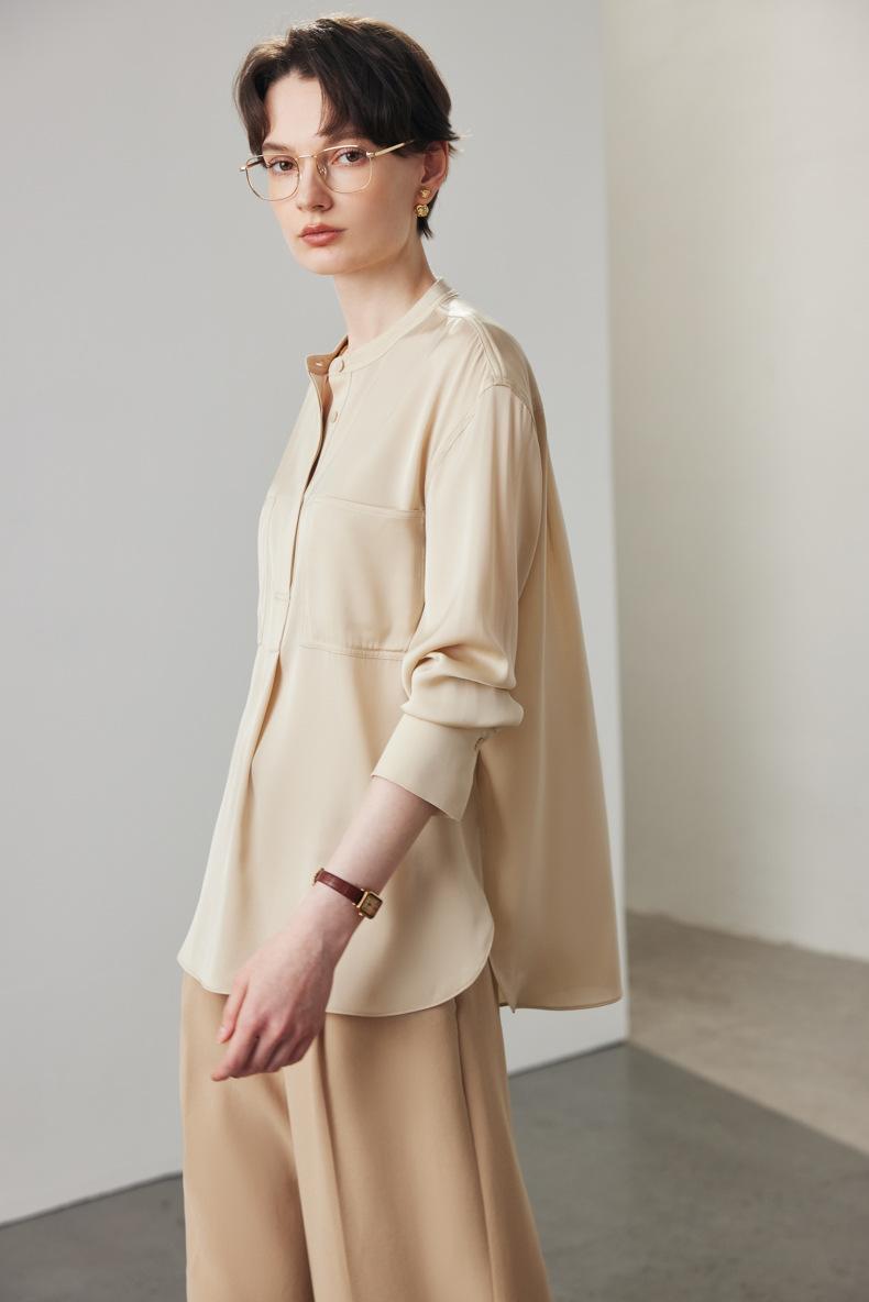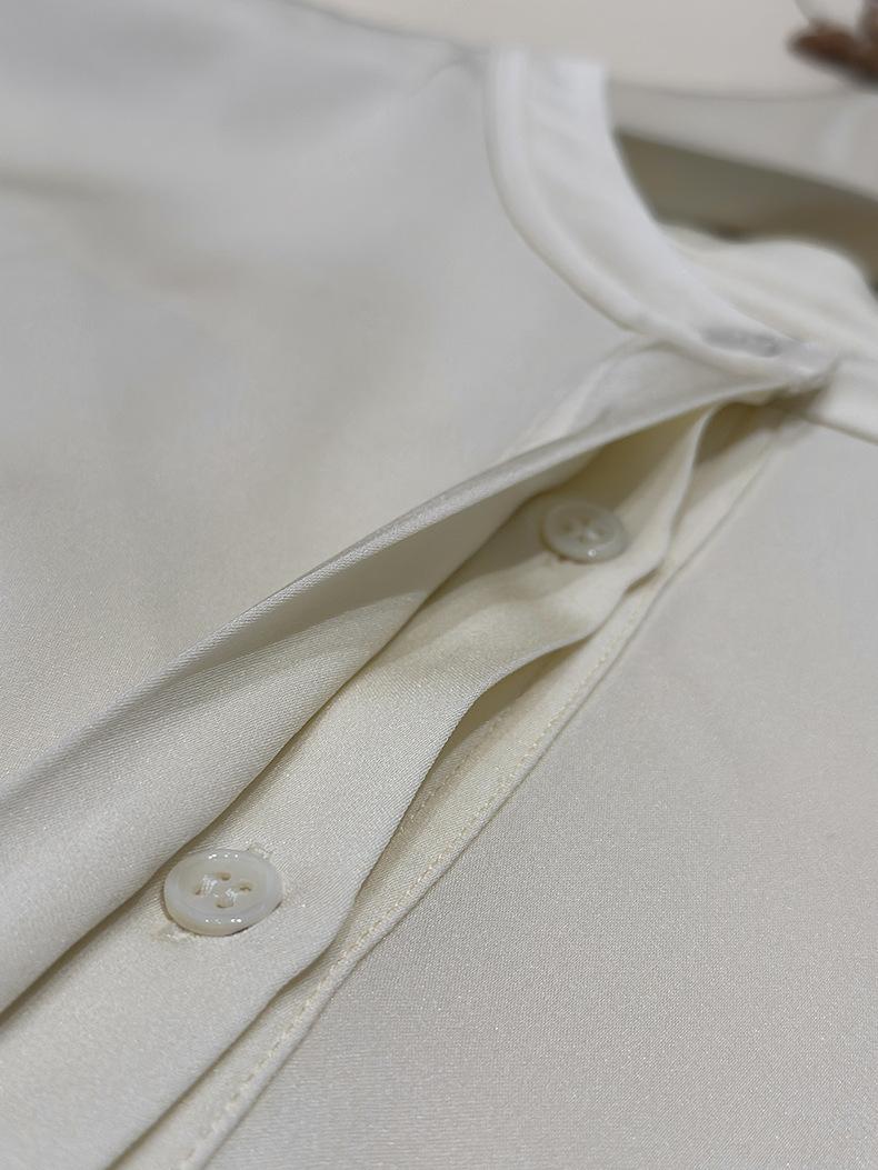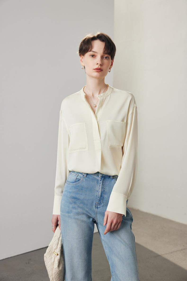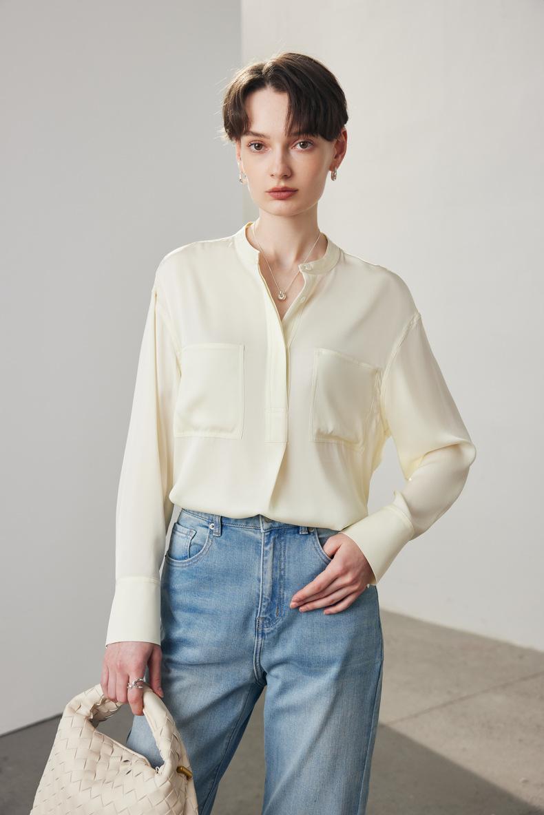 Camisa de Seda para Mujer 2025 Primavera y Verano Nueva Versión Amplia Suelta Color Puro Cuello Mao Manga Larga Commuter Top de Seda de Morera