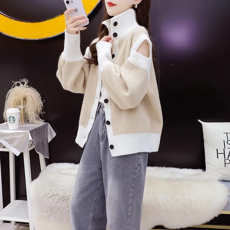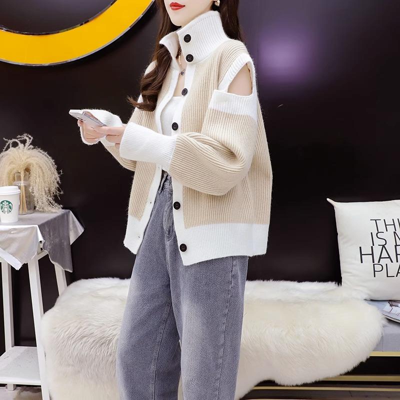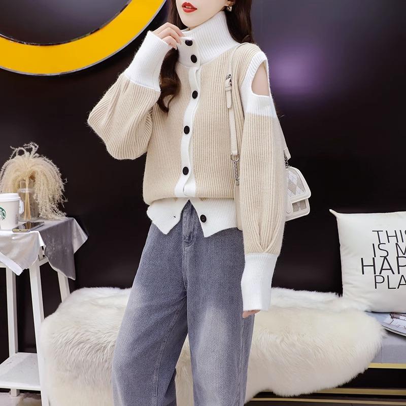 Suéter de cuello alto y hombros descubiertos para mujer, cárdigan holgado coreano de punto, camisa de manga larga, diseño de nicho, 2024