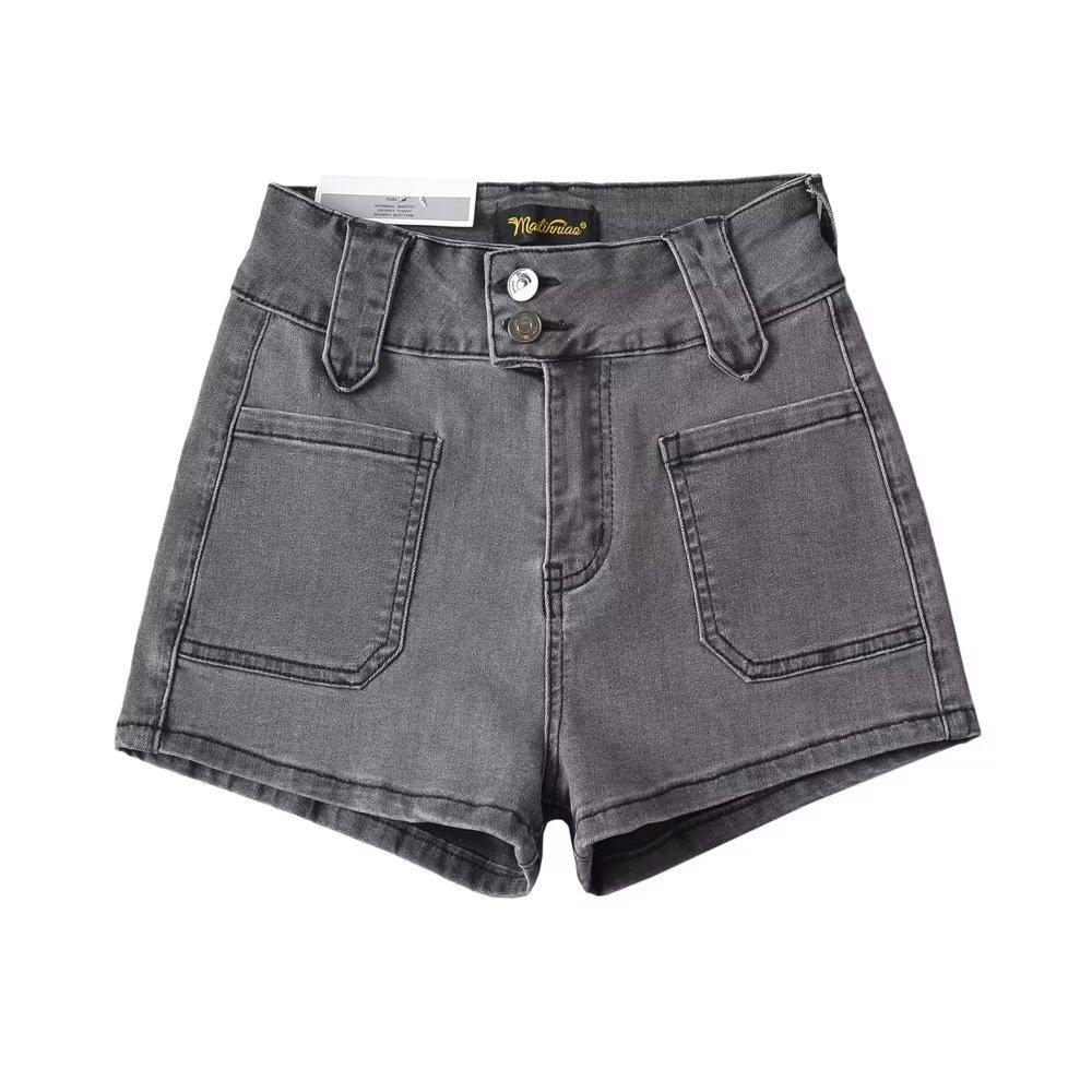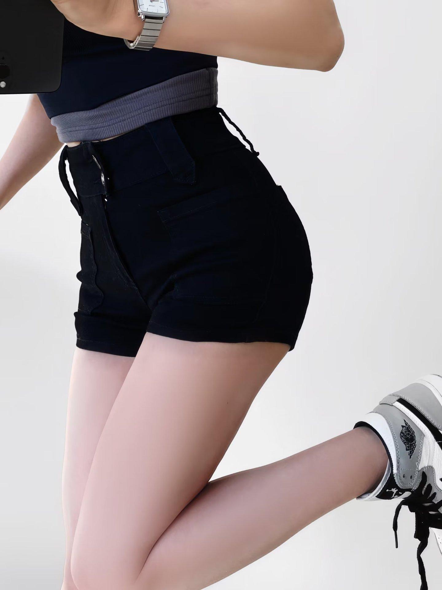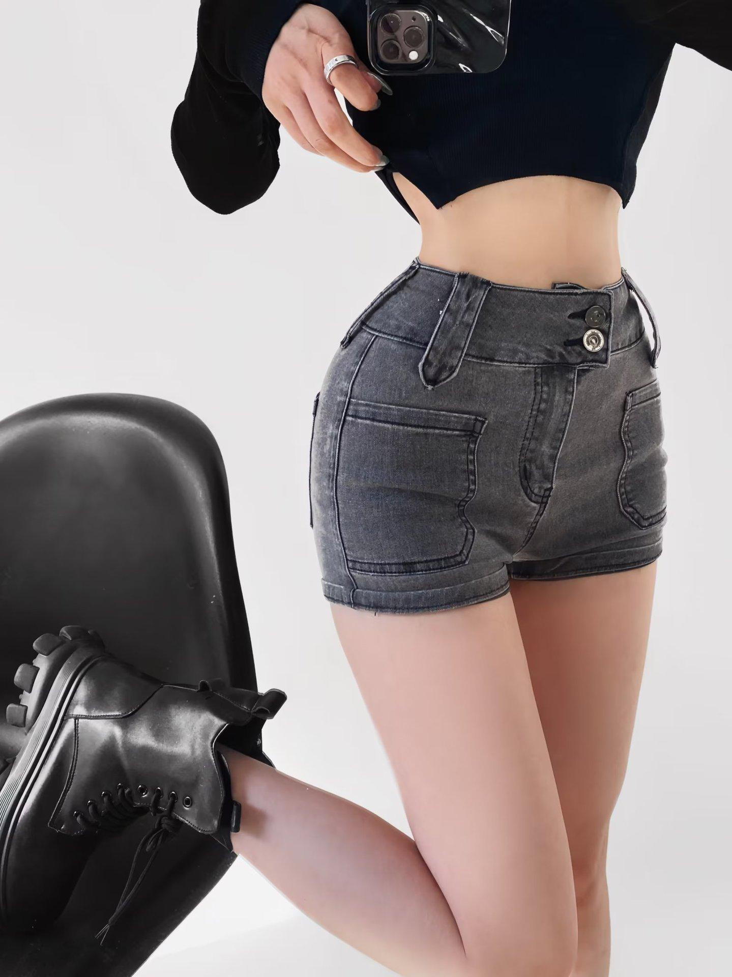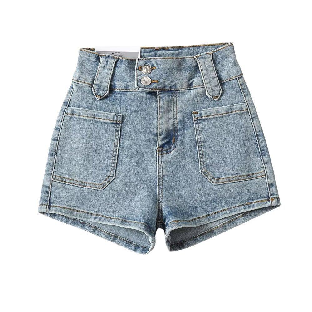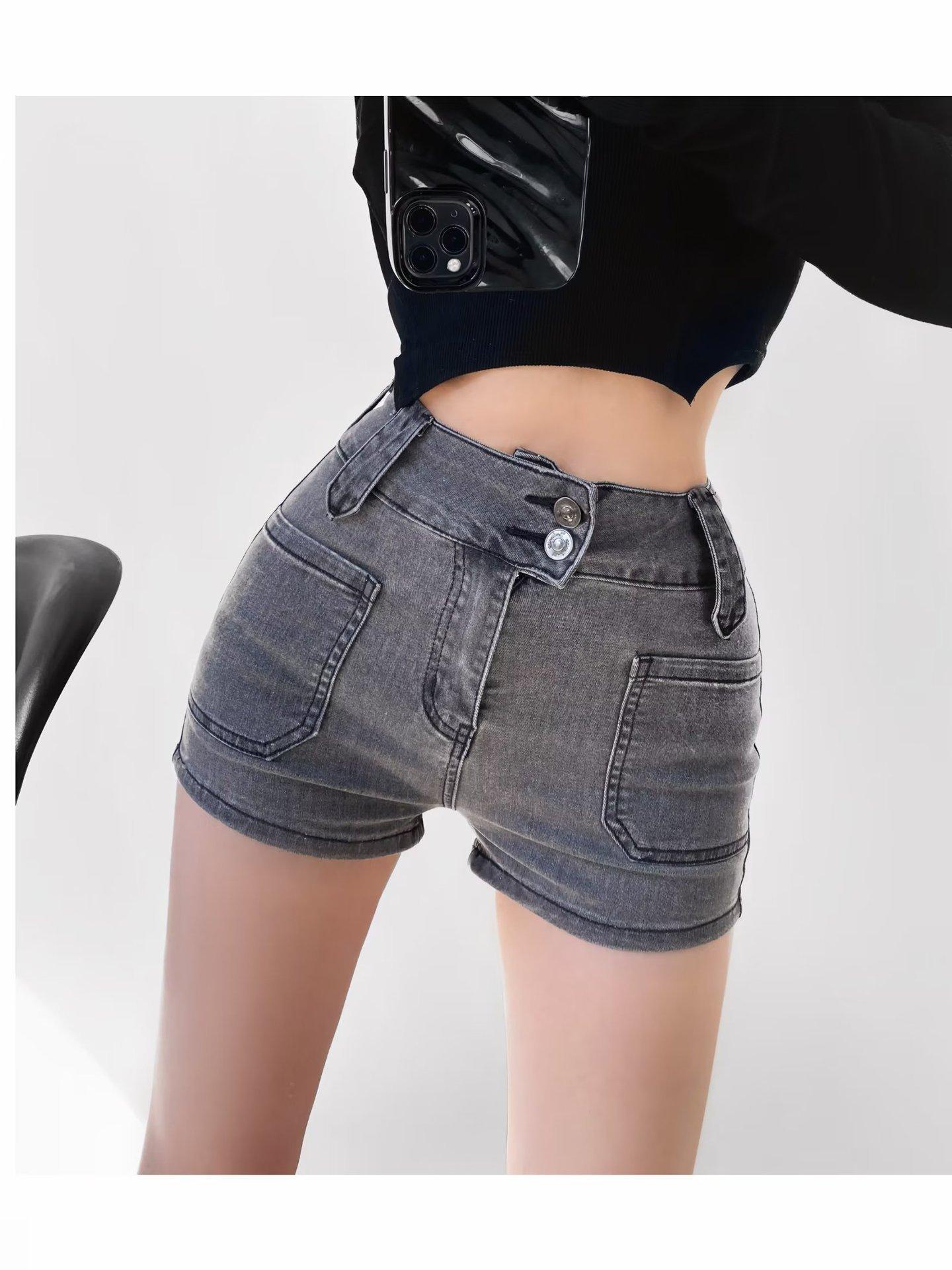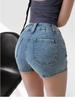 Pantalones cortos vaqueros elásticos de cintura alta para mujer, sexys, de verano 2023, estilo europeo y americano, con doble bolsillo en la cadera.