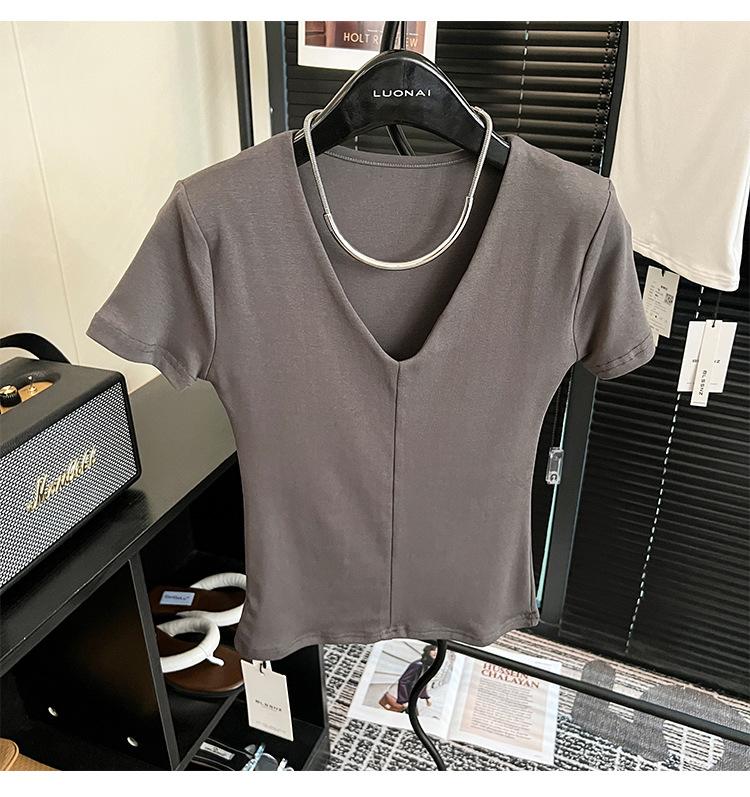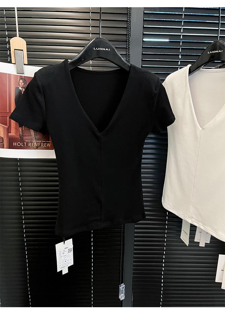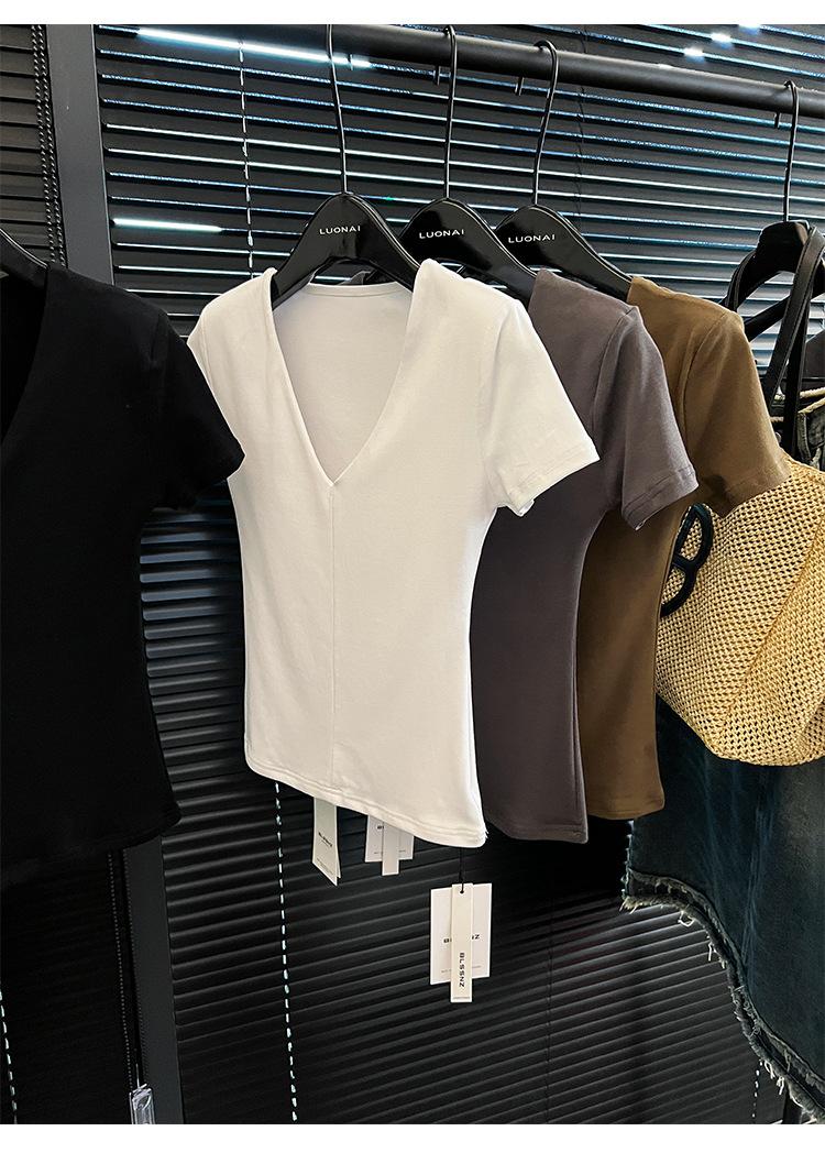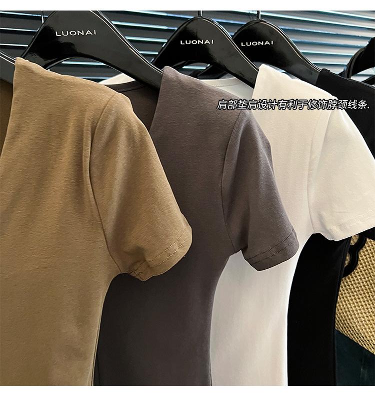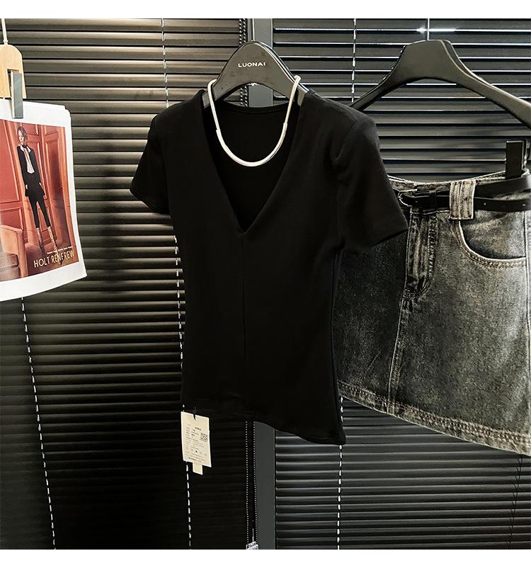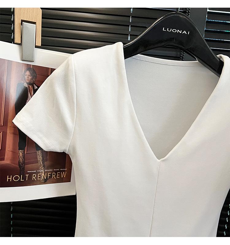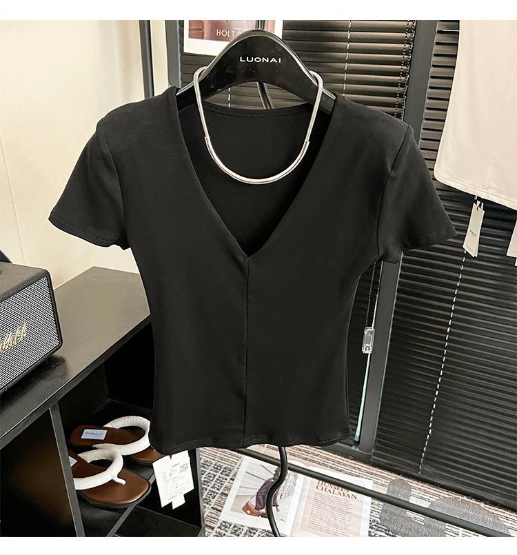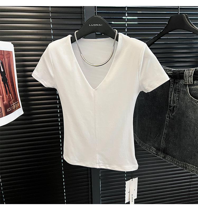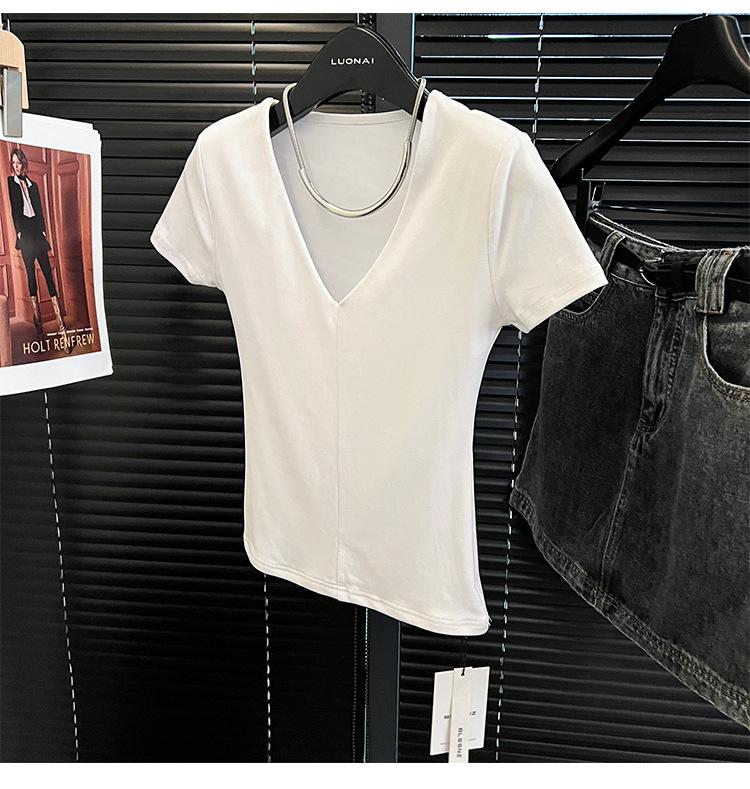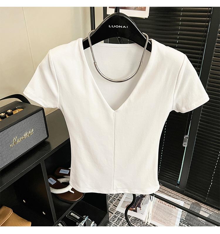 Camiseta blanca de manga corta con cuello en V europeo para mujer, novedad de verano 2023, con hombreras y parte superior interior de media manga, a la moda