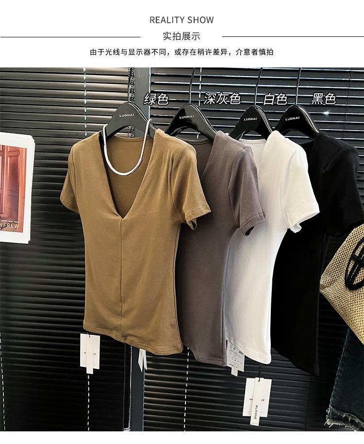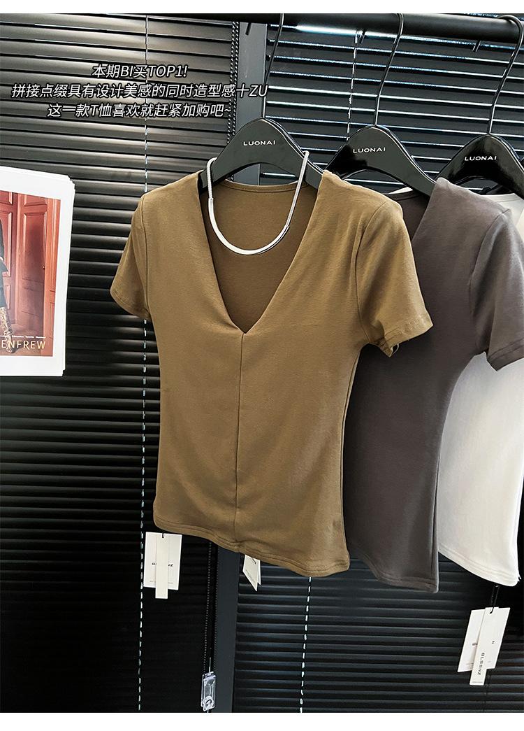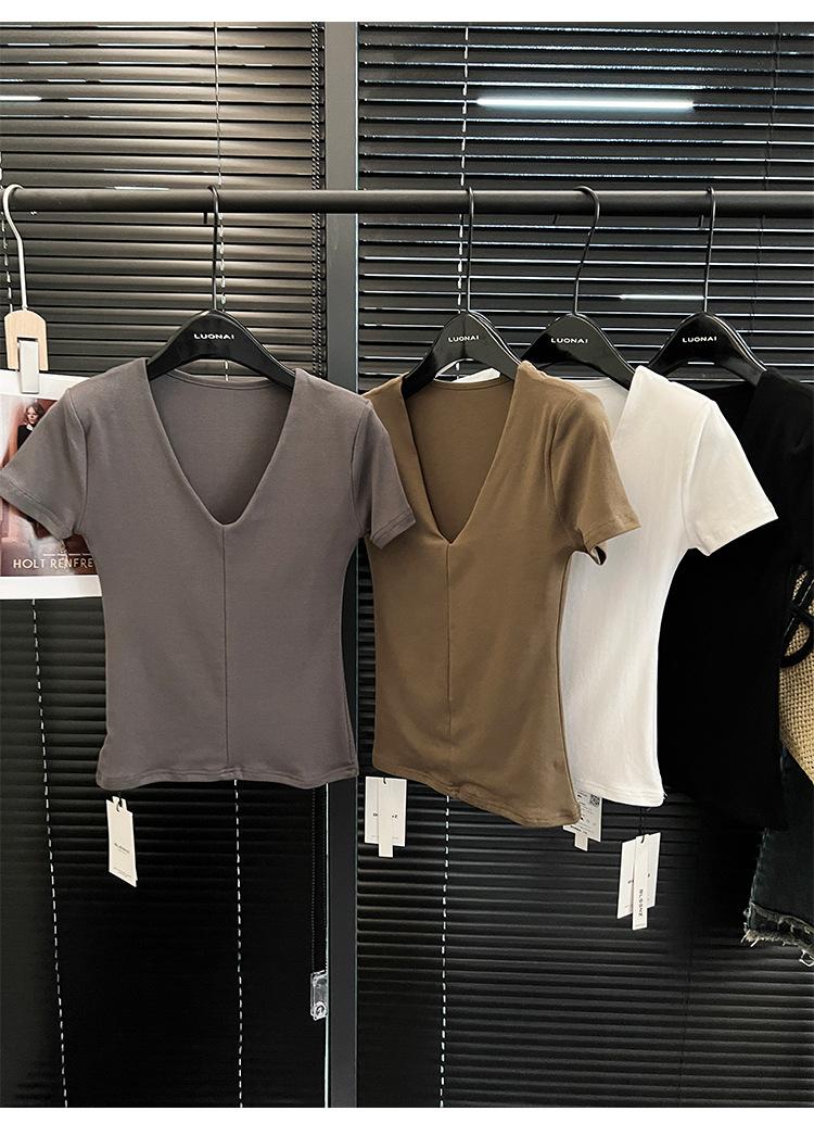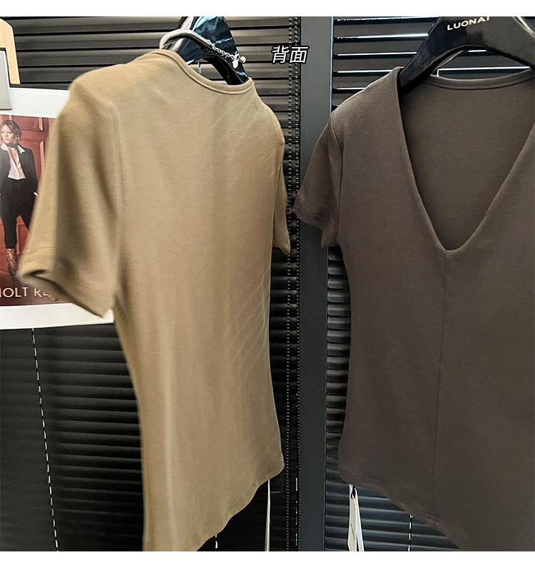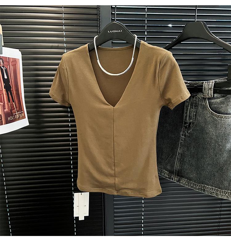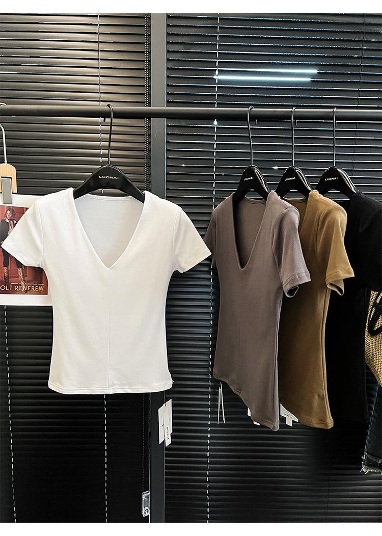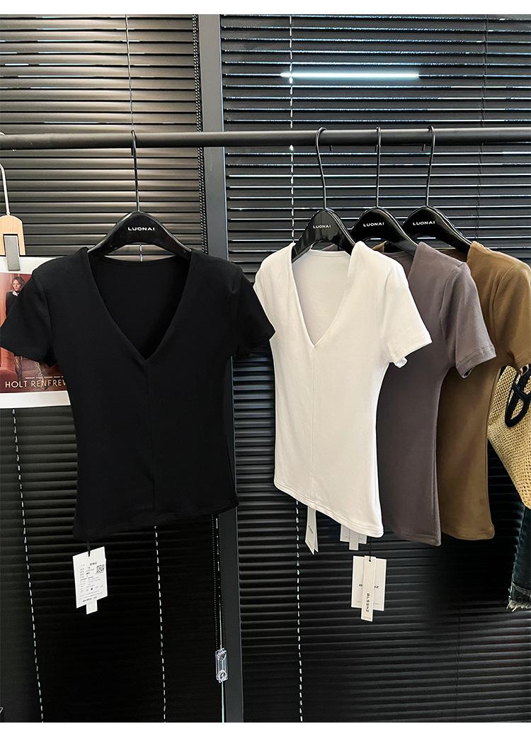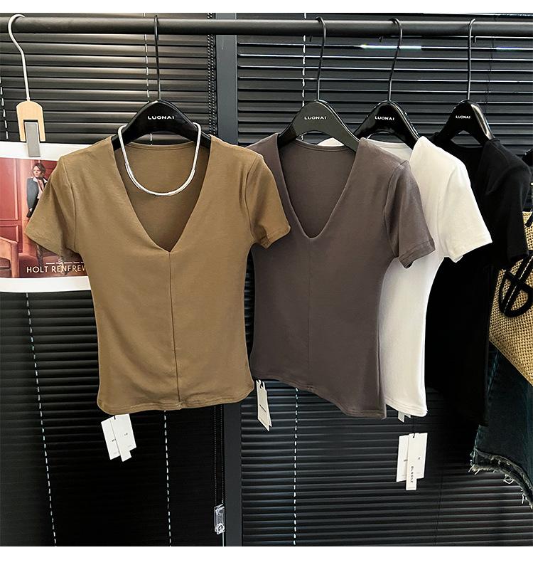 Camiseta blanca de manga corta con cuello en V europeo para mujer, novedad de verano 2023, con hombreras y parte superior interior de media manga, a la moda