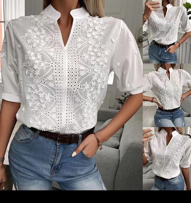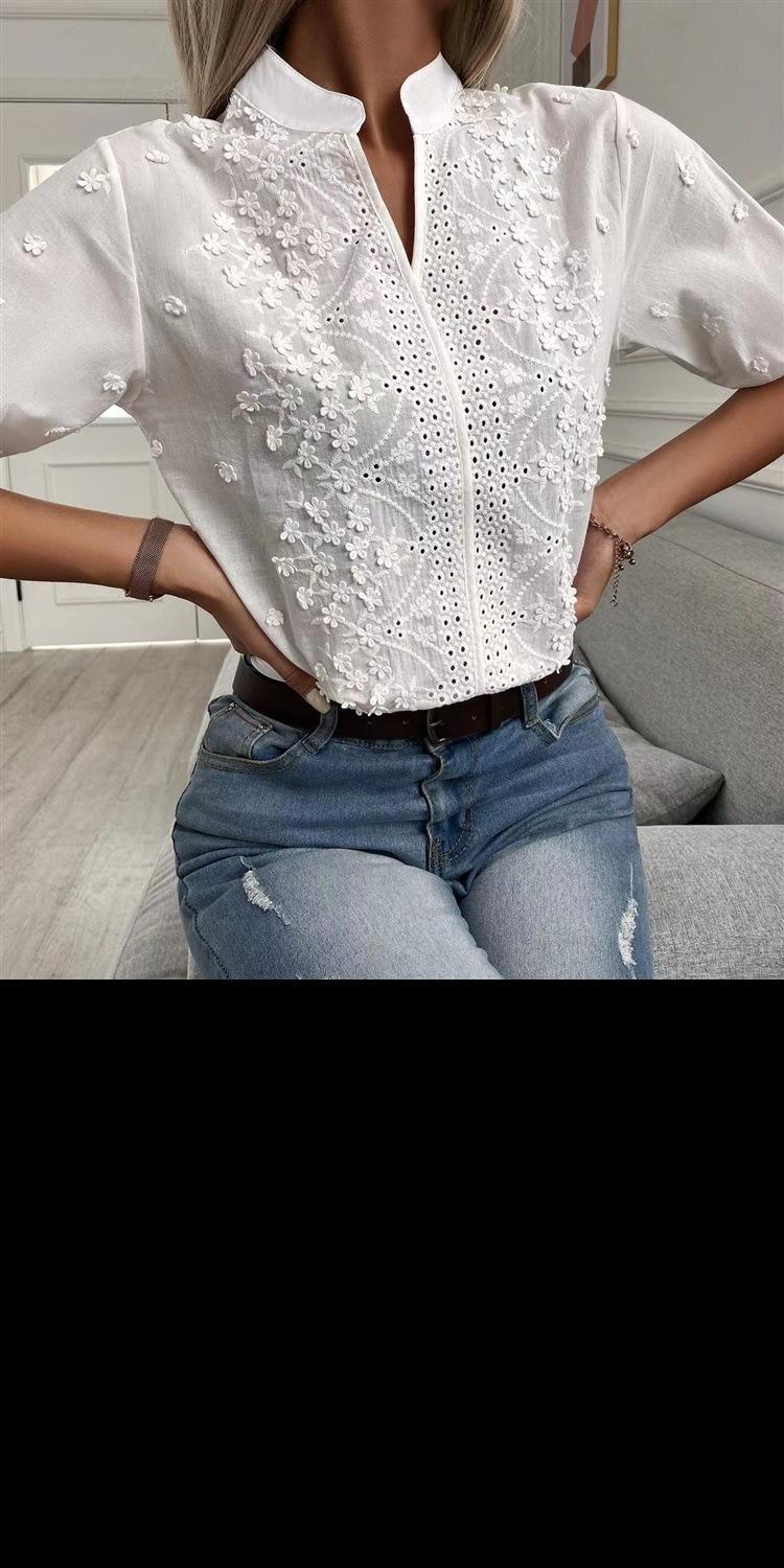 2023 Nuevo Estilo Otoñal Hermoso Patrón de Gancho Trasero Moderno Cuello Alto Bordado Calado Versátil Estilo Primavera y Verano Estilo Europeo Top con Cuello Medio Abierto