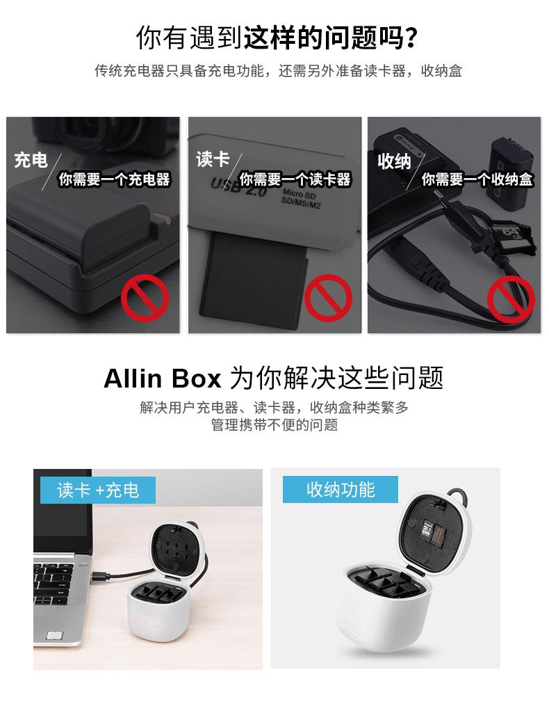 5. Gestión centralizada: Baterías, cargadores, lectores de tarjetas, tarjetas de memoria y bolsas de almacenamiento se empaquetan en una caja todo en uno, mucho más pequeña que el conjunto completo. Ya no tendrás que preocuparte por gestionar estos complicados accesorios.
