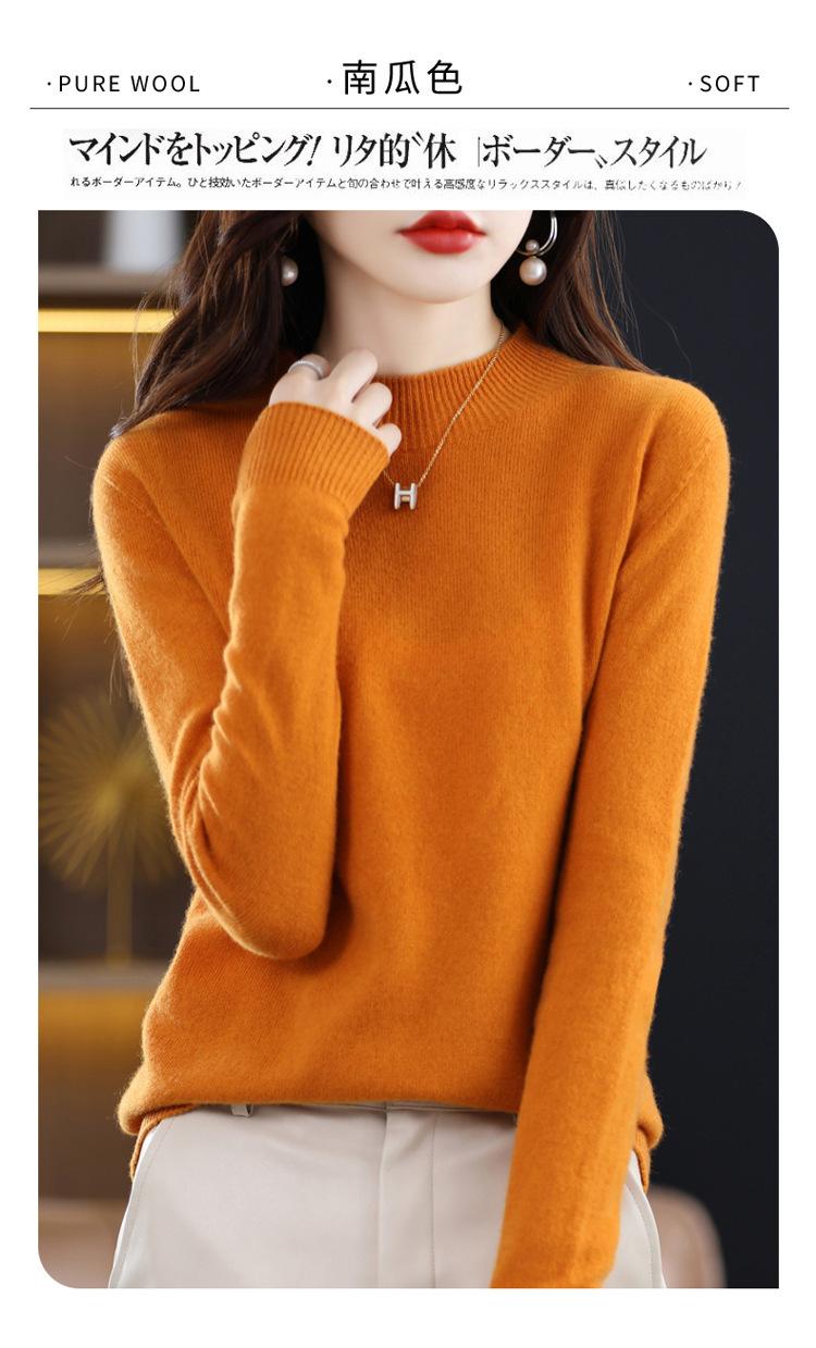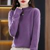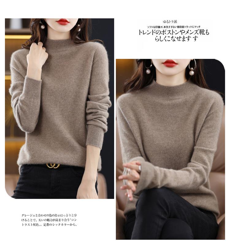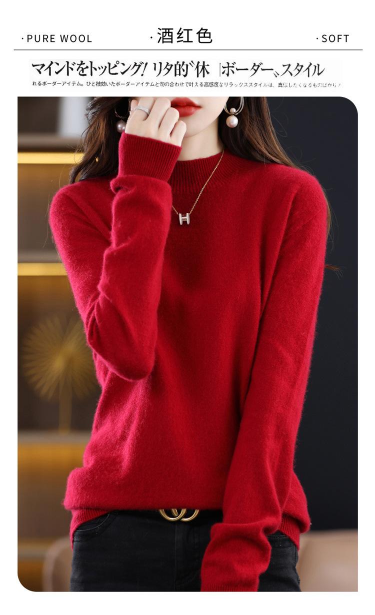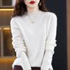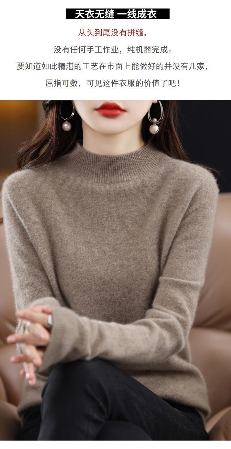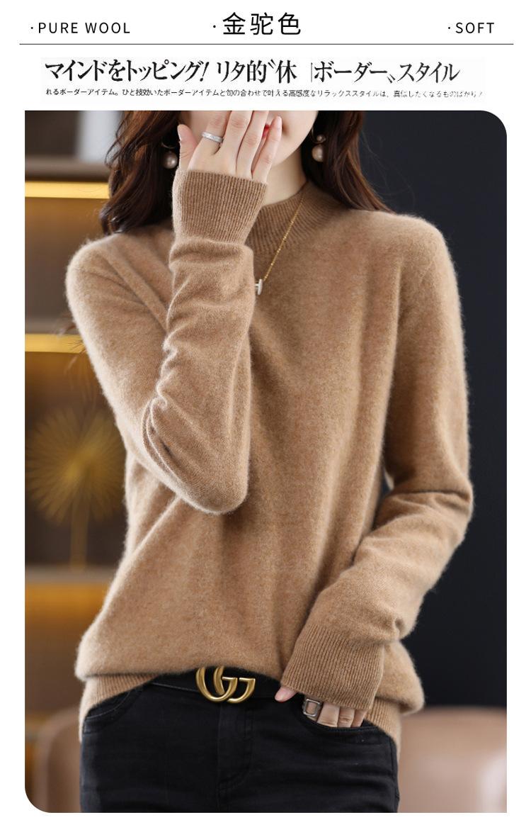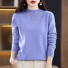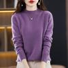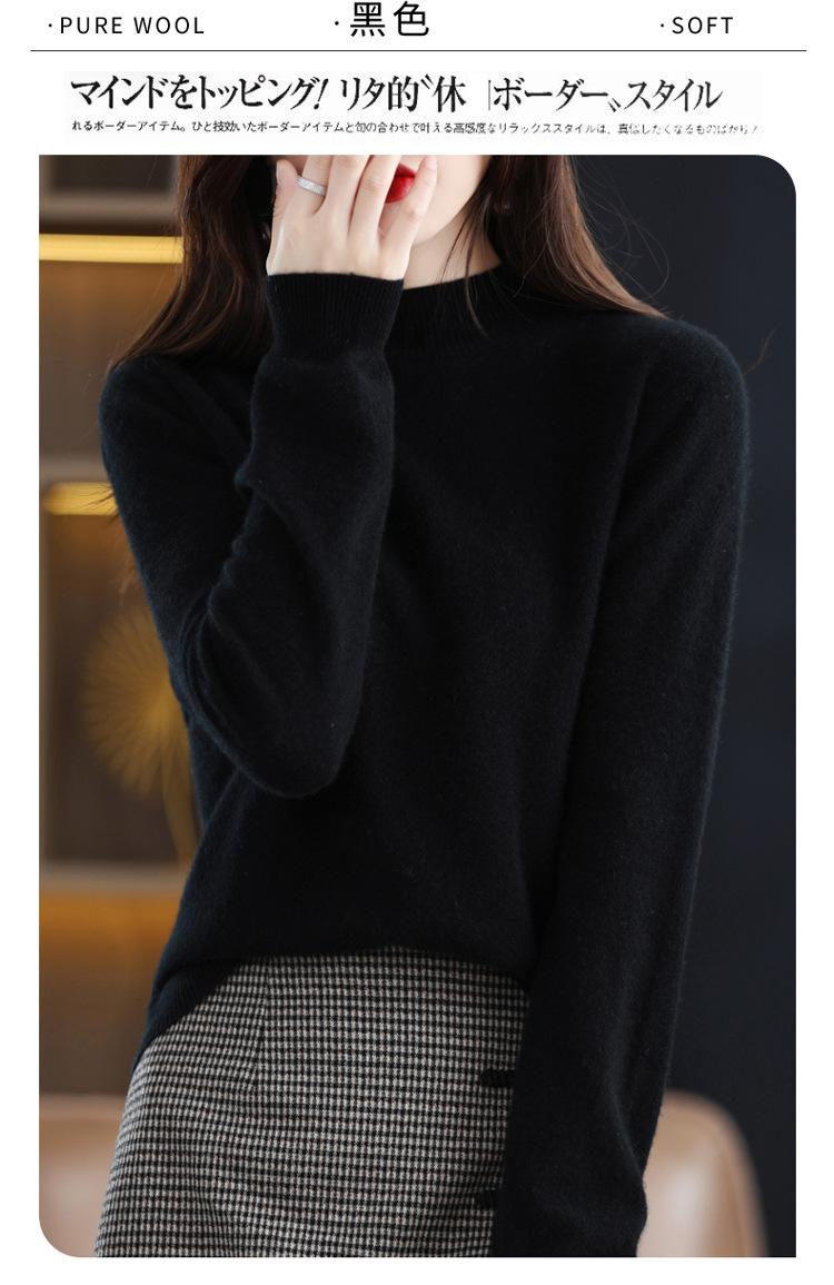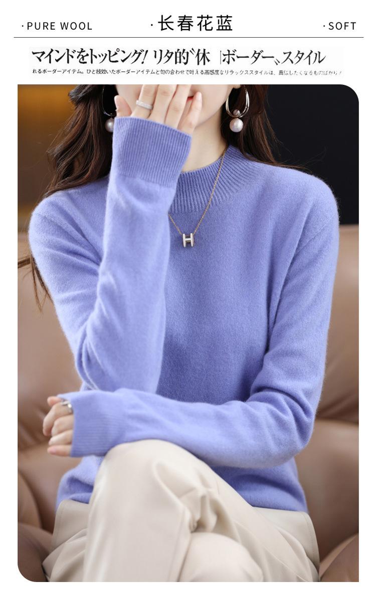 Suéter de lana merino confeccionado en una sola línea, cuello alto simulado, color liso, manga larga, camisa de punto, suéter suelto y sencillo.