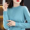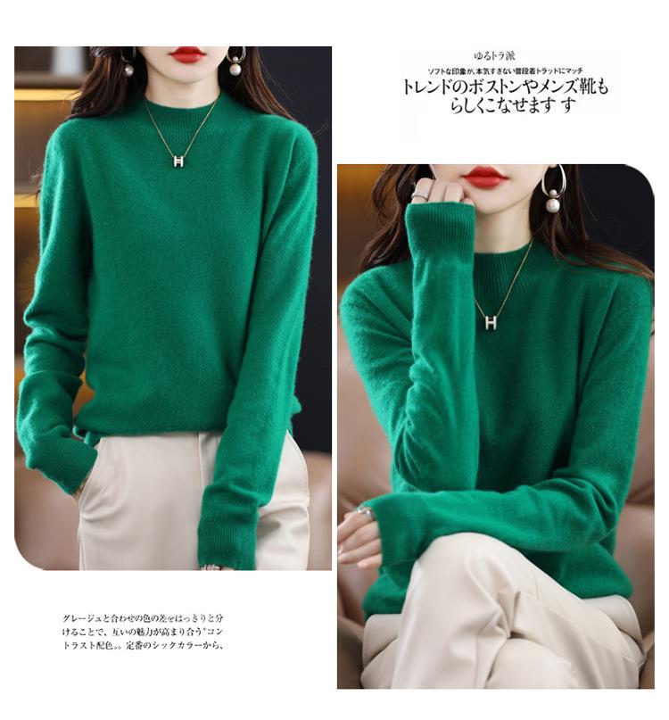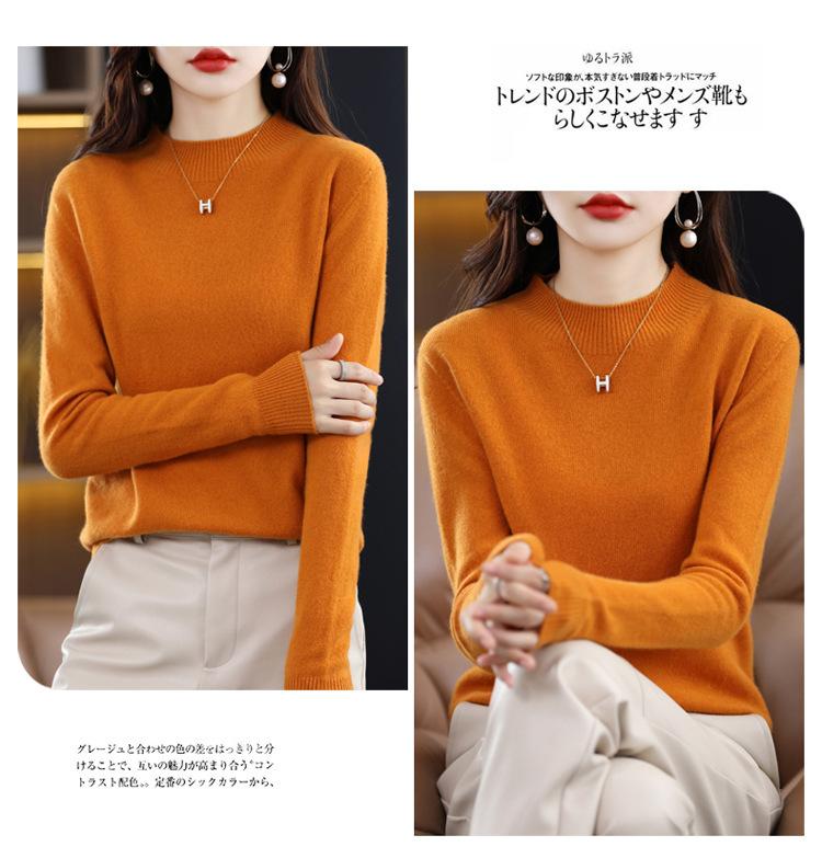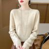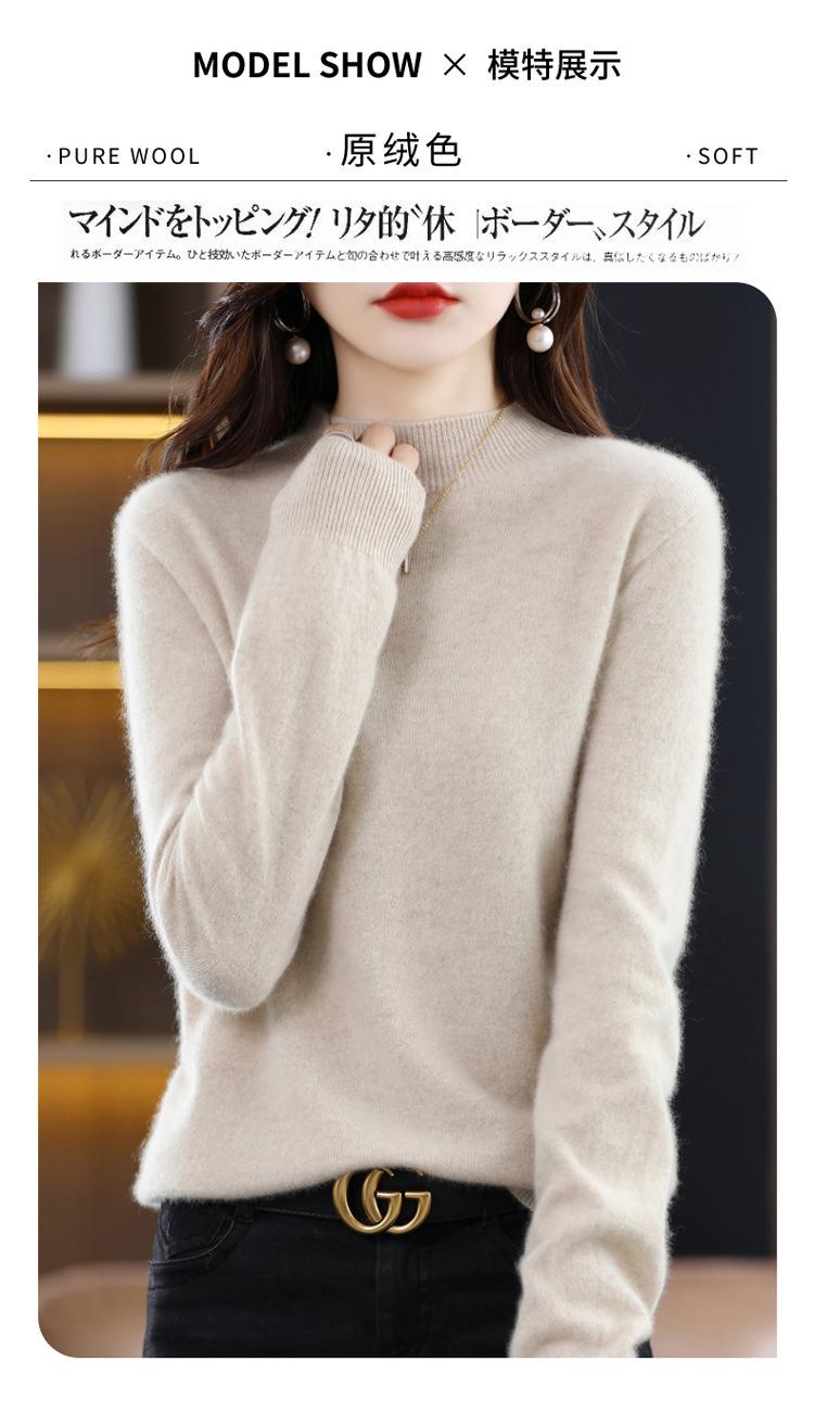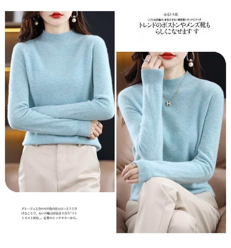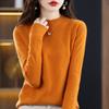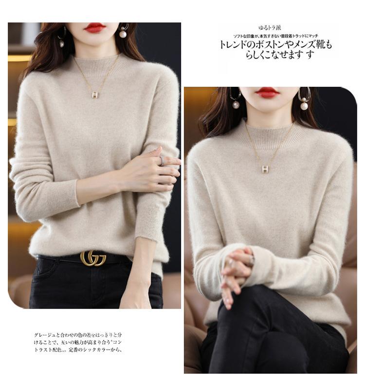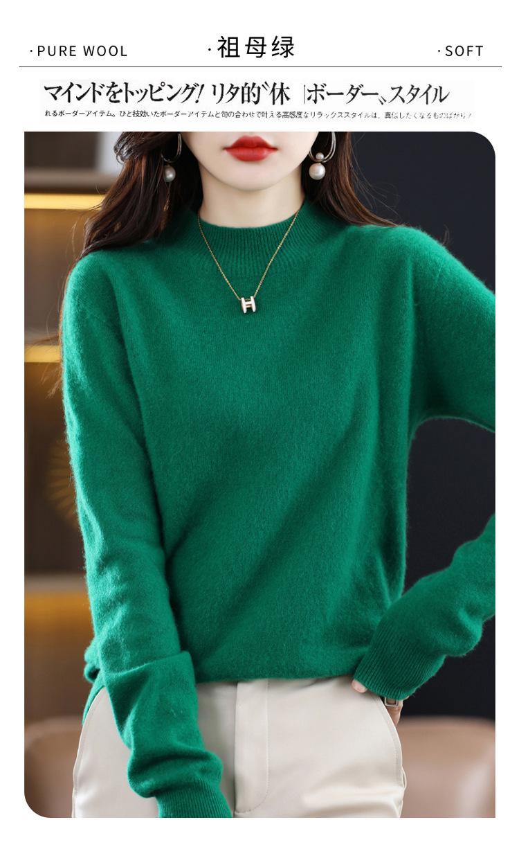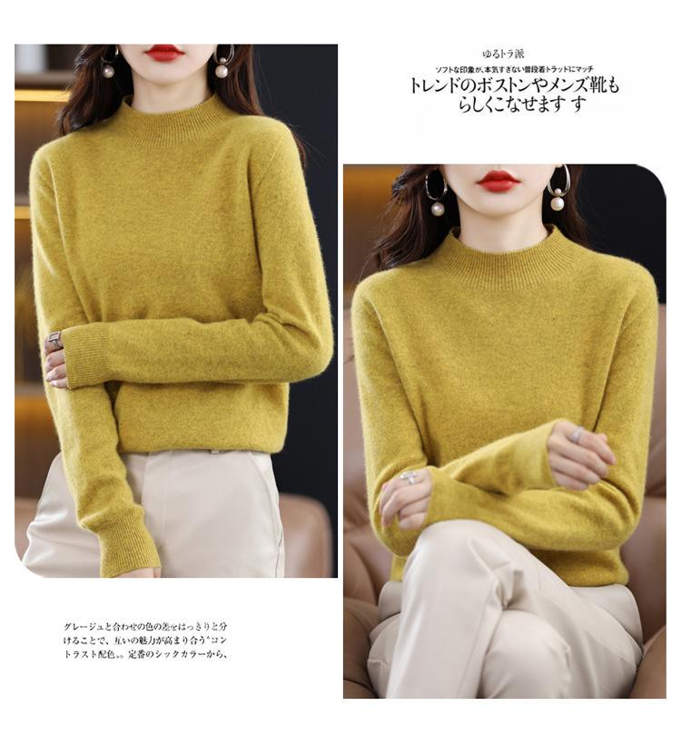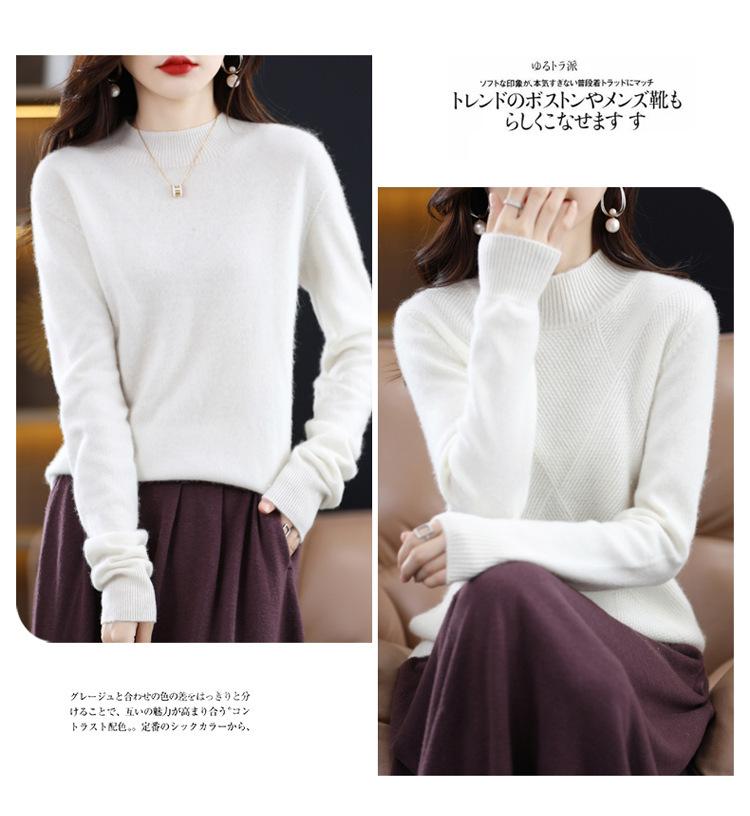 Suéter de lana merino confeccionado en una sola línea, cuello alto simulado, color liso, manga larga, camisa de punto, suéter suelto y sencillo.