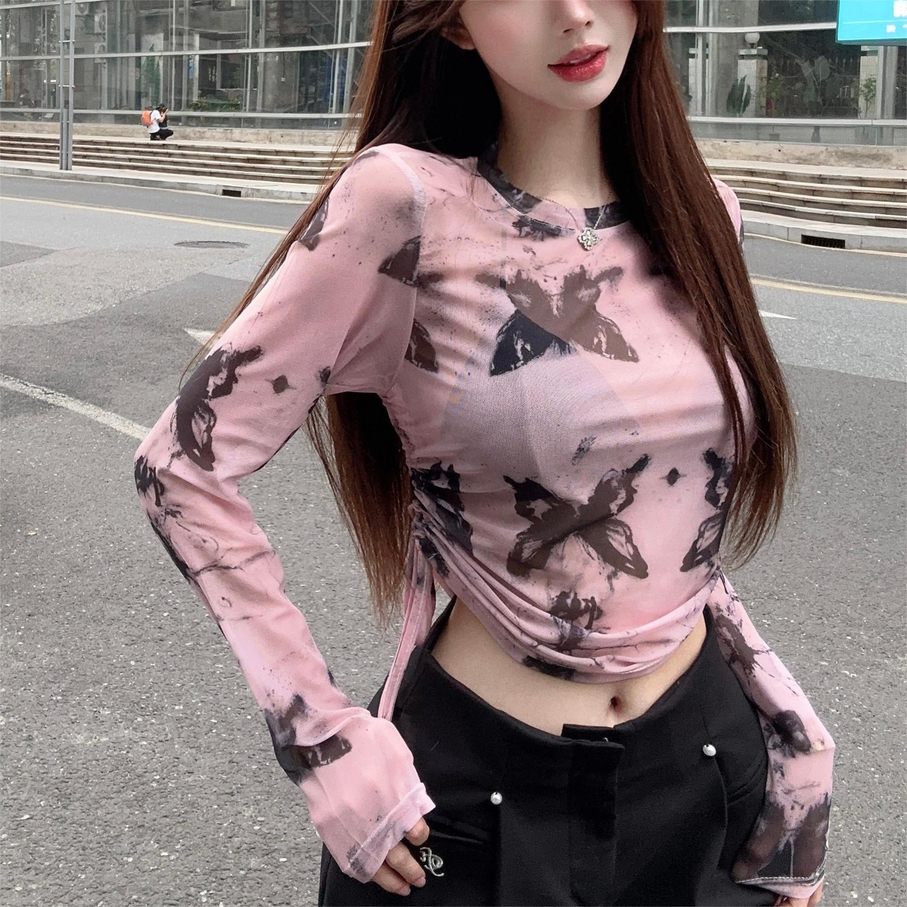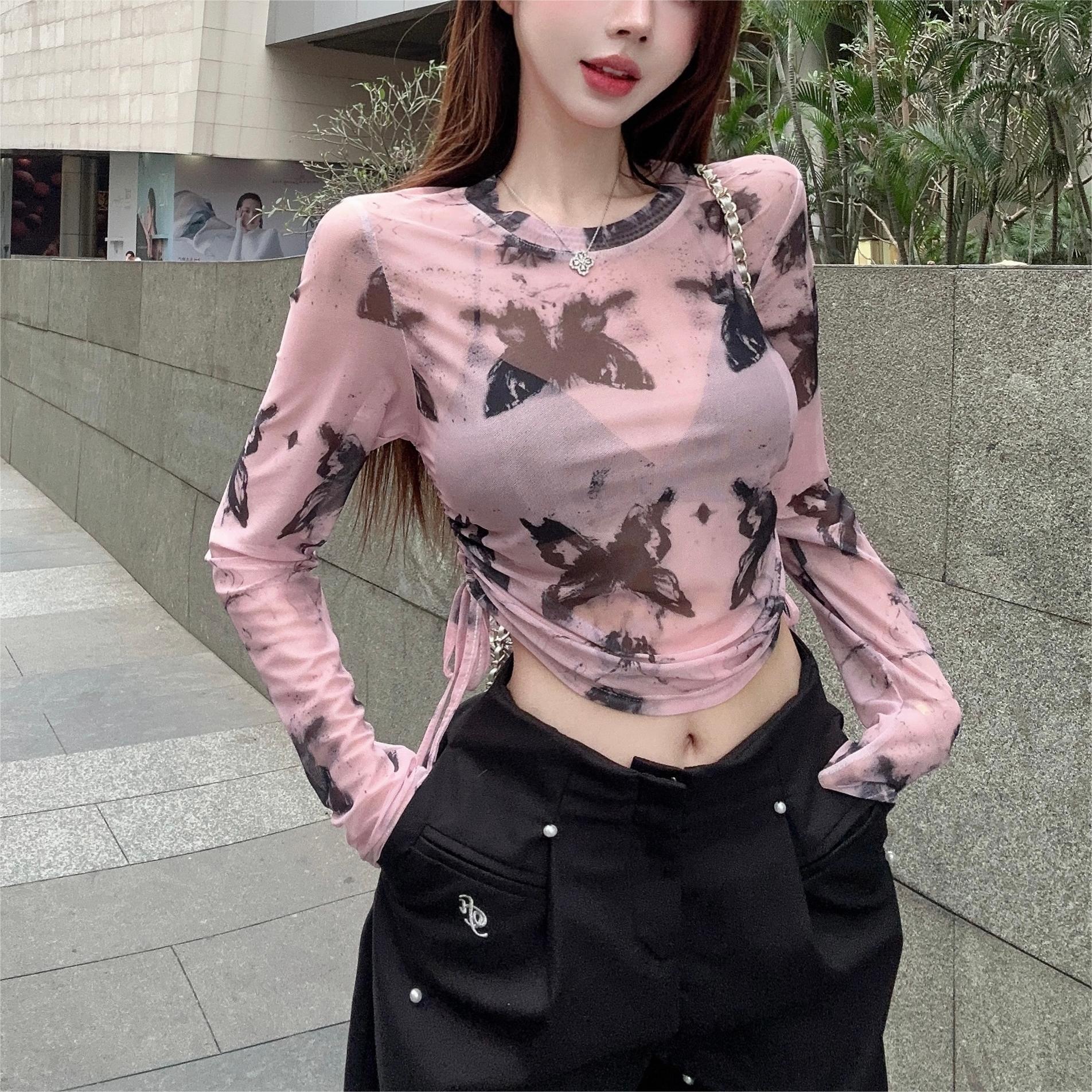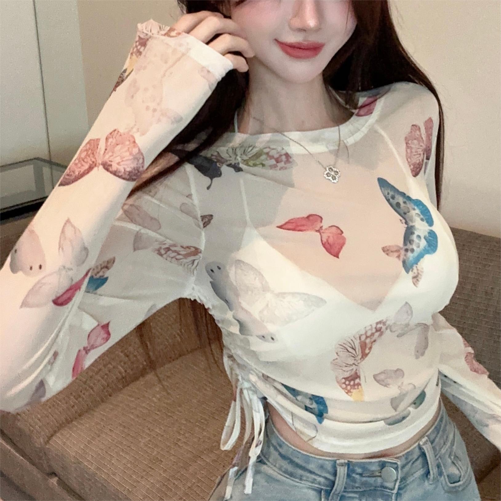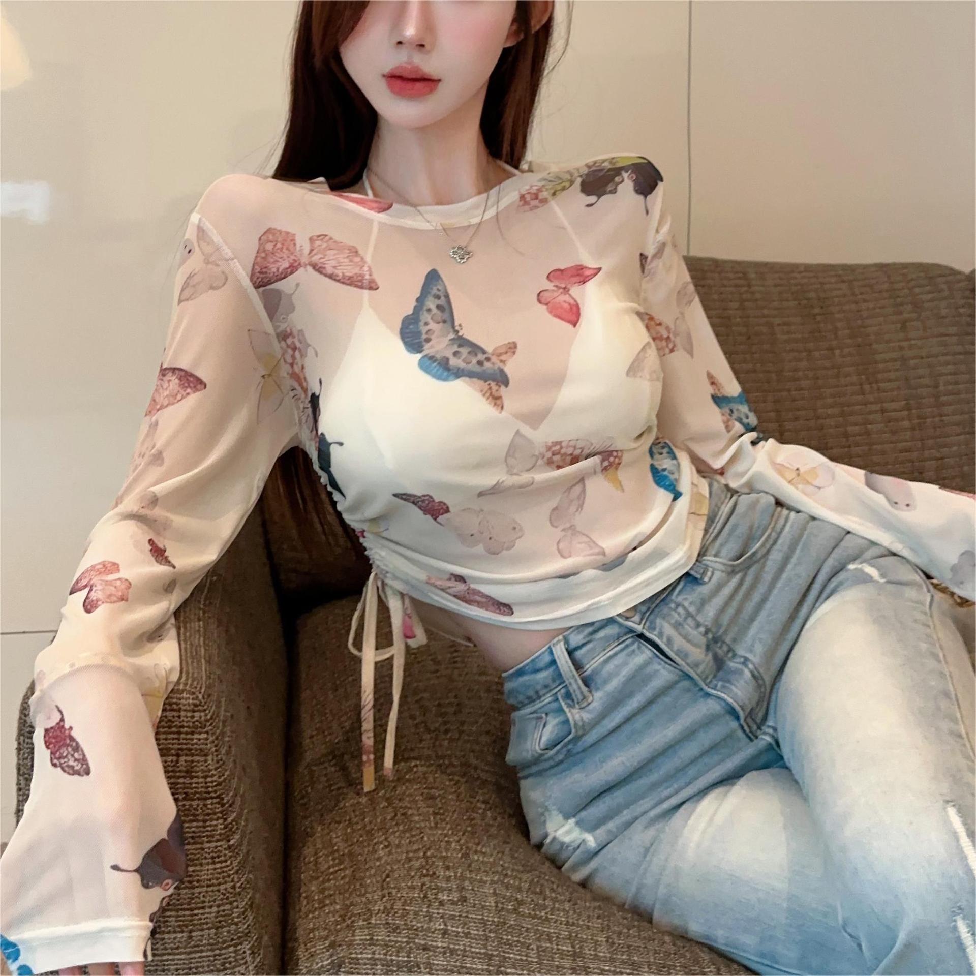 2025 Nueva Camiseta de Verano para Chica Caliente con Cordón en la Cintura y Manga Larga para Mujer, Estampado de Mariposas, Malla Protectora Solar, Top Ajustado
