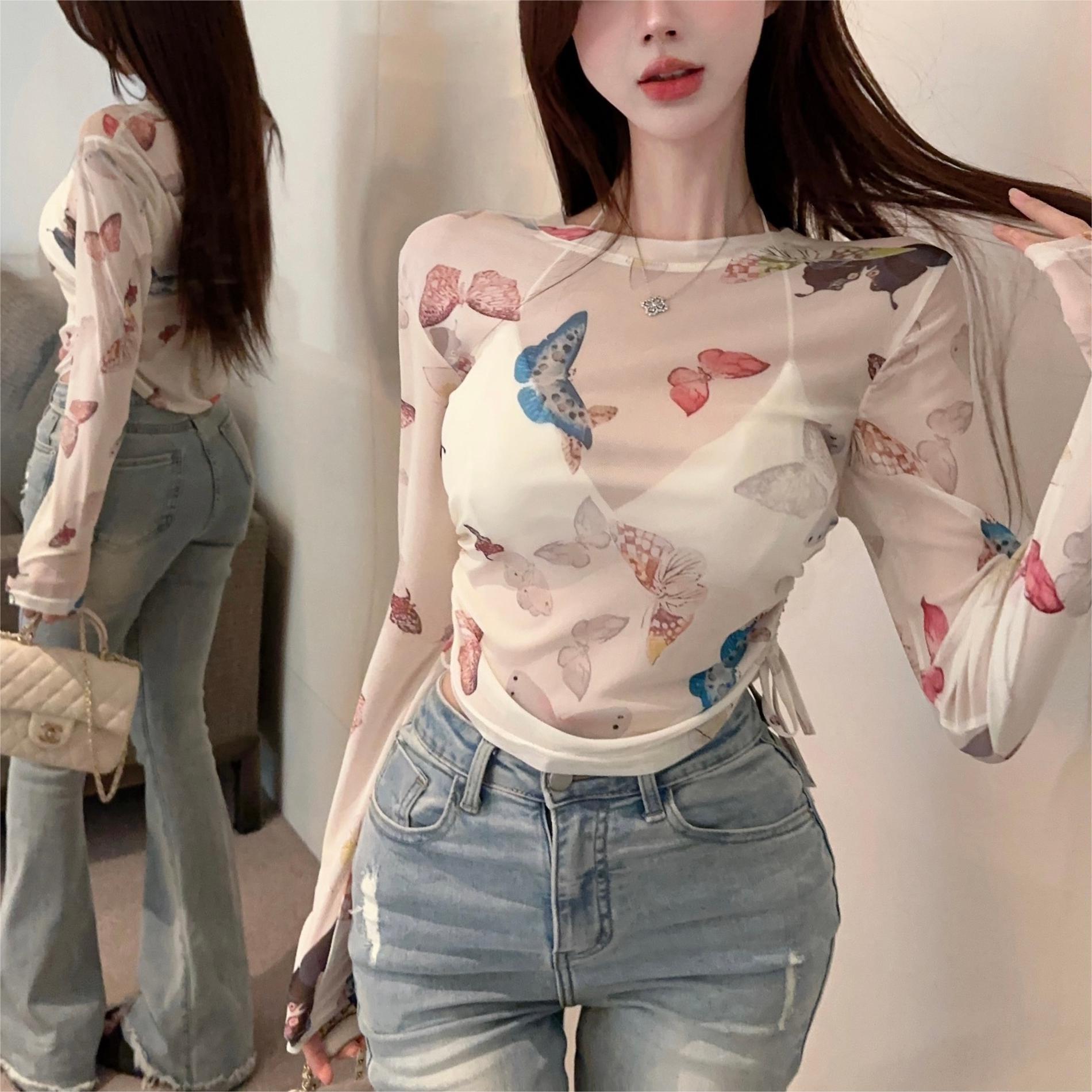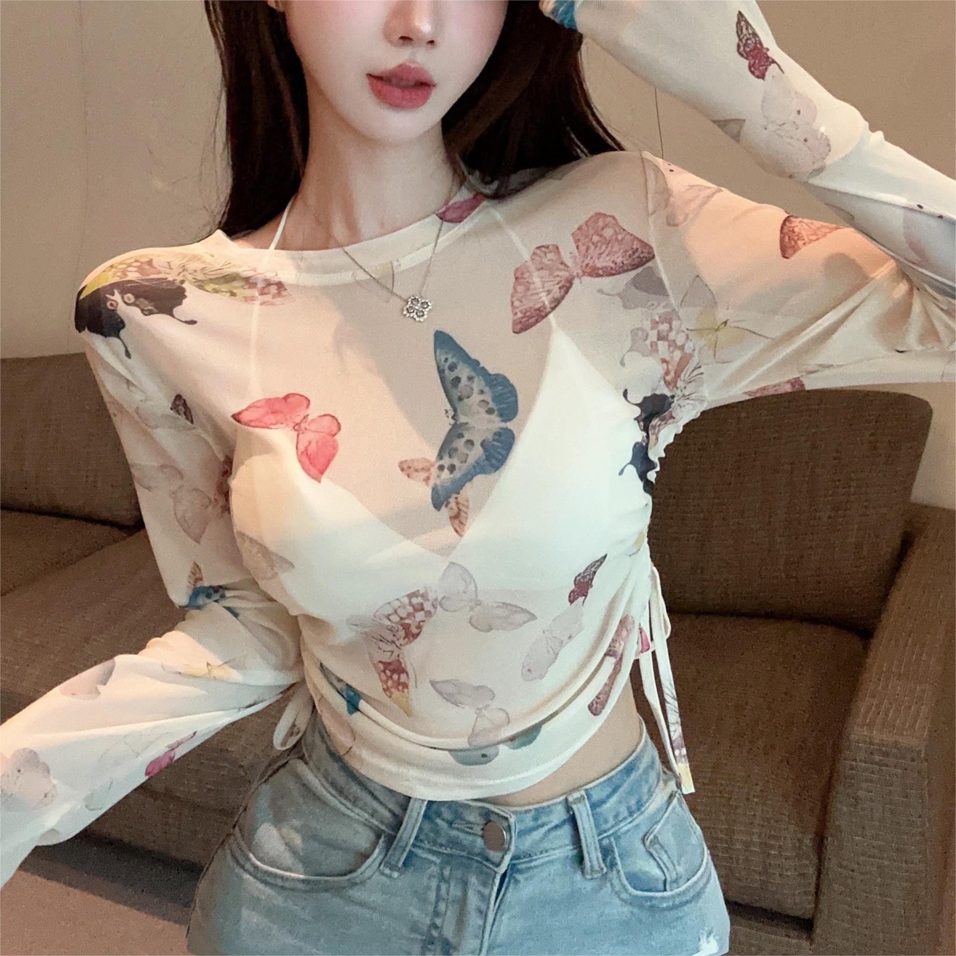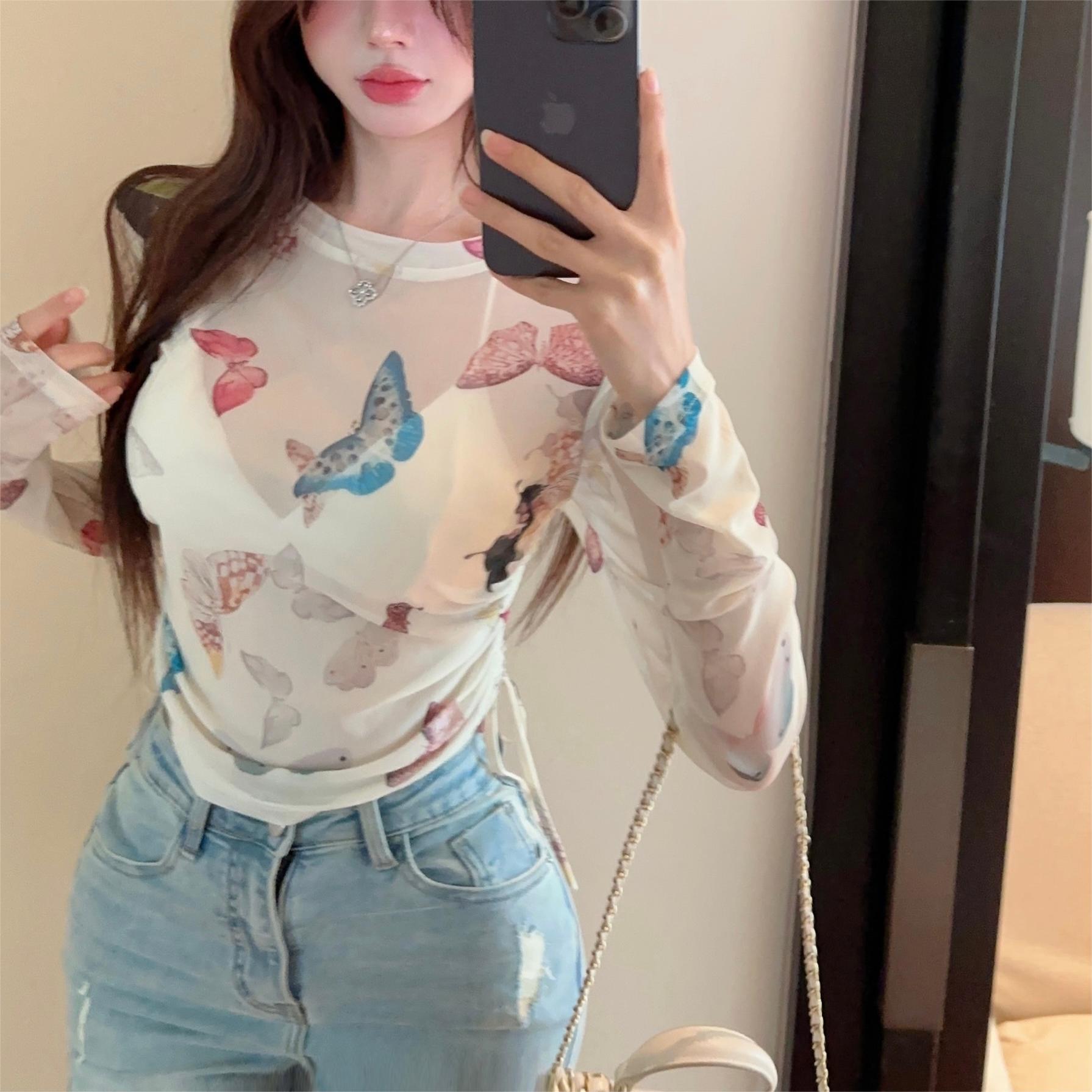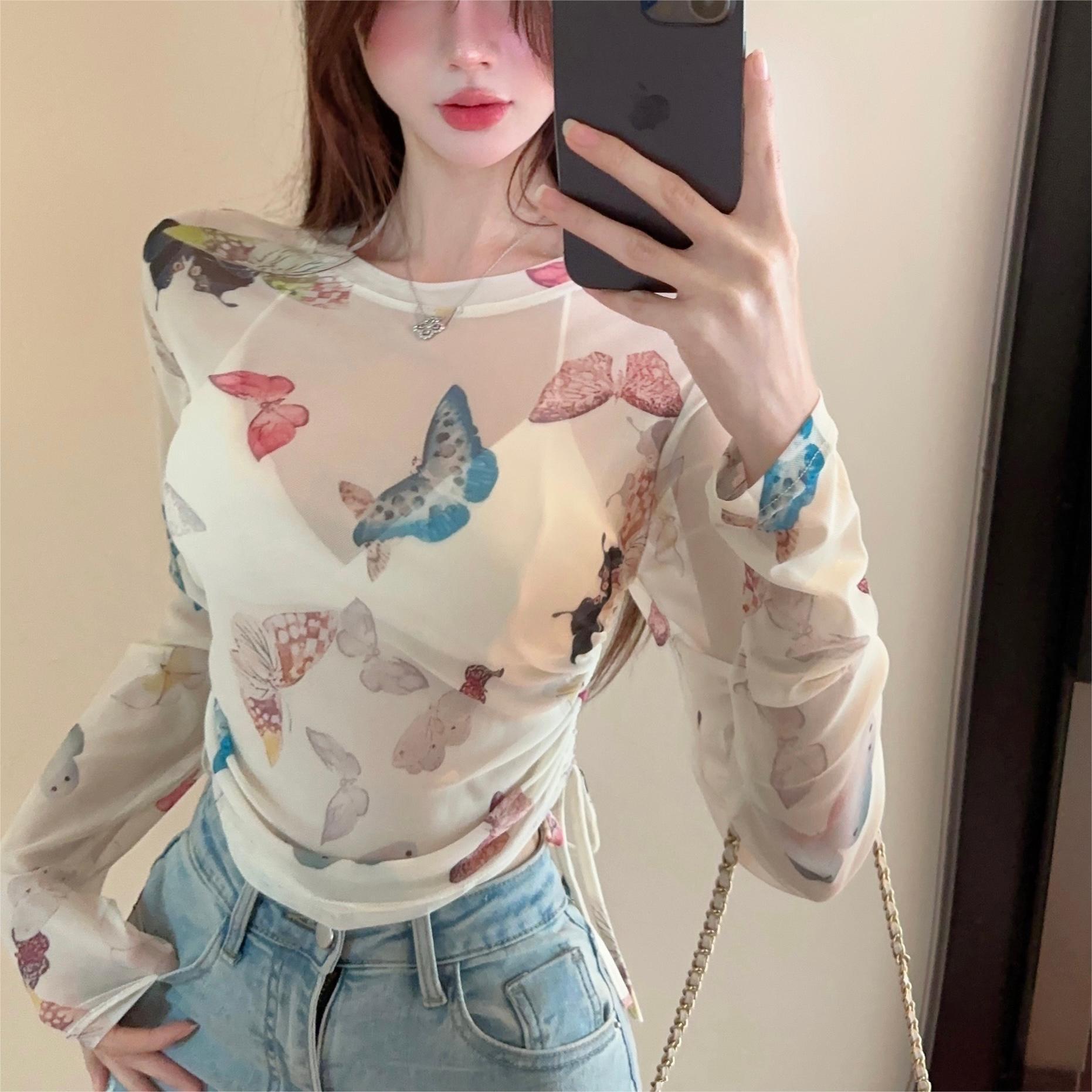 2025 Nueva Camiseta de Verano para Chica Caliente con Cordón en la Cintura y Manga Larga para Mujer, Estampado de Mariposas, Malla Protectora Solar, Top Ajustado