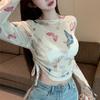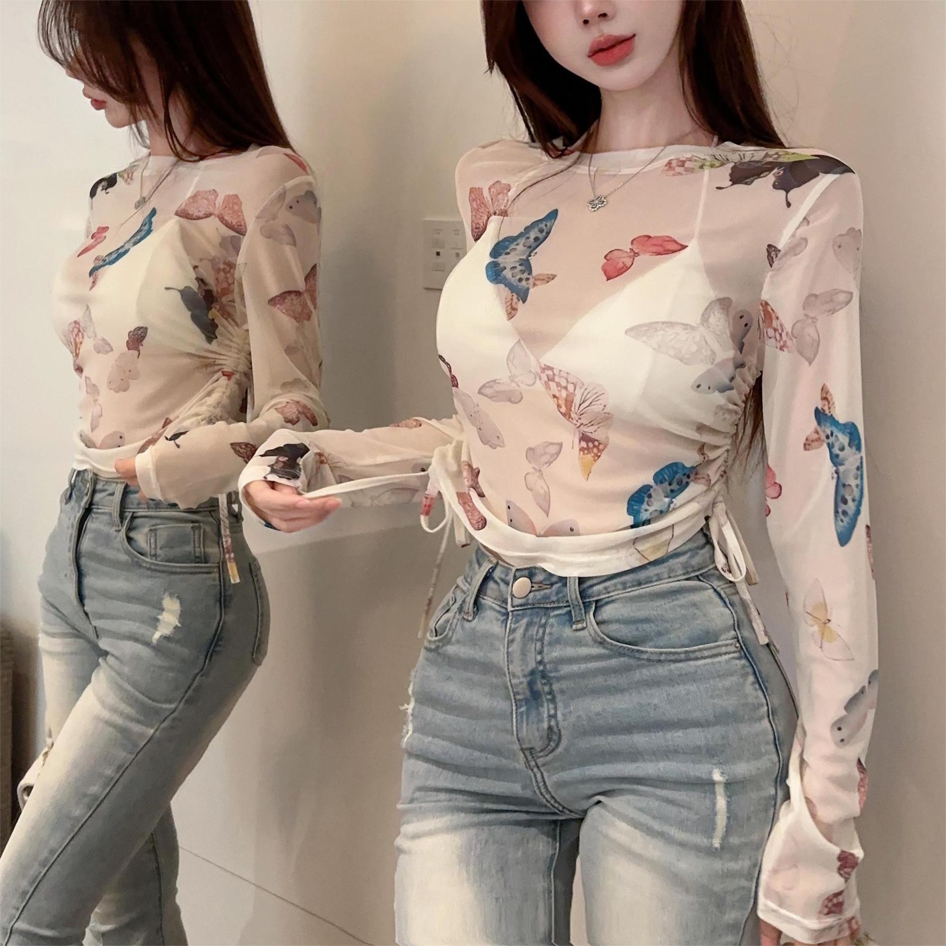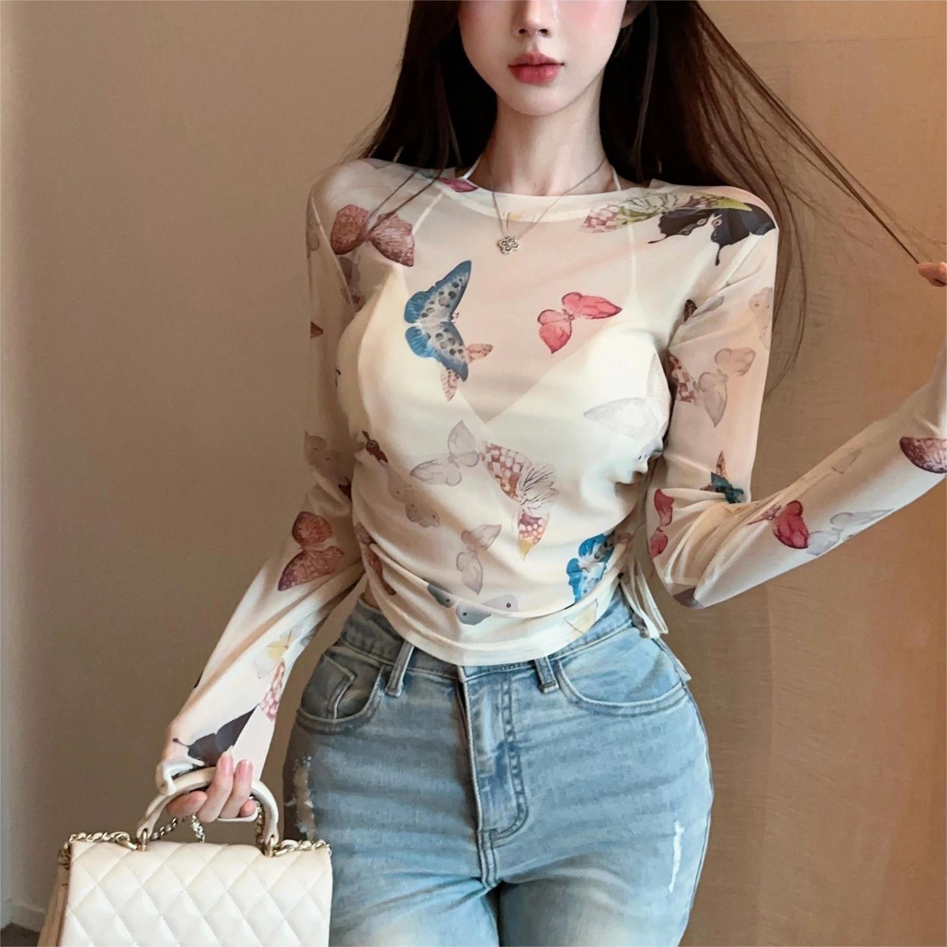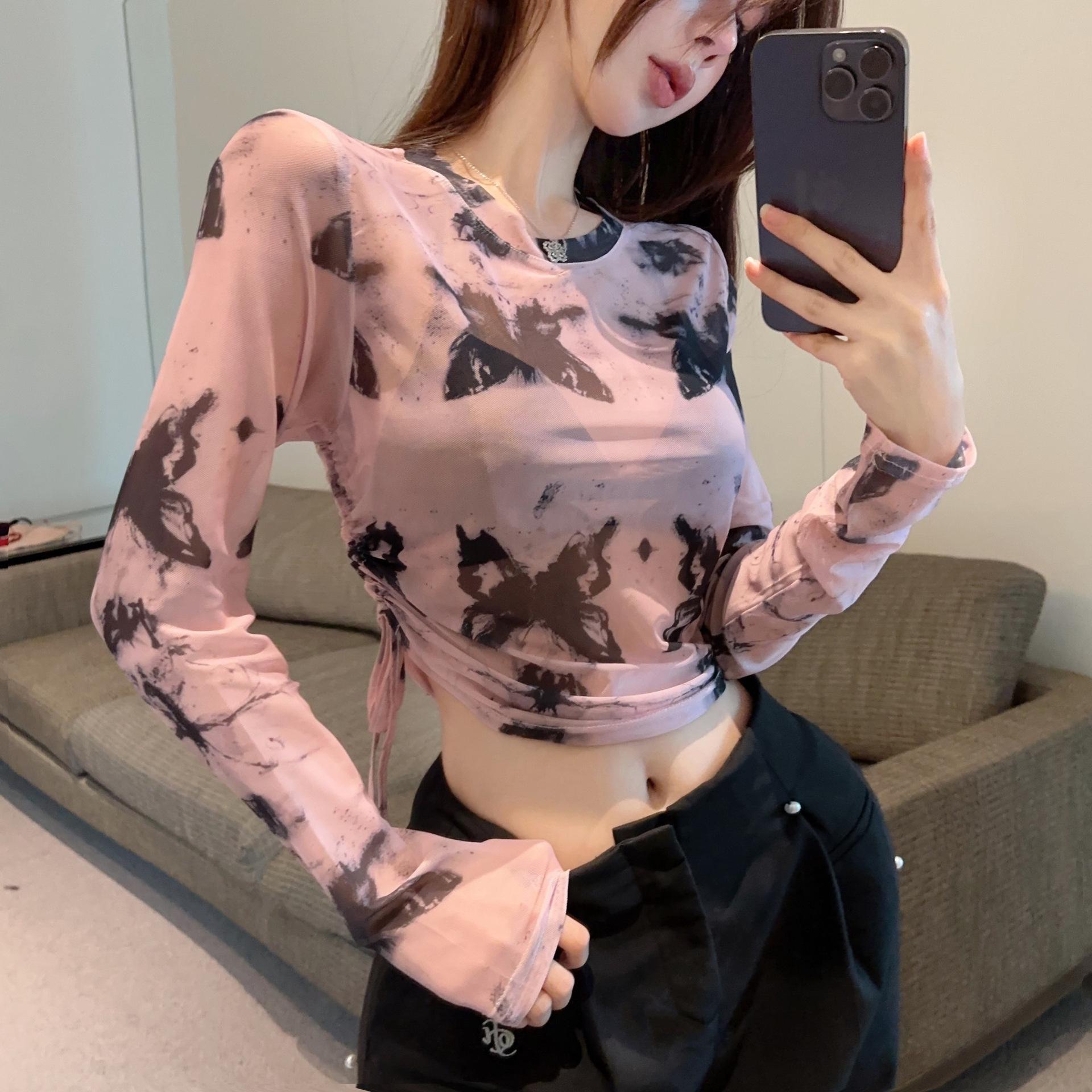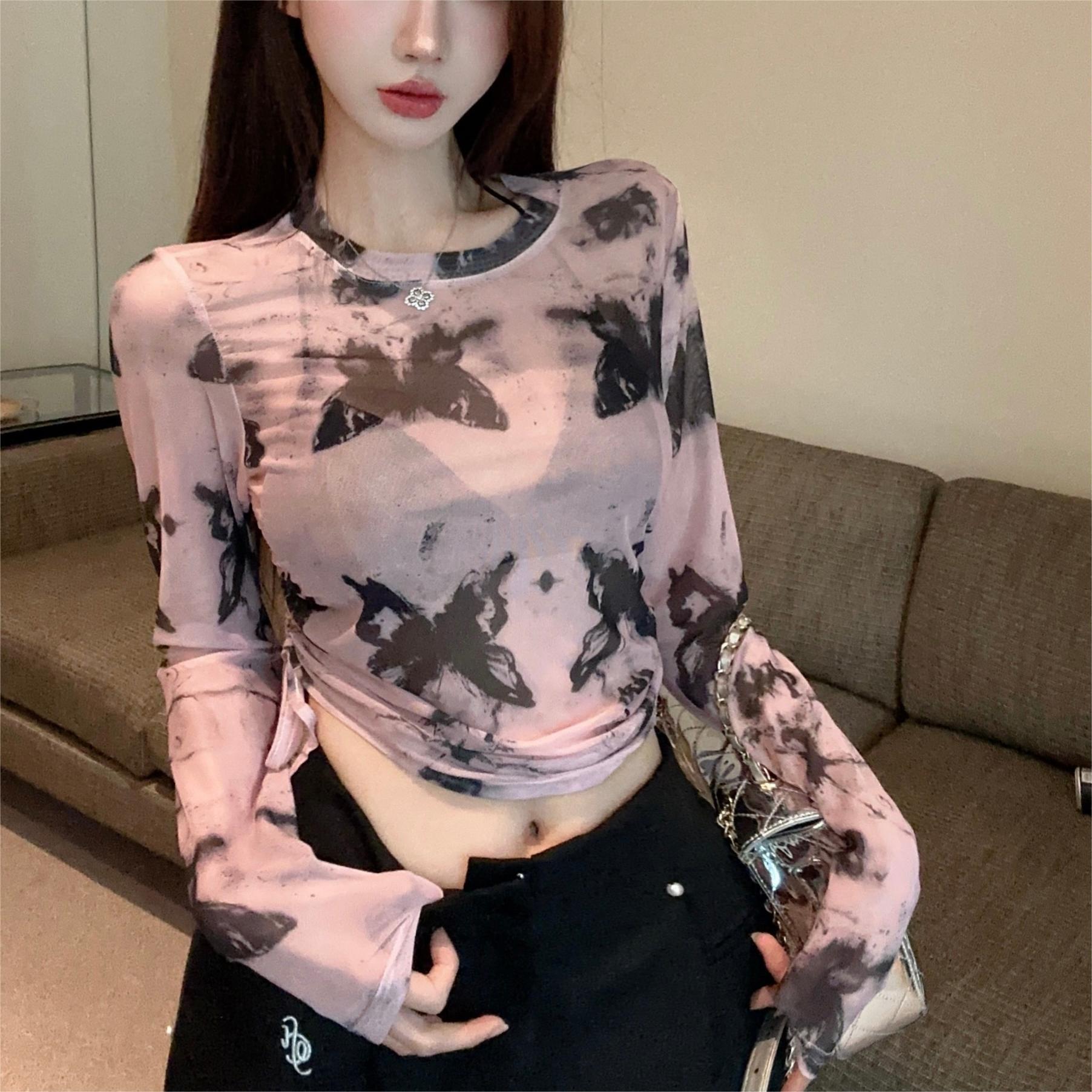 2025 Nueva Camiseta de Verano para Chica Caliente con Cordón en la Cintura y Manga Larga para Mujer, Estampado de Mariposas, Malla Protectora Solar, Top Ajustado