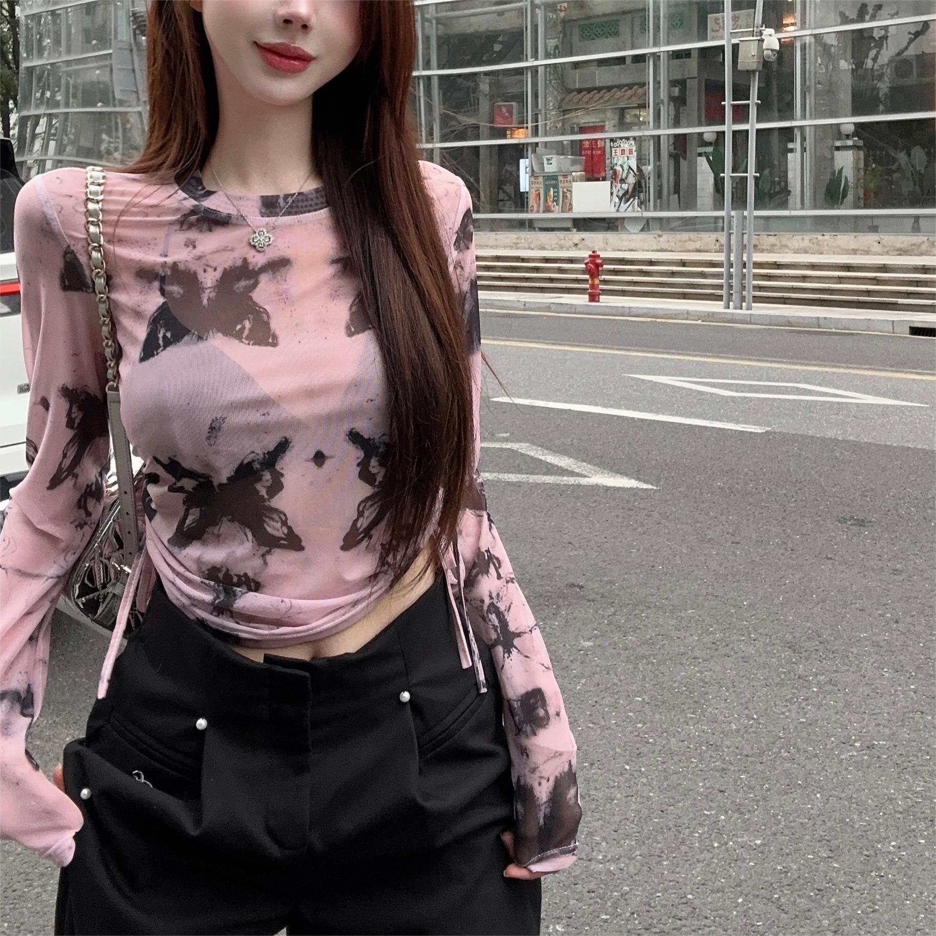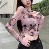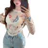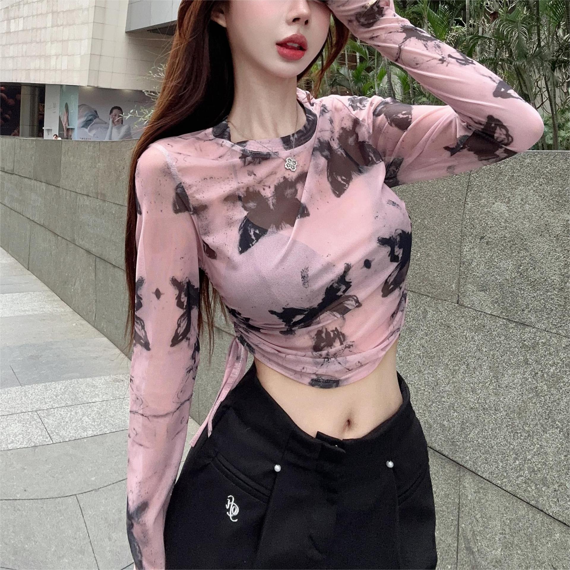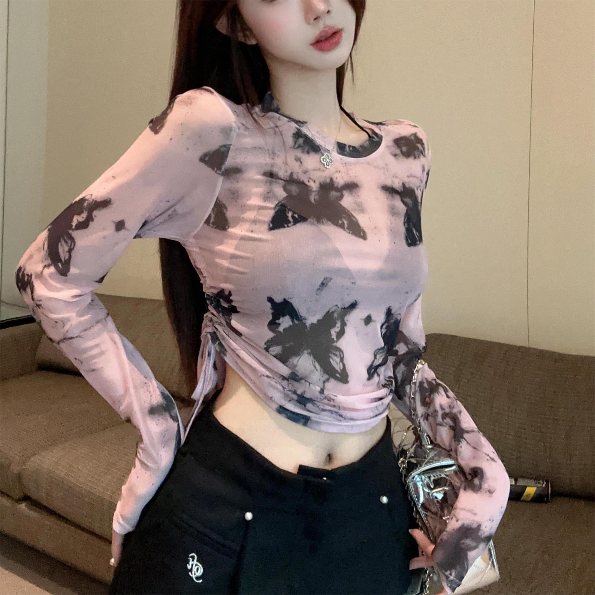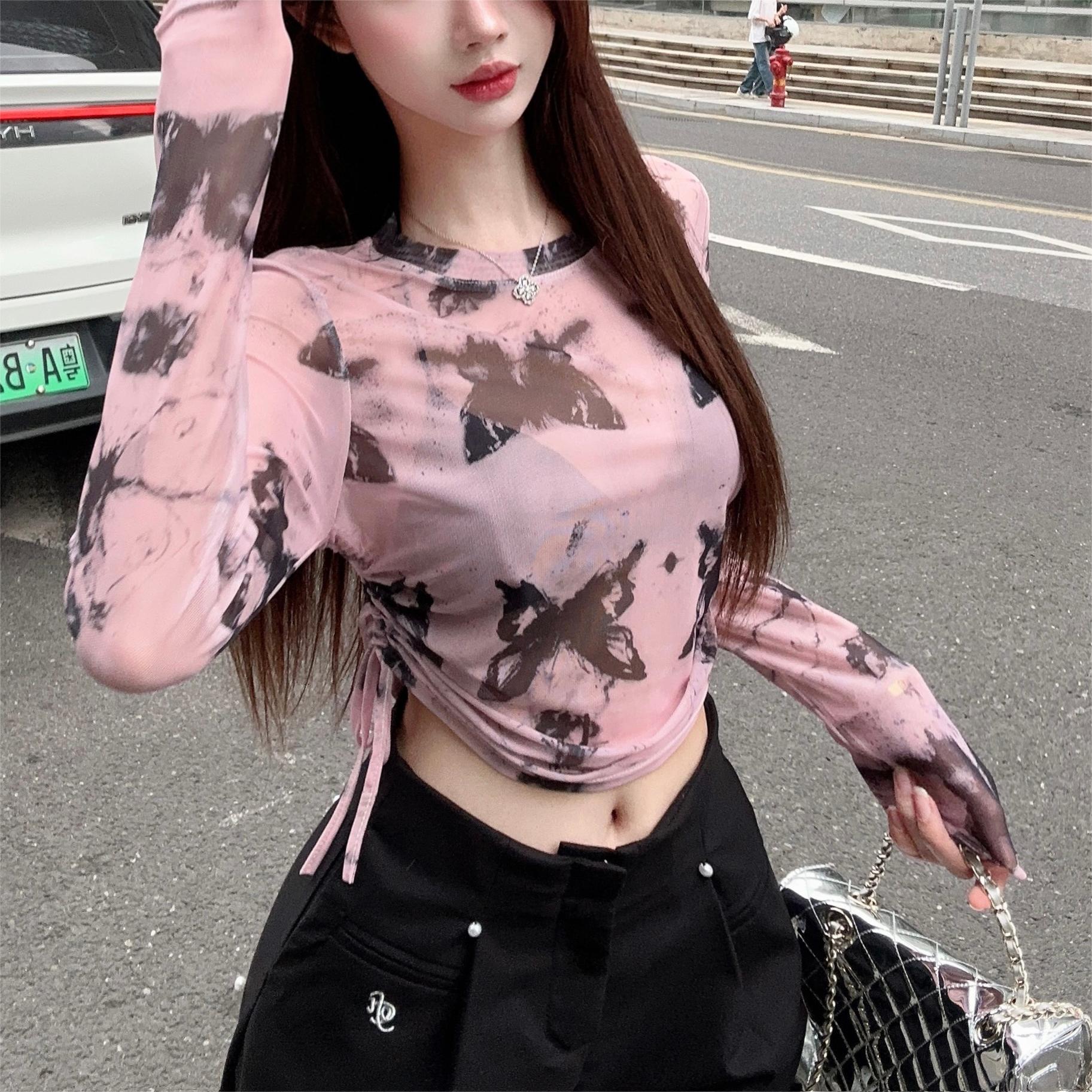 2025 Nueva Camiseta de Verano para Chica Caliente con Cordón en la Cintura y Manga Larga para Mujer, Estampado de Mariposas, Malla Protectora Solar, Top Ajustado