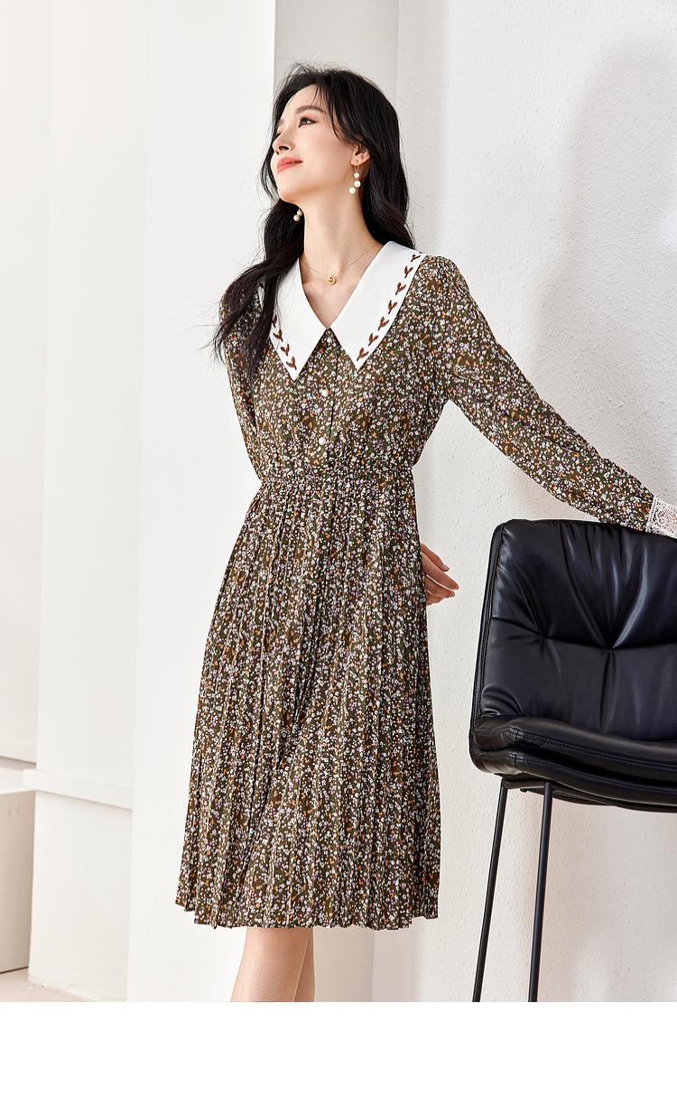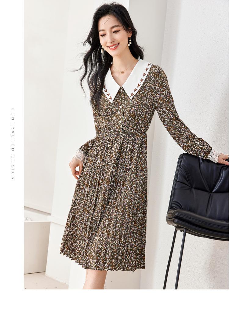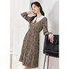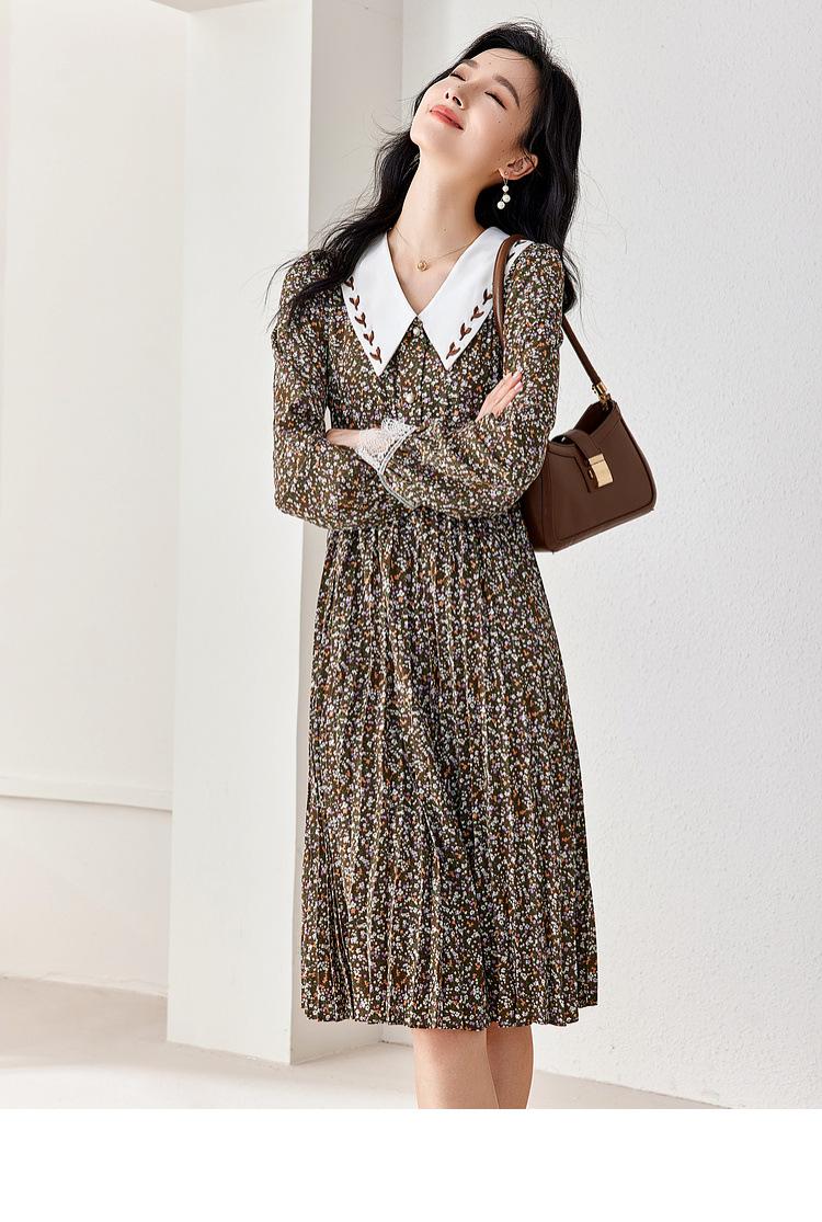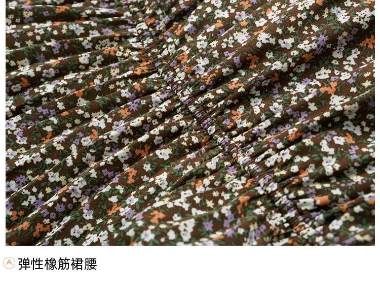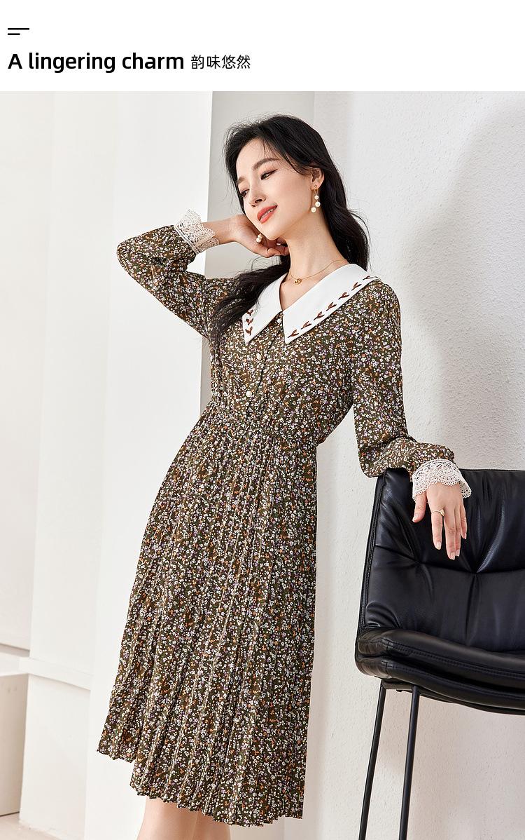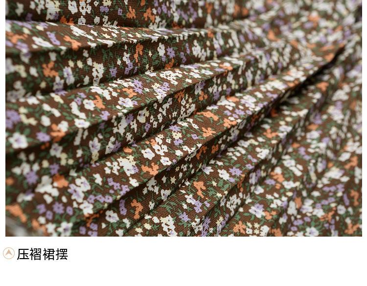 Zhenqi - Vestido estilo Hepburn con escote en V y estampado floral pequeño para mujer, cintura ajustada, manga larga, falda plisada adelgazante DE913