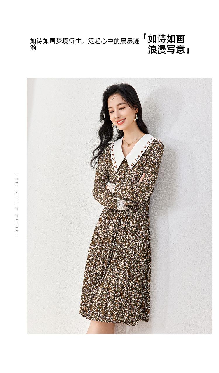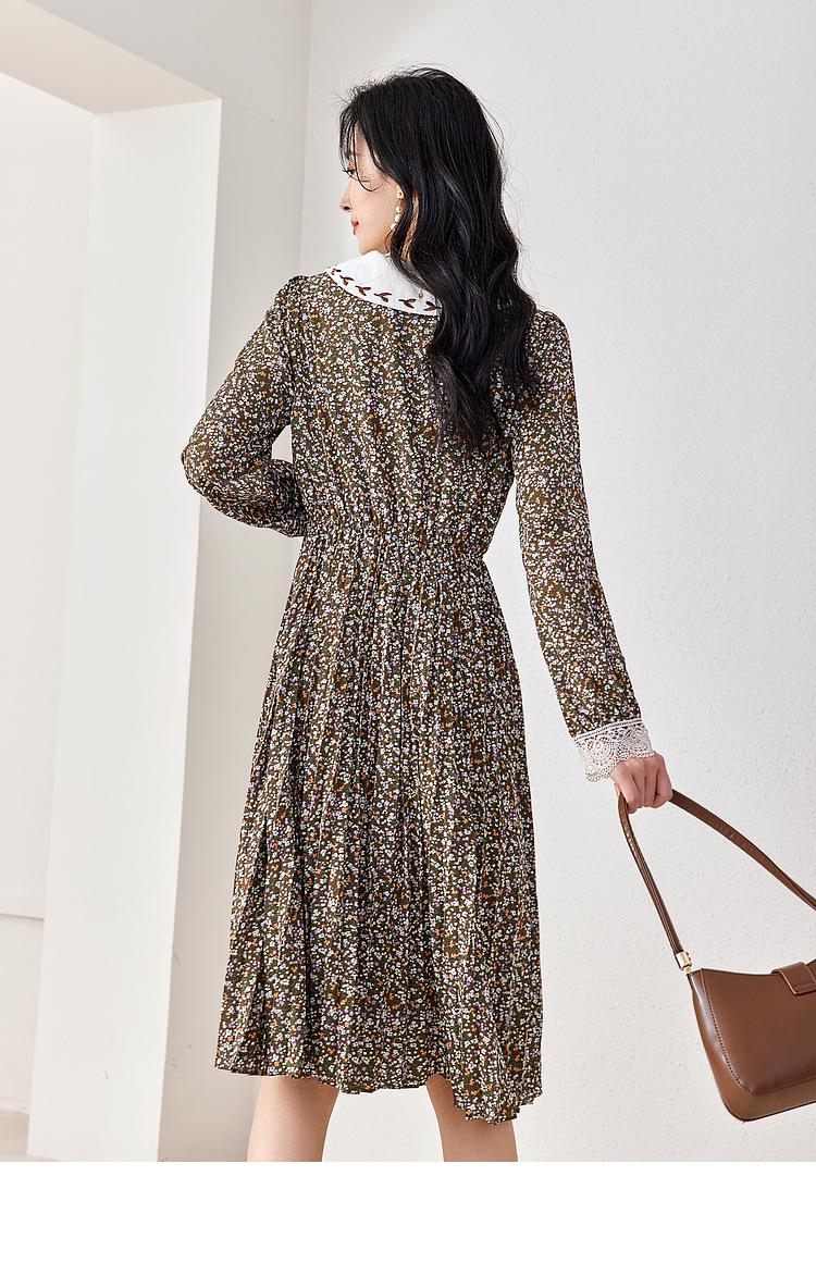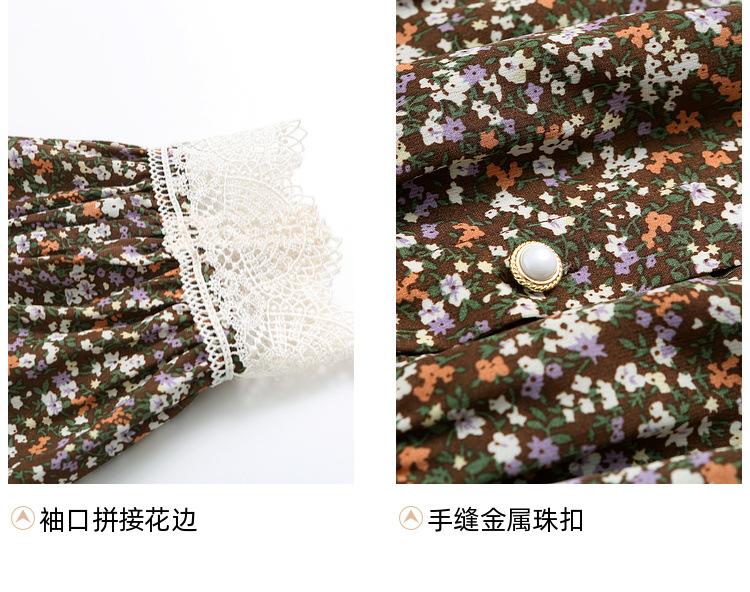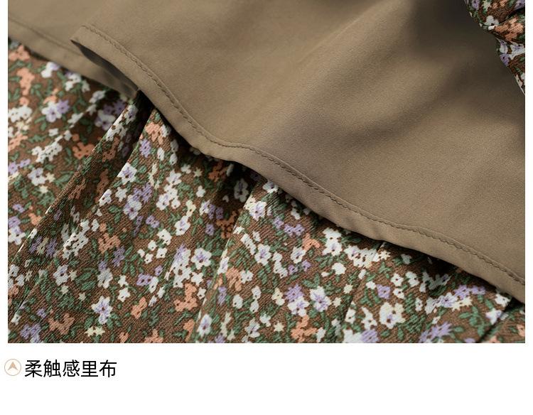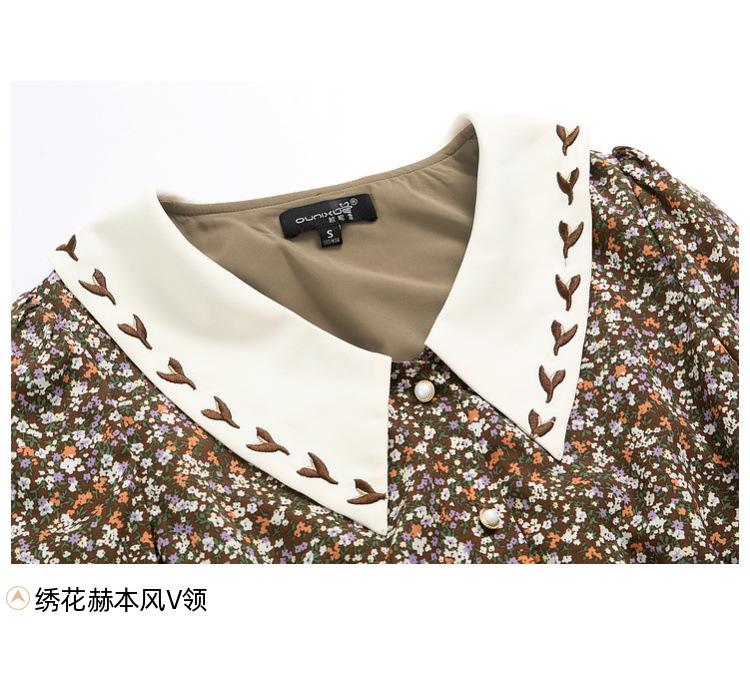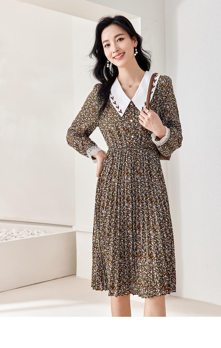 Zhenqi - Vestido estilo Hepburn con escote en V y estampado floral pequeño para mujer, cintura ajustada, manga larga, falda plisada adelgazante DE913