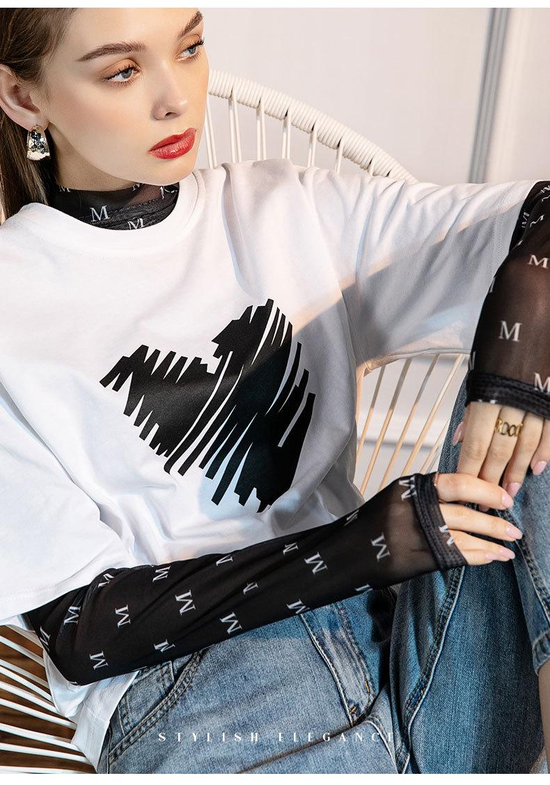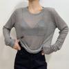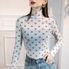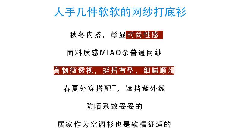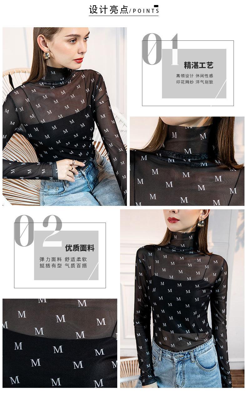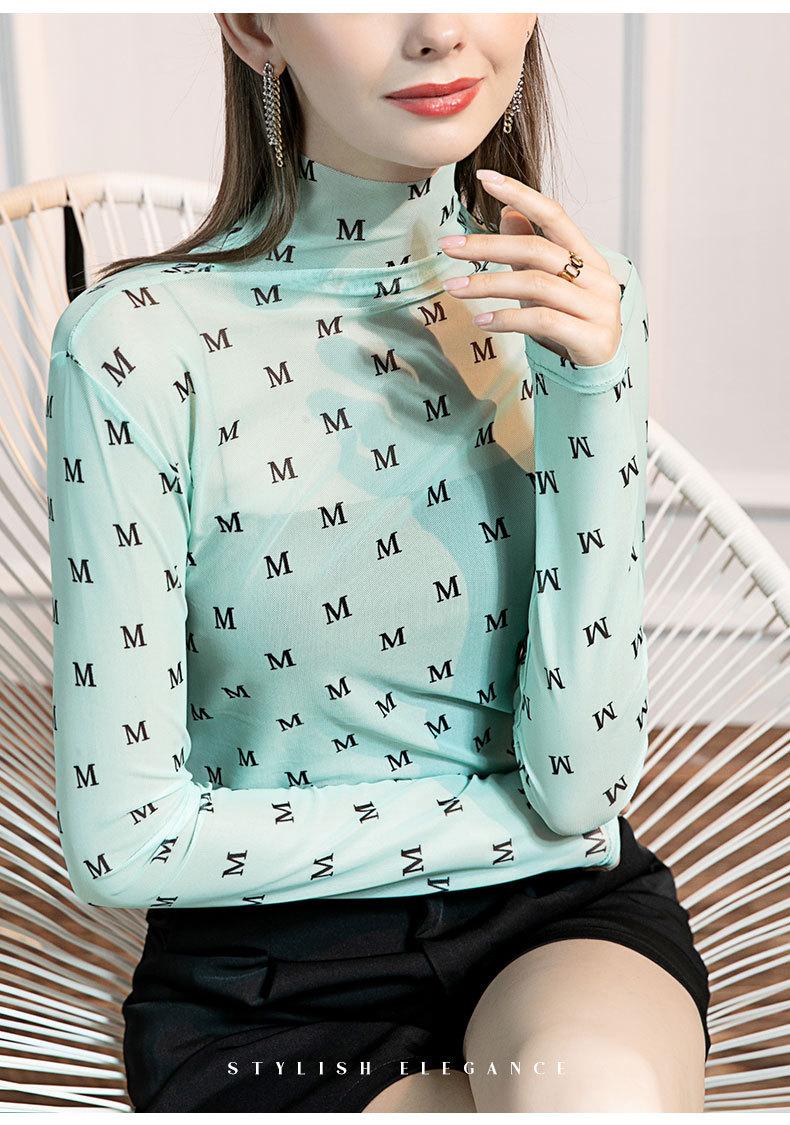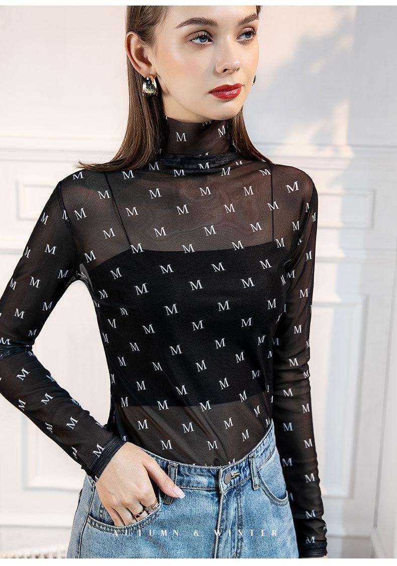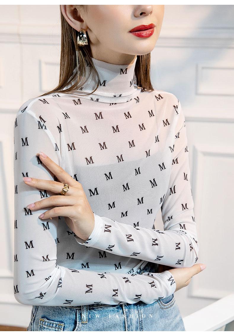 Camiseta Base de Verano de Cuello Alto con Protección Solar para Mujer, Malla Versión Coreana, Sexy Transparente con Letras Versátil de Manga Larga