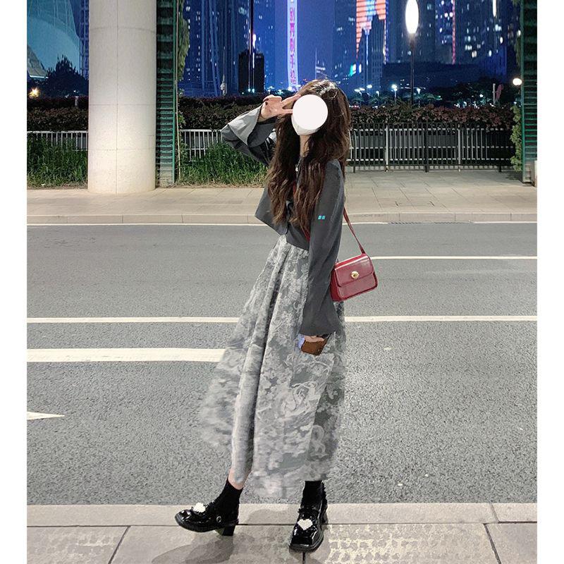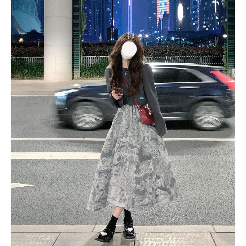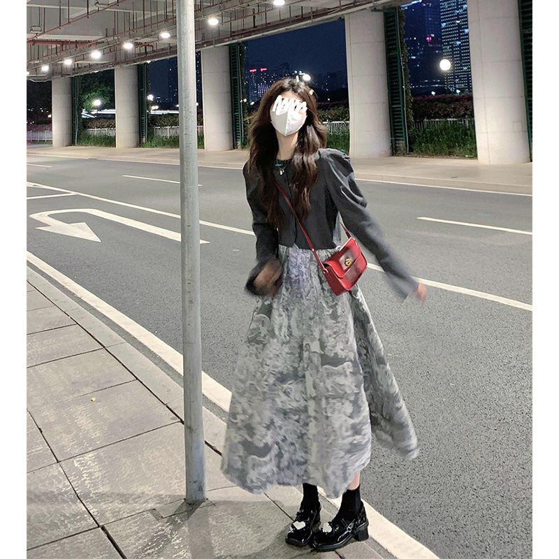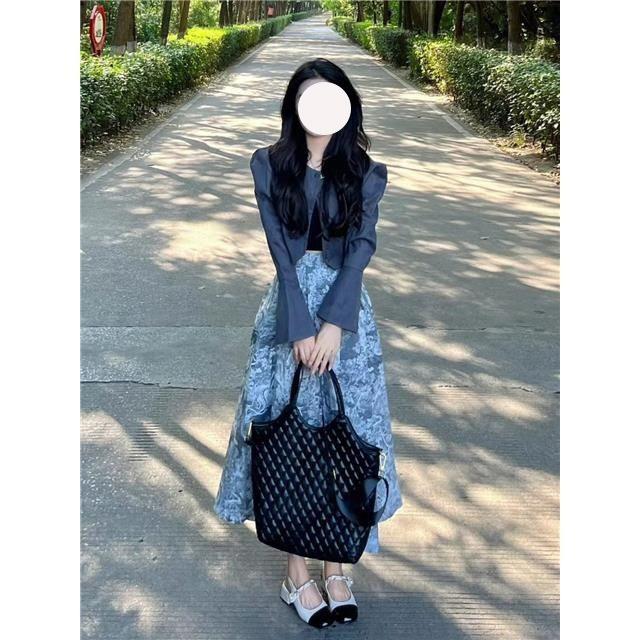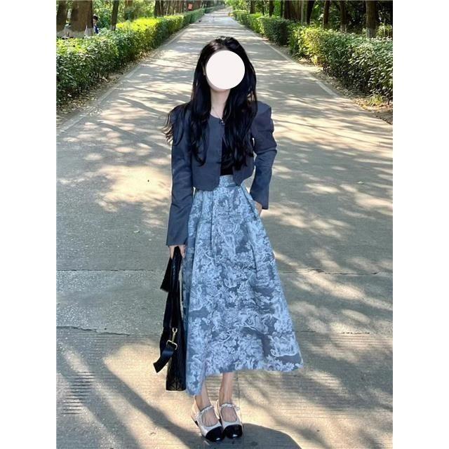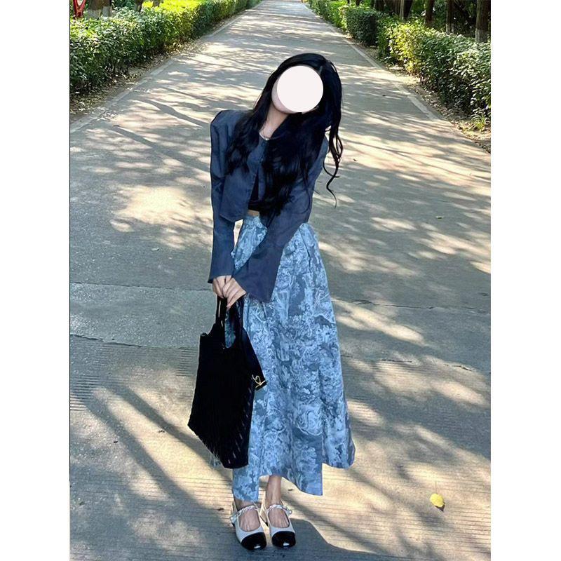 Chaqueta de Moda Estilo Corto Manga Larga Primavera 2025 Nuevo Elegante Falda Floral Traje de Dos Piezas para Mujer Ins