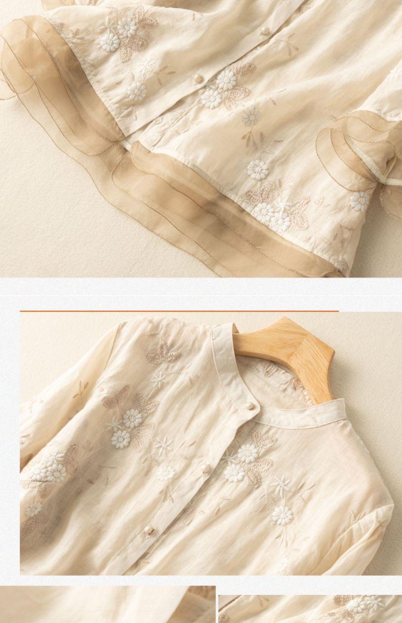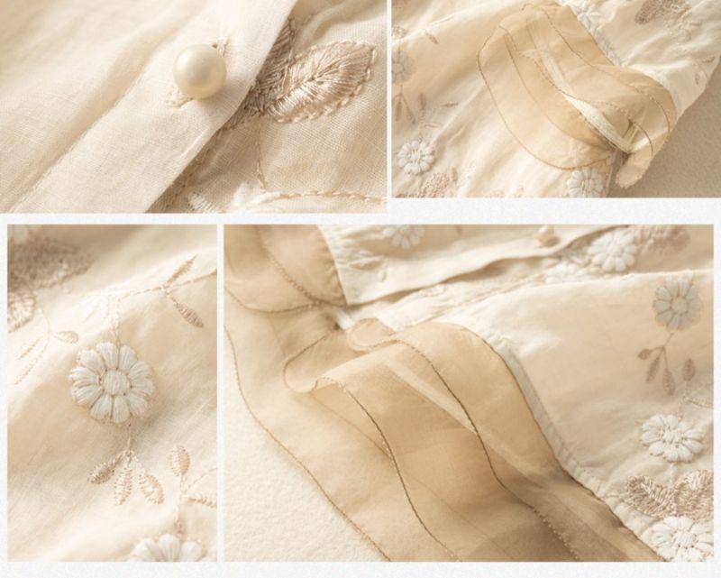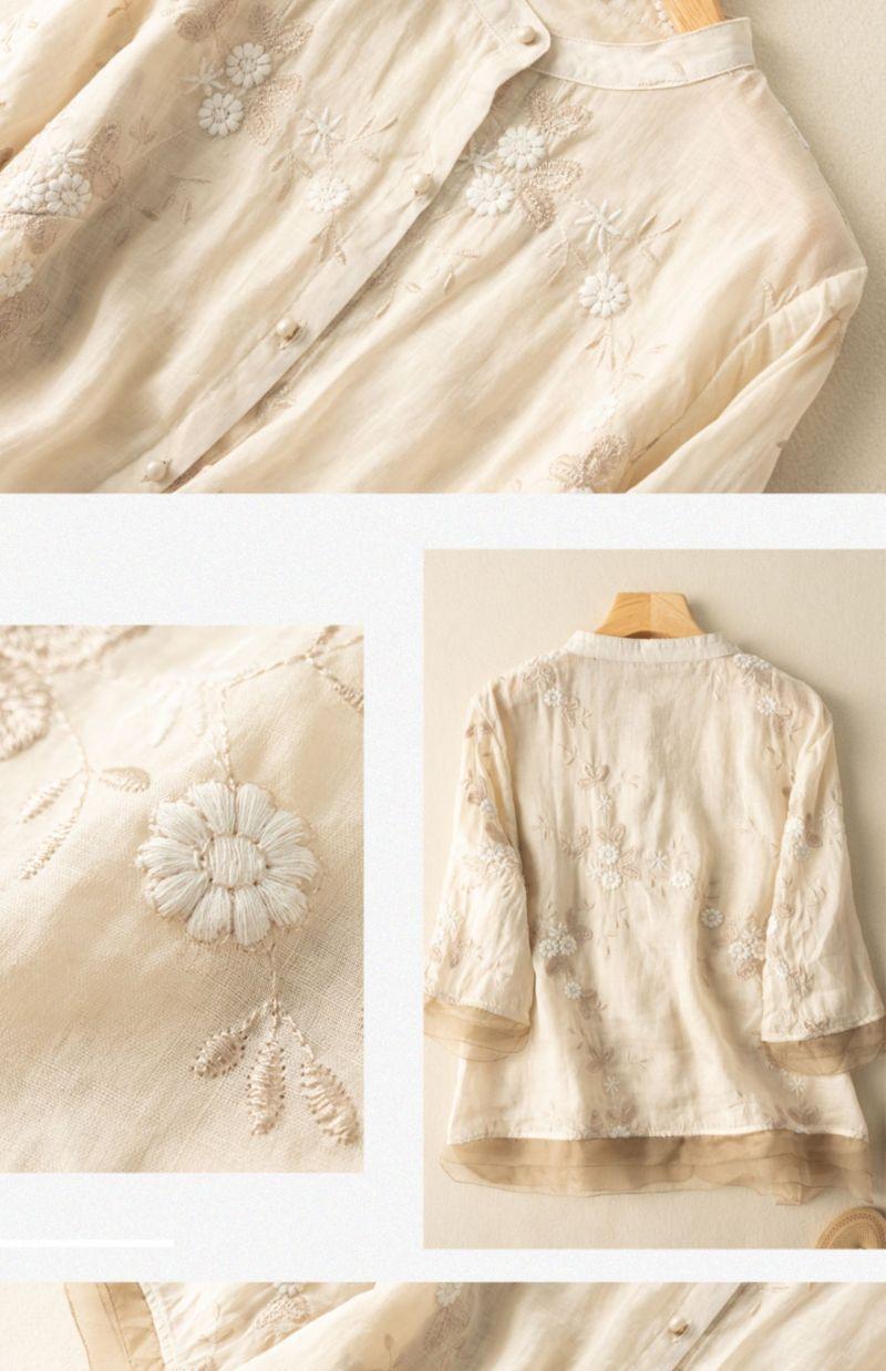 Top Bordado Pesado para Mujer Manga Tres Cuartos Algodón y Lino Empalmado Camisa para Mujer Estilo Literario Retro Nuevo