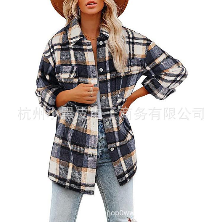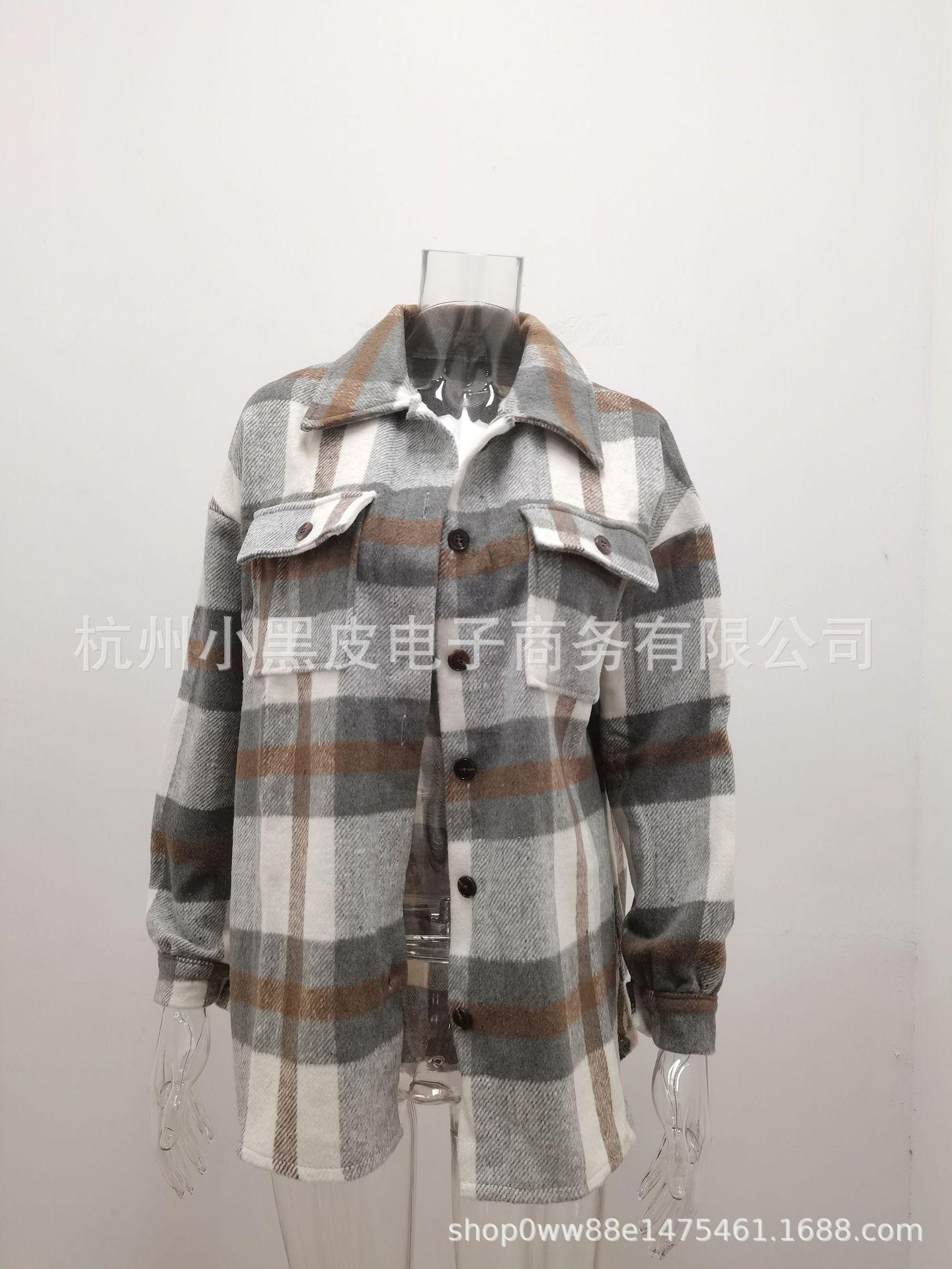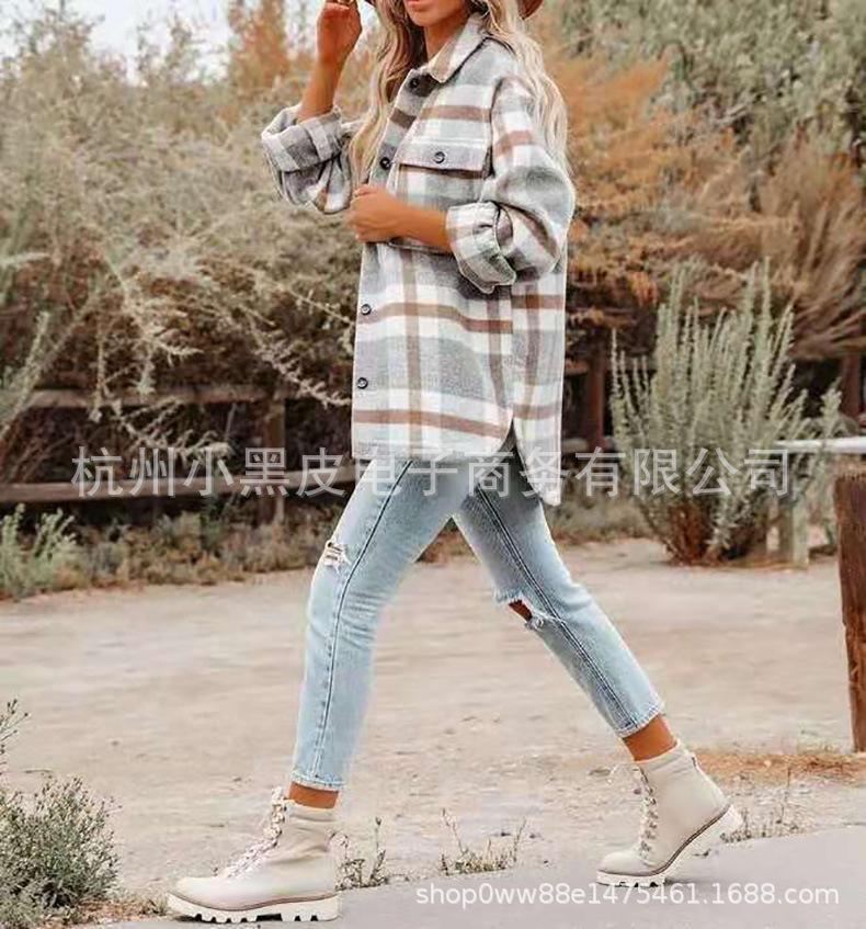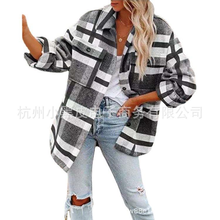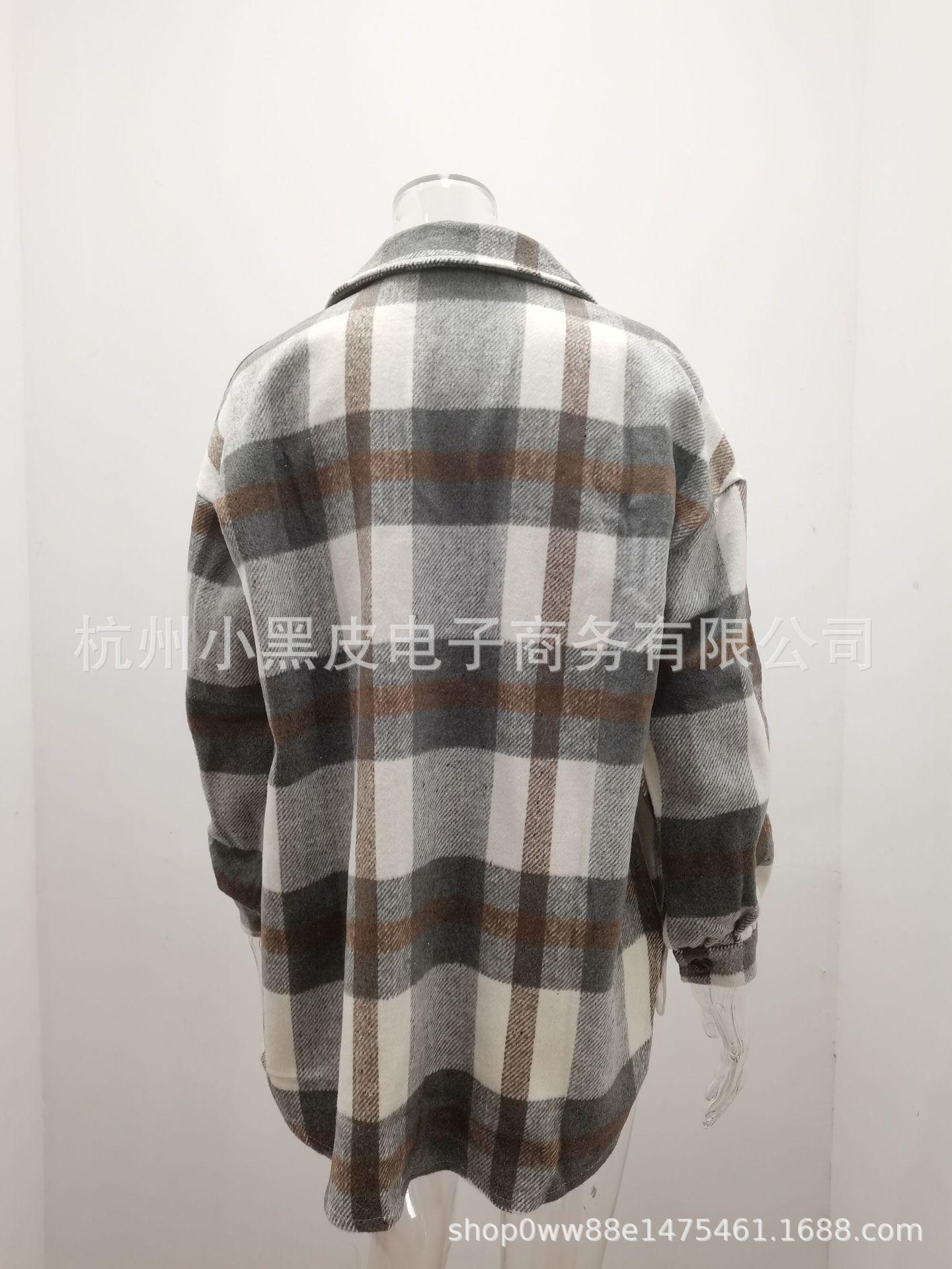 Nueva ropa de otoño e invierno para mujer europea y americana, abrigo de lana gruesa con diseño de cuadros sueltos y solapa de manga larga para otoño e invierno.