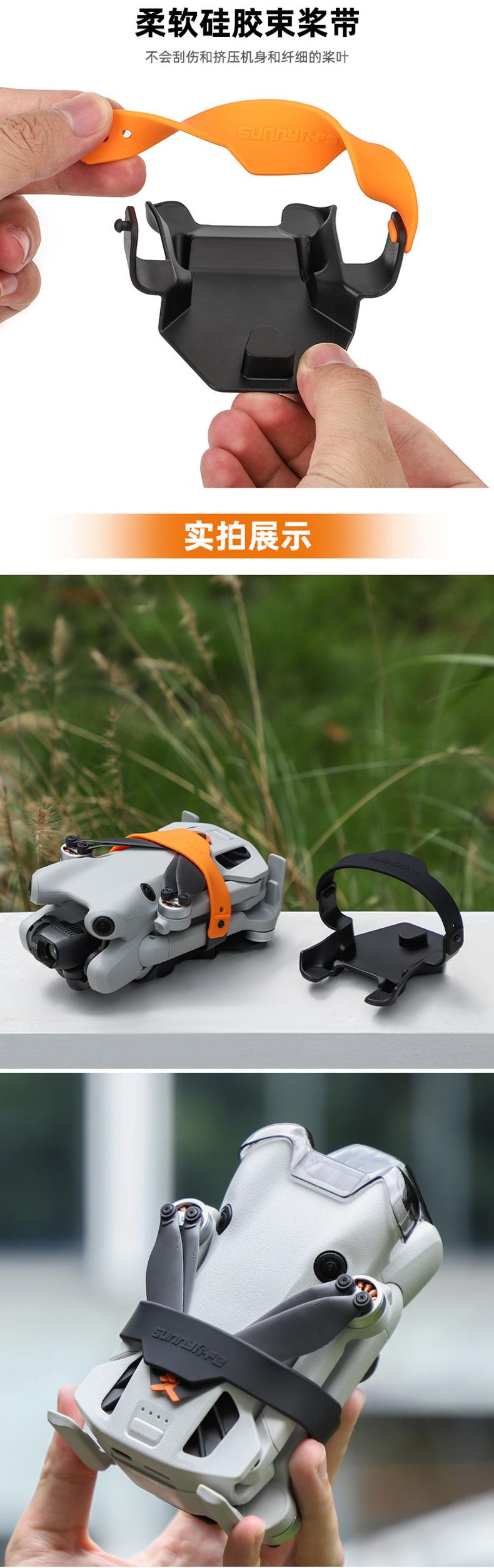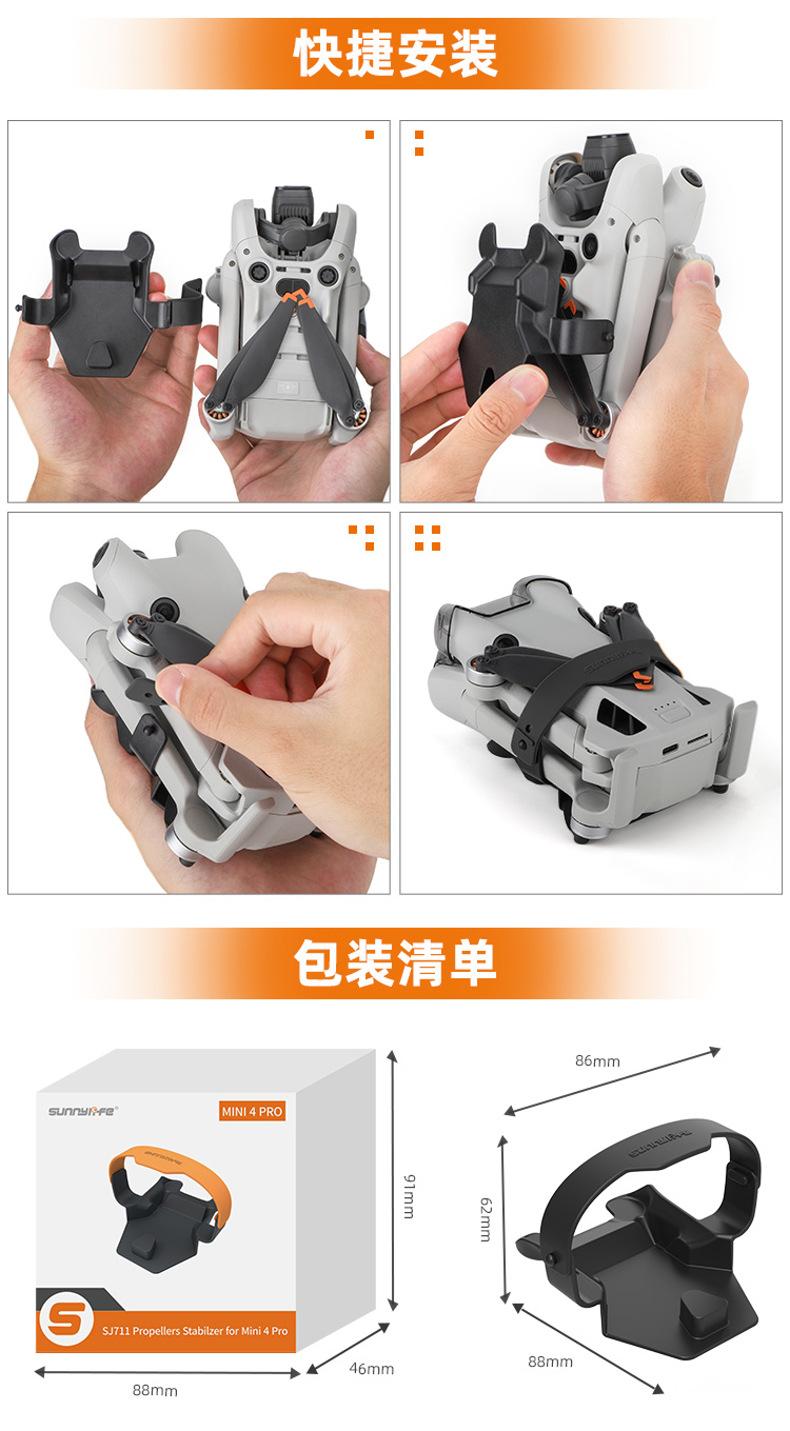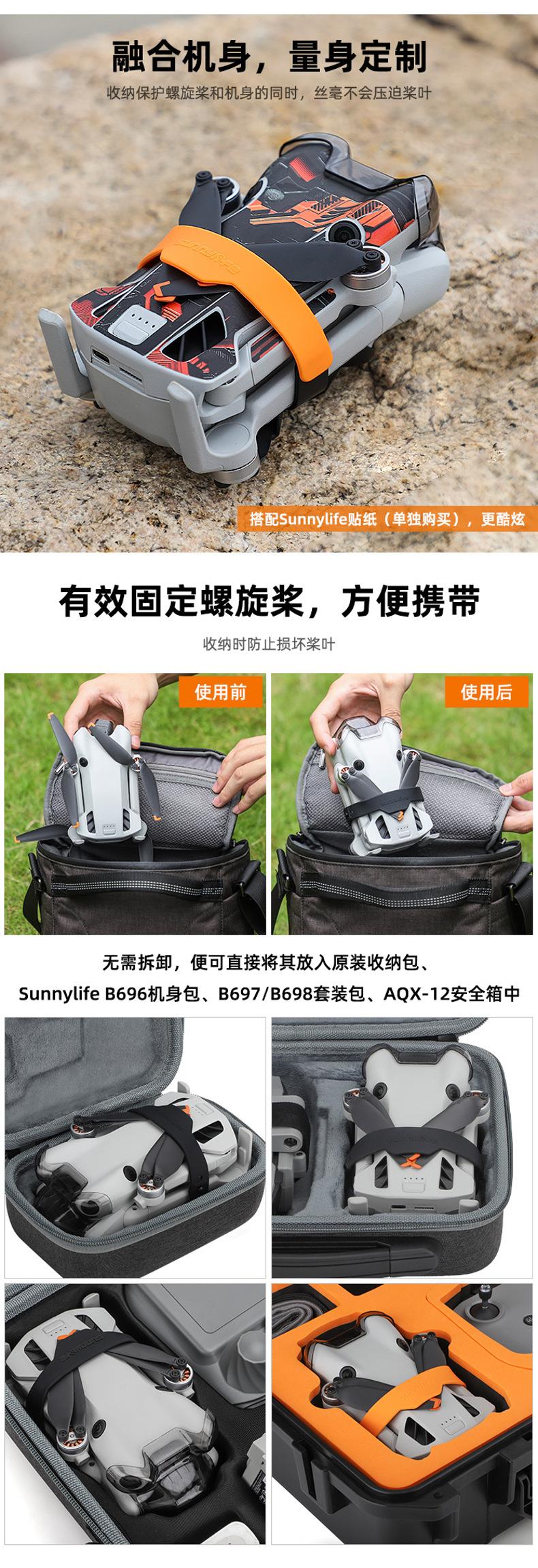 Las hélices se pueden fijar eficazmente sin retirarlas y se pueden colocar directamente en la bolsa de almacenamiento original, la bolsa Sunnylife B696, la bolsa del set B697/B698 o la caja de seguridad AQX-12.