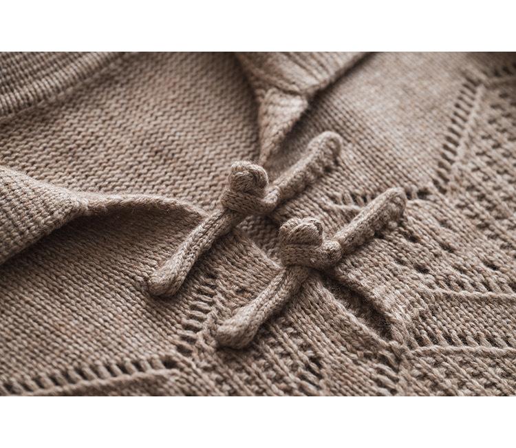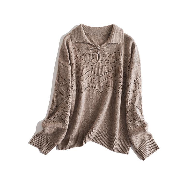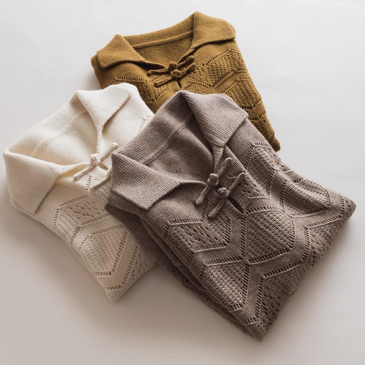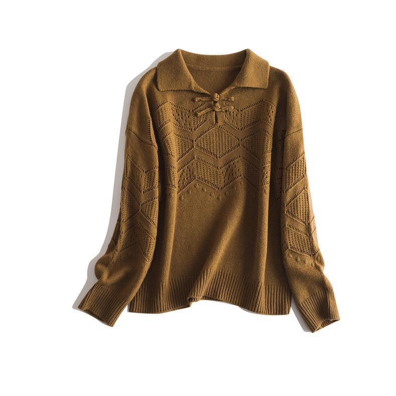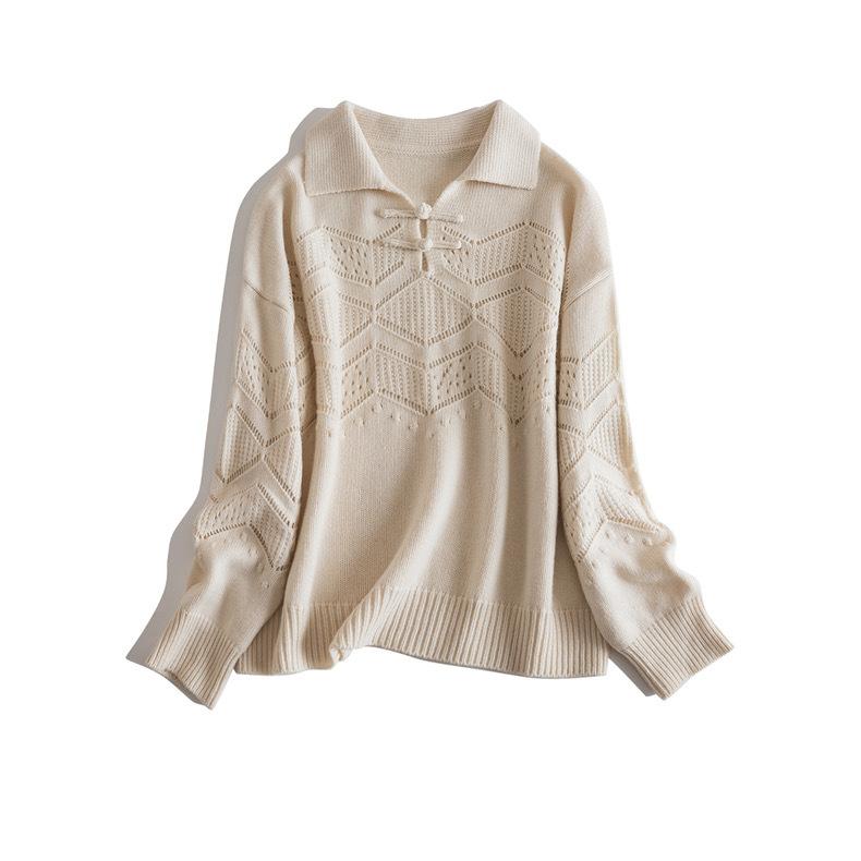 Suéter suéter de manga larga con solapa de hebilla de estilo nacional retro de estilo chino nuevo, 70% lana, tejido a ganchillo calado, temperamento suave