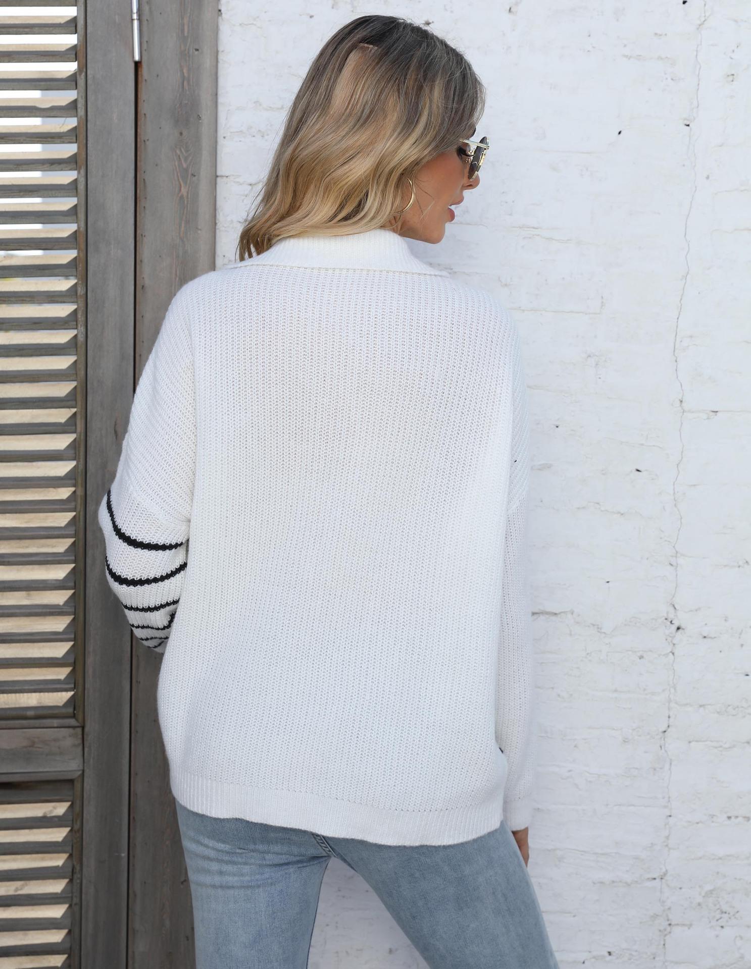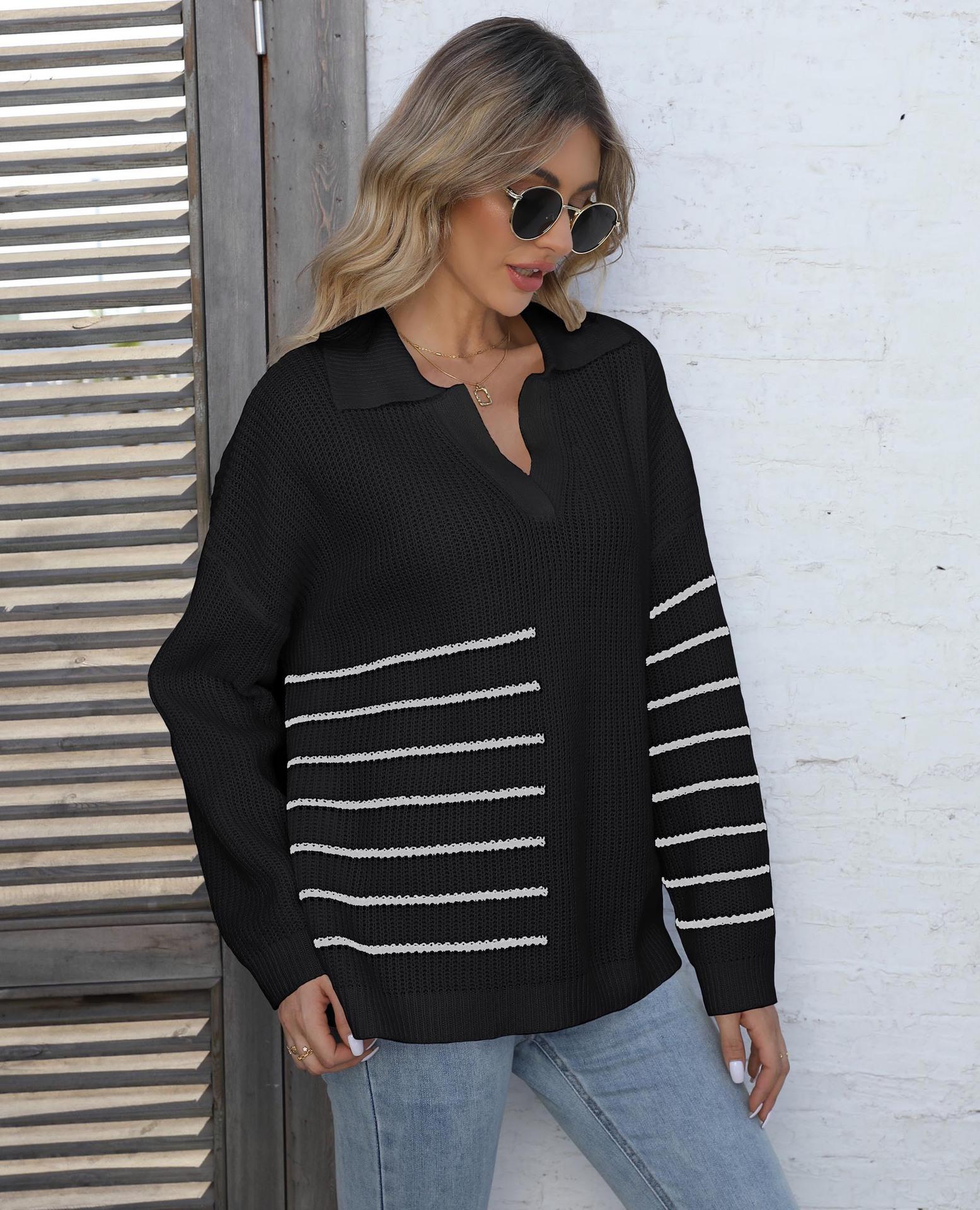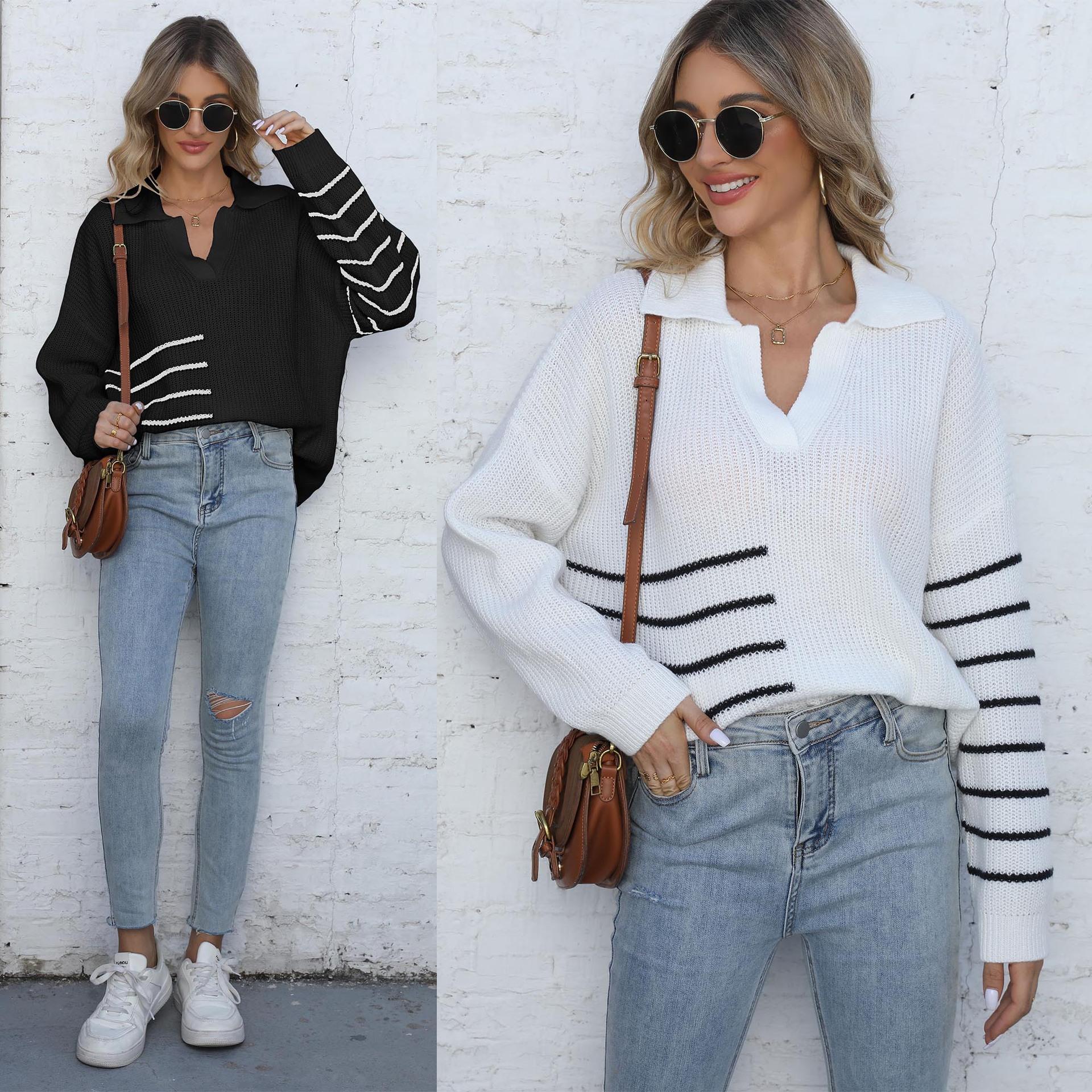 Suéter tejido para mujer, suéter transfronterizo europeo y americano para mujer, otoño e invierno, nuevo suéter de cuello polo a rayas con costuras de color en contraste M627
