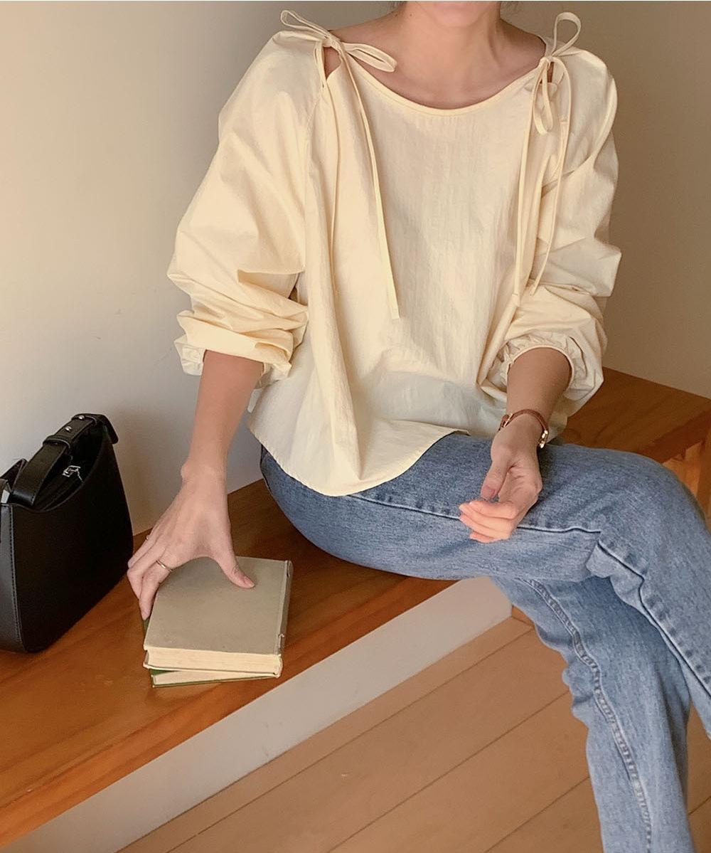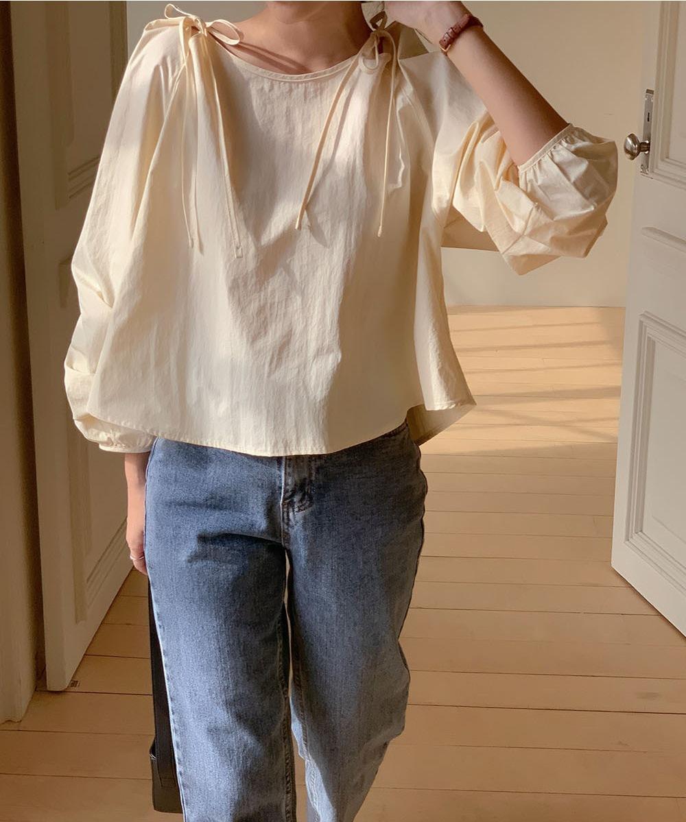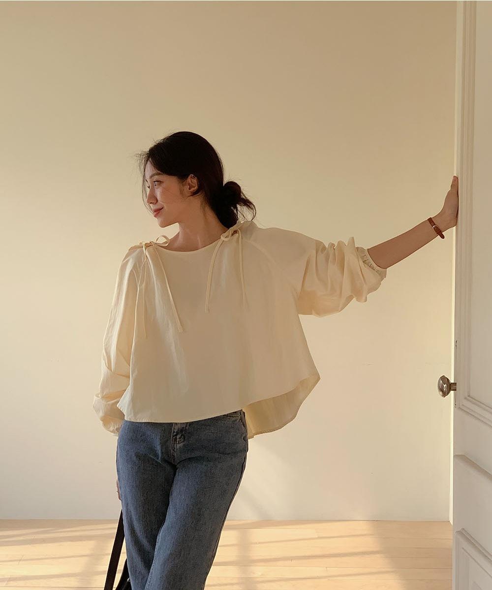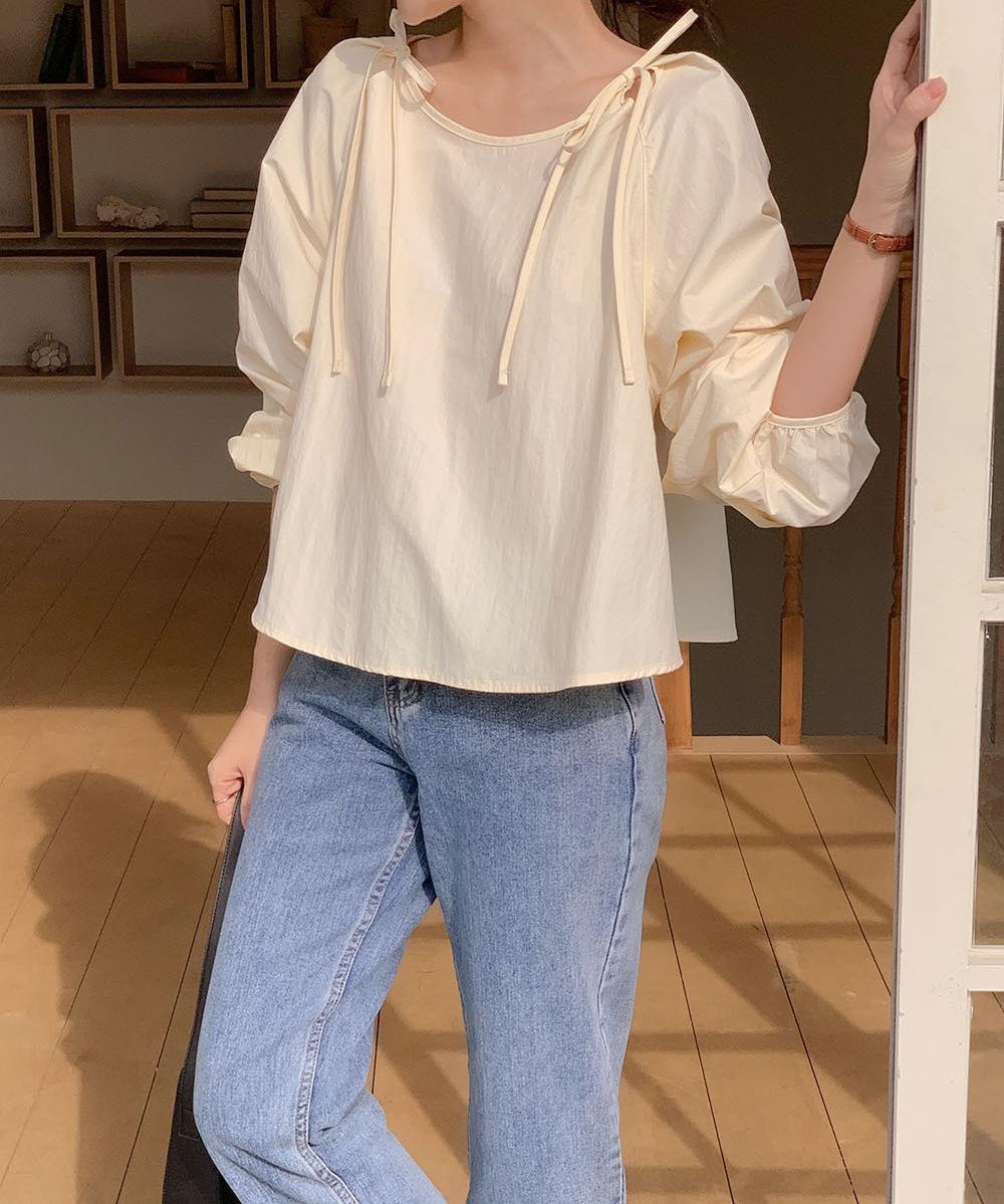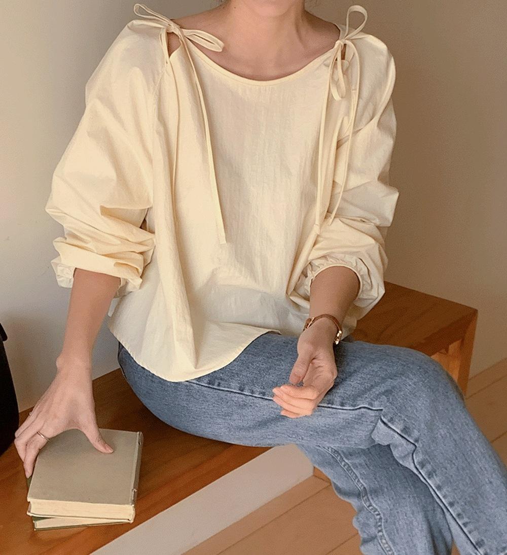Camisa holgada con protección solar y mangas con lazo en los hombros, estilo coreano chic de primavera y estilo fresco.
